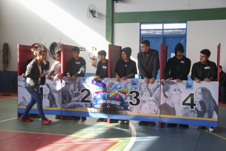 O ginásio da Escola Municipal Santuário, no Bairro Pedreira, ficou mais colorido na manhã dessa terça-feira, 1º, com o primeiro encontro do Palco do Saber neste ano. Na plateia, estudantes, professores, direção e convidados acompanharam a rodada de perguntas e respostas. No total, cinco duplas participaram da disputa. Ao final, Hyumy Lopes Rodrigues, 14 anos, e Taciano Eduardo Maus Pereira, 15, foram os campeões.