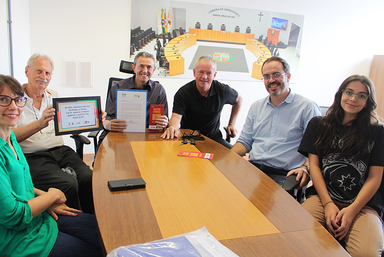 O presidente da Câmara de Vereadores, Gerson Trevisan (PSDB), recebeu a comitiva do bicentenário da Imigração Alemã no Rio Grande do Sul e dos 175 anos em Santa Cruz do Sul. Estiveram presentes o coordenador Paulo Trinks, responsável pela comissão em Santa Cruz do Sul (onde se celebram os 175 anos); o professor Nasário Eliseu Bohnen, integrante da Secretaria de Cultura; Rafael Gessinger, coordenador estadual da programação, e Cristiana Mueller, coordenadora da Assessoria Internacional na Unisc.