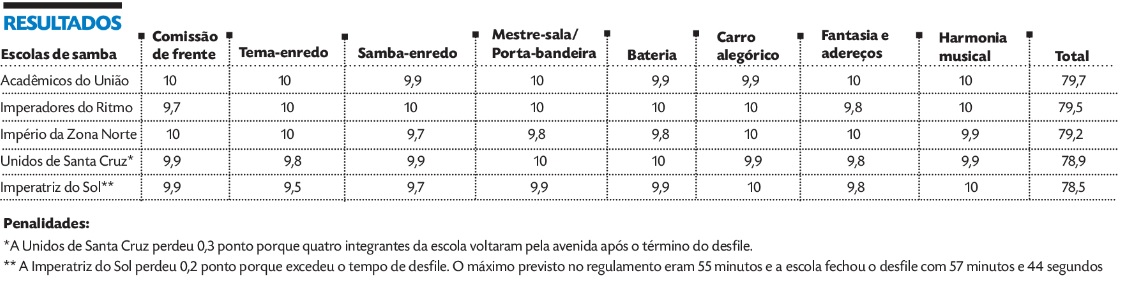 Por volta das 19h10 desse domingo, 18, os integrantes da escola de samba Acadêmicos do União fizeram ecoar, repetidamente, o grito de “É campeã” no Pavilhão Central do Parque da Oktoberfest. A comemoração ocorreu após a divulgação do resultado da apuração dos votos do desfile competitivo realizado no sábado, na Marechal Floriano. O União foi nota dez em cinco dos oito quesitos avaliados pelos jurados (comissão de frente, tema-enredo, mestre-sala e porta-bandeira, fantasia e adereços e harmonia musical) e somou 79,7 pontos – dois décimos a mais do que o segundo colocado, a Imperadores do Ritmo.