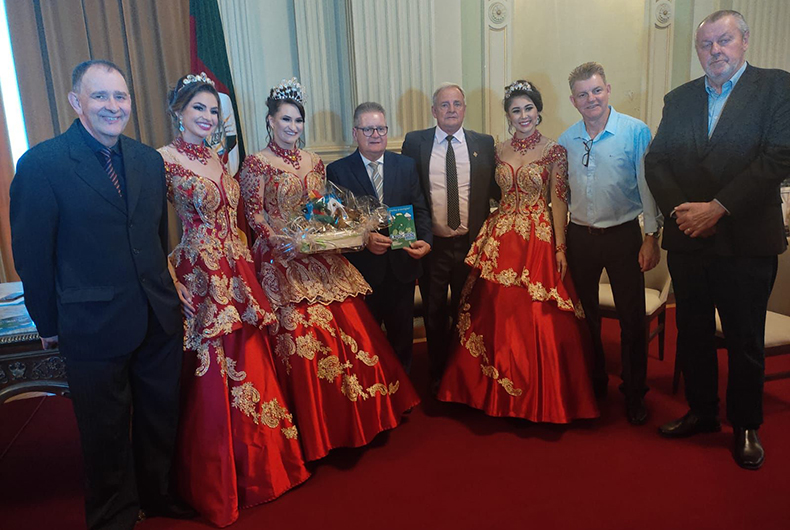 Uma comitiva da 10ª Exposição Industrial, Comercial, Serviços e Agronegócios de Candelária (Expocande) esteve visitando a capital do Estado nesta terça-feira,19. Integrado pelo prefeito de Candelária, Nestor Ellwanger, o Rim; pelo vice-prefeito, Cristiano Pinto Becker; pelo presidente da 10ª Expocande, Jorge Luiz Mallmann; e pelas soberanas do município – rainha Marina Fernanda Aggens e princesas, Gabriele Renata Bredow e Priscila Ellwanger dos Santos Moraes -, o grupo foi recebido pelo governador do Estado, Ranolfo Vieira Junior, no Palácio Piratini.