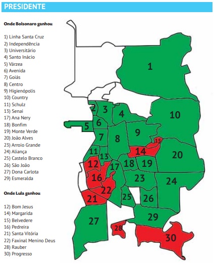 O mapa da votação revela que o petista teve mais apoio nas zonas mais vulneráveis do município, enquanto Bolsonaro venceu em toda a Zona Norte e no Centro, além de alguns pontos da Zona Sul. Em regiões como Goiás, Santo Inácio, Higienópolis, Várzea e Linha Santa Cruz, as vitórias do candidato do PL foram mais folgadas, enquanto na Zona Sul, em bairros como Ana Nery, Bonfim e Dona Carlota, foram mais apertadas. Bolsonaro teve 43.348 votos (52,01%), 1.451 a menos do que no primeiro turno de 2018, quando alcançou 55,82% dos votos válidos.