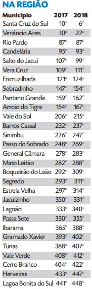 No Vale do Rio Pardo, apenas cinco dos 29 municípios avançaram no PIB, enquanto 23 tiveram queda e um manteve a mesma posição de 2017. Lagoa Bonita do Sul, no Centro-Serra, manteve-se como o menor PIB da região: ficou em 448º lugar entre os 497 municípios gaúchos. Gramado Xavier, Tunas, Vale Verde, Cerro Branco e Herveiras também estão entre os 100 menores PIBs do Estado.