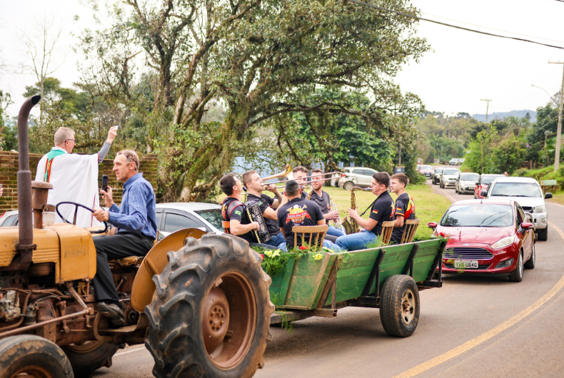 O momento religioso foi realizado na Igreja Nossa Senhora Auxiliadora e promovido pela Sociedade de Canto Cruzeiro do Sul, que completa 97 anos em novembro e se prepara para comemorar o centenário em 2027. A celebração foi marcada por falas de religiosos intercaladas com canções interpretadas pelo coral Cruzeiro do Sul, do próprio distrito, formado por 22 homens. Puxada por uma bandinha local na carroceria de um trator, a tradicional carreata saiu às 10h45 da igreja.