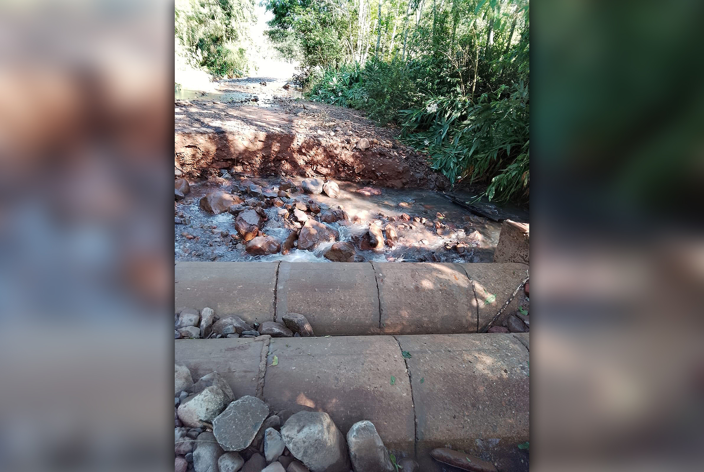 Em alguns pontos da estrada, enxurrada destruiu a pista e deixou a canalização exposta