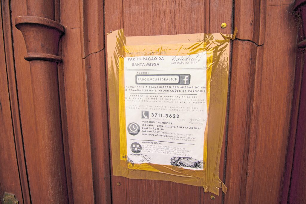 “O nosso decreto municipal permite continuar com as portas abertas durante a semana e aos finais de semana, desde que sejam cumpridos os protocolos de capacidade limitada. Antes a capacidade era de mil e agora é de 120 pessoas”, explica o pároco Rodrigo Eduardo Hillesheim. “Além disso, quem ingressar no templo também precisa usar máscara e álcool em gel, e manter o distanciamento.”