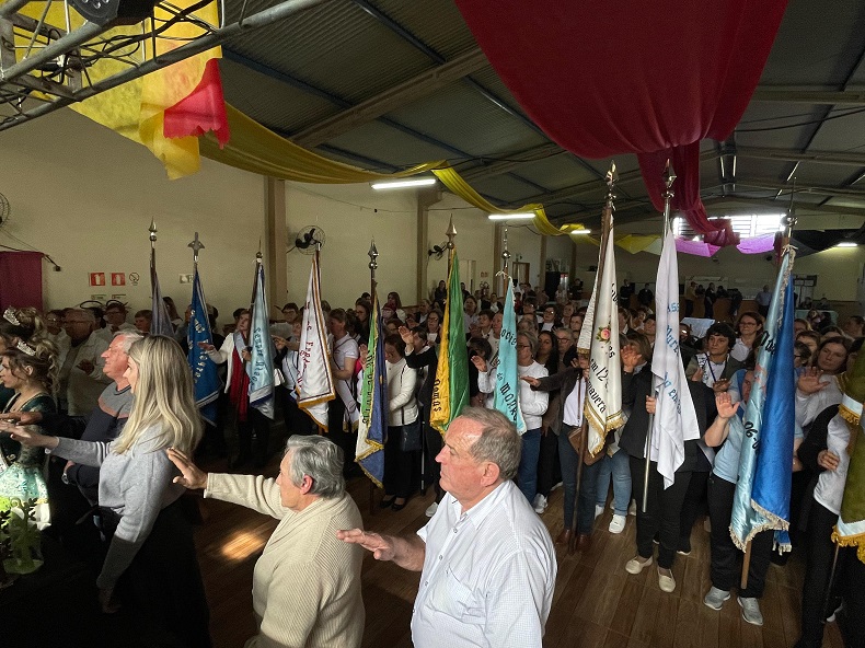 Bandeiras bordadas e coloridas nos mastros levadas à frente dos grupos compostos por mulheres uniformizadas com blusas personalizadas. Esses foram os destaques da solenidade realizada após a chegada de cada grupo recepcionado por uma bandinha alemã no Salão da Comunidade Luterana de Alto Sinimbu, na tarde desse domingo, 20.
