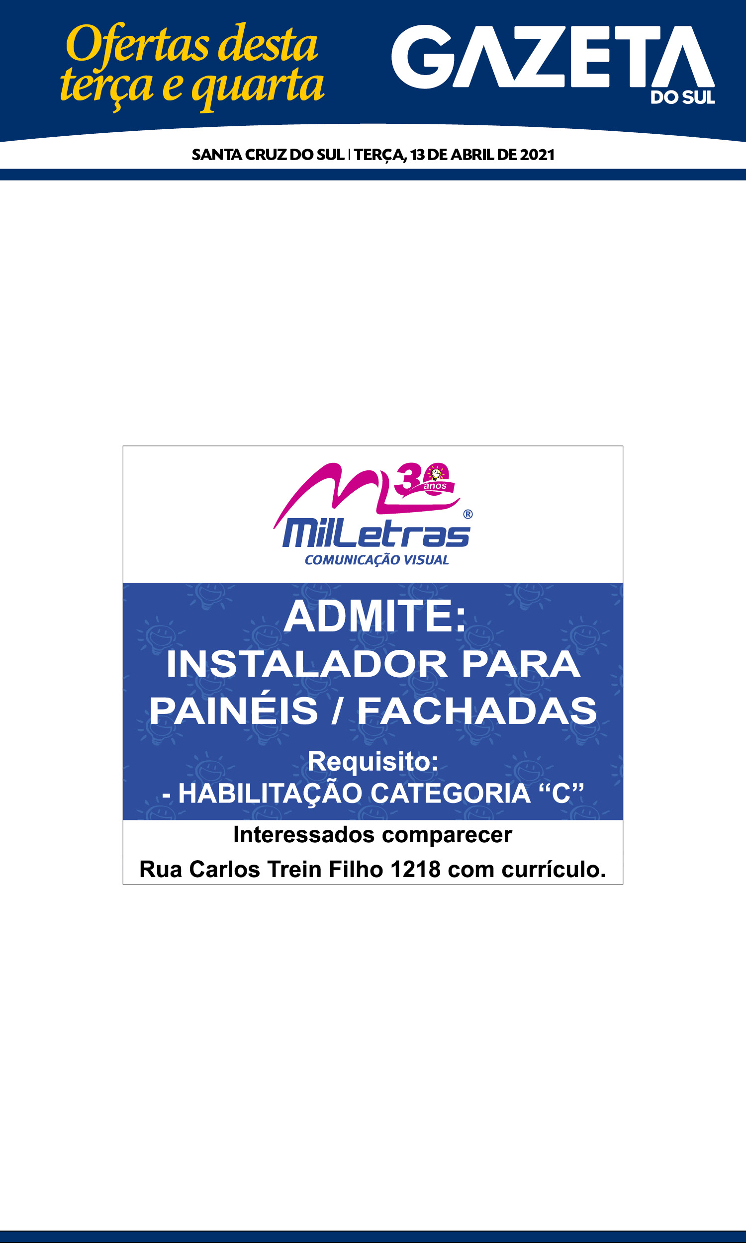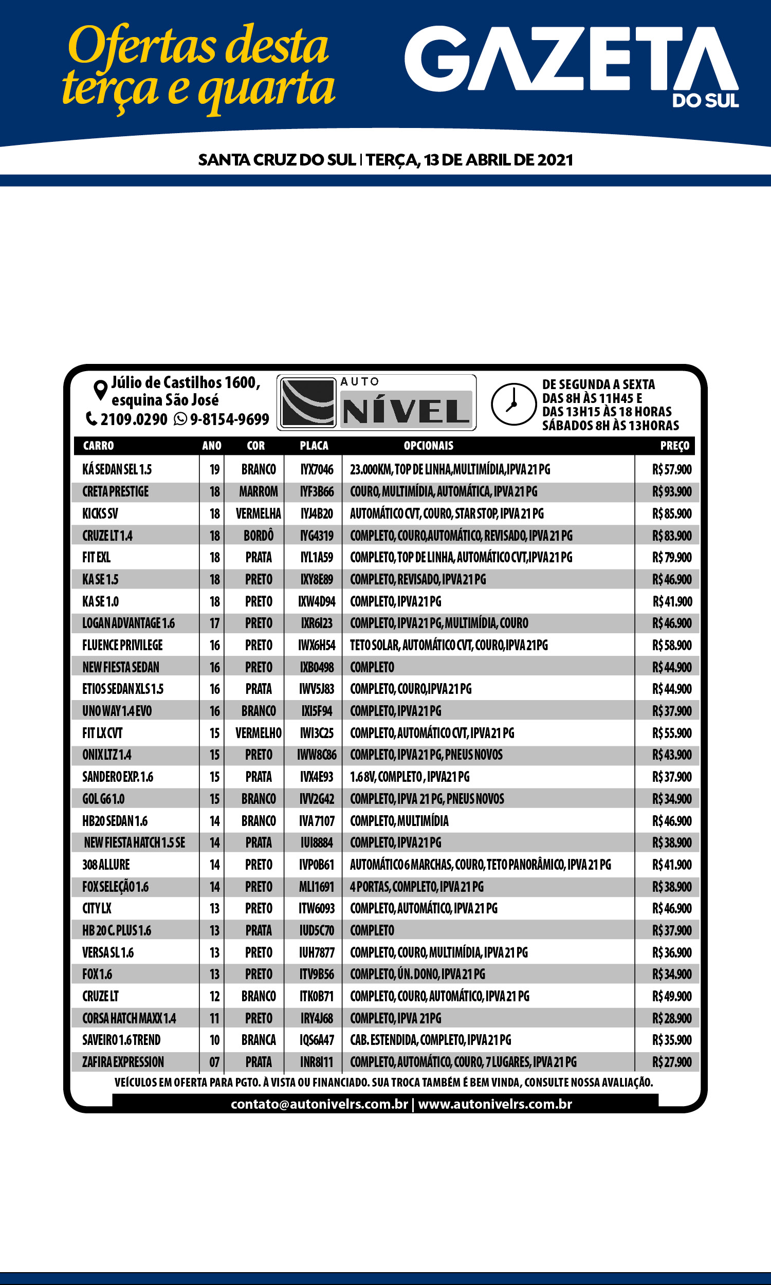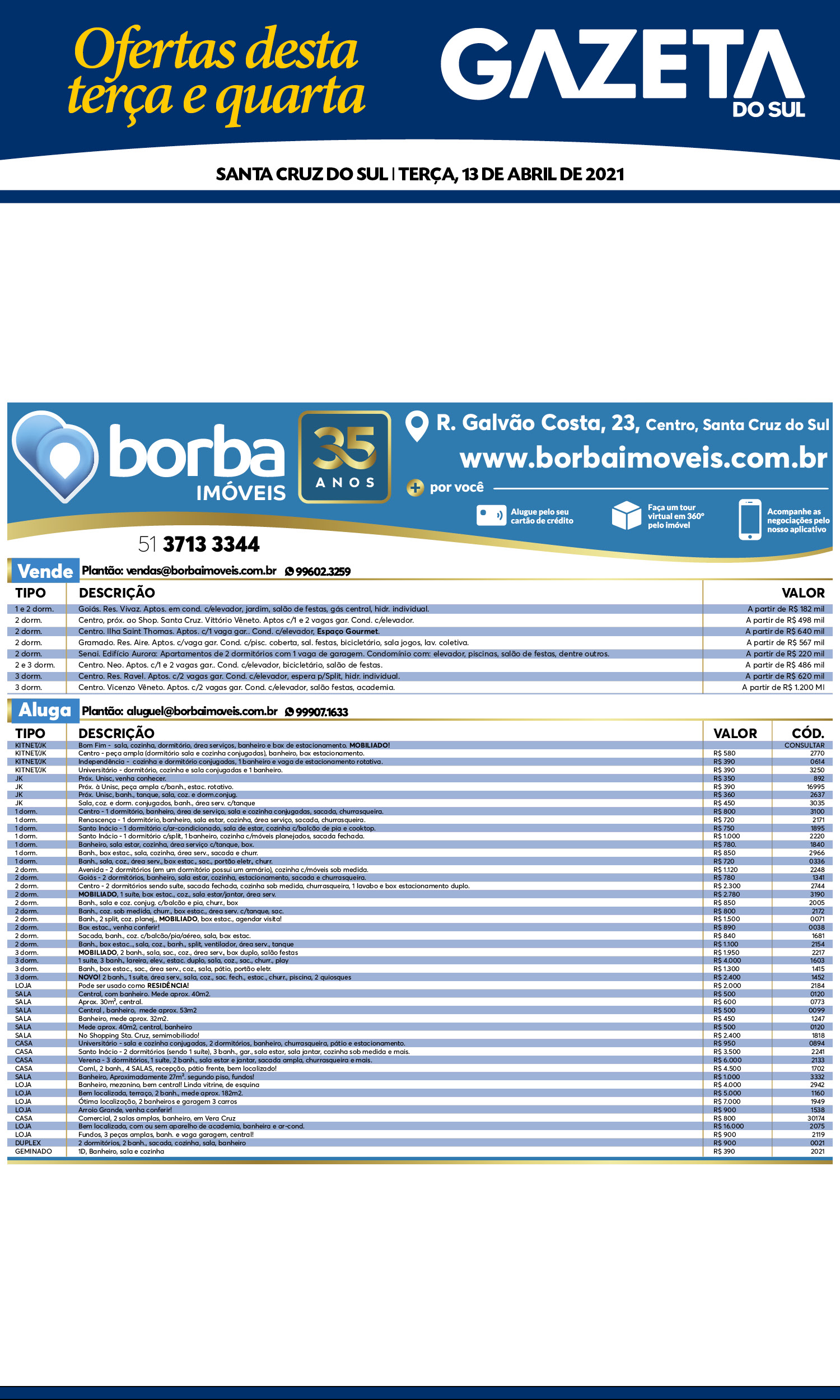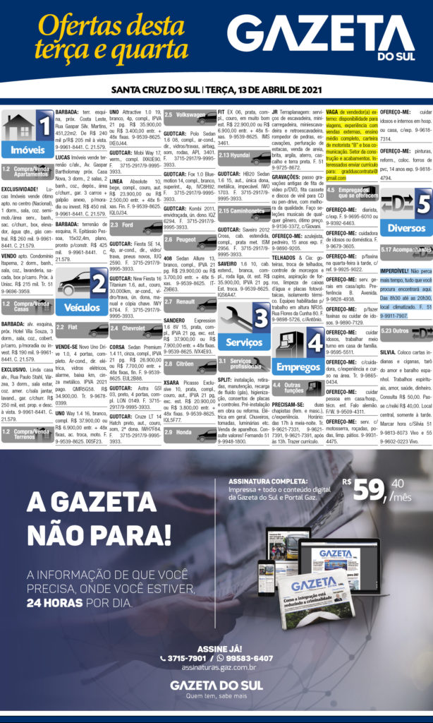 O suplemento de Classificados, que circula nas edições de terças, quintas e sábados, é um dos mais tradicionais da Gazeta do Sul, como vitrine e canal de negócios, de oferta, compra e venda em toda a região central do Rio Grande do Sul. E, para enriquecer pesquisas de produtos e serviços e possibilitar resultado ainda melhor a usuários e parceiros, nos anúncios de clientes cadastrados, o leitor tem acesso direto com link ao site do anunciante, onde poderá verificar mais detalhes sobre os itens. Confira: