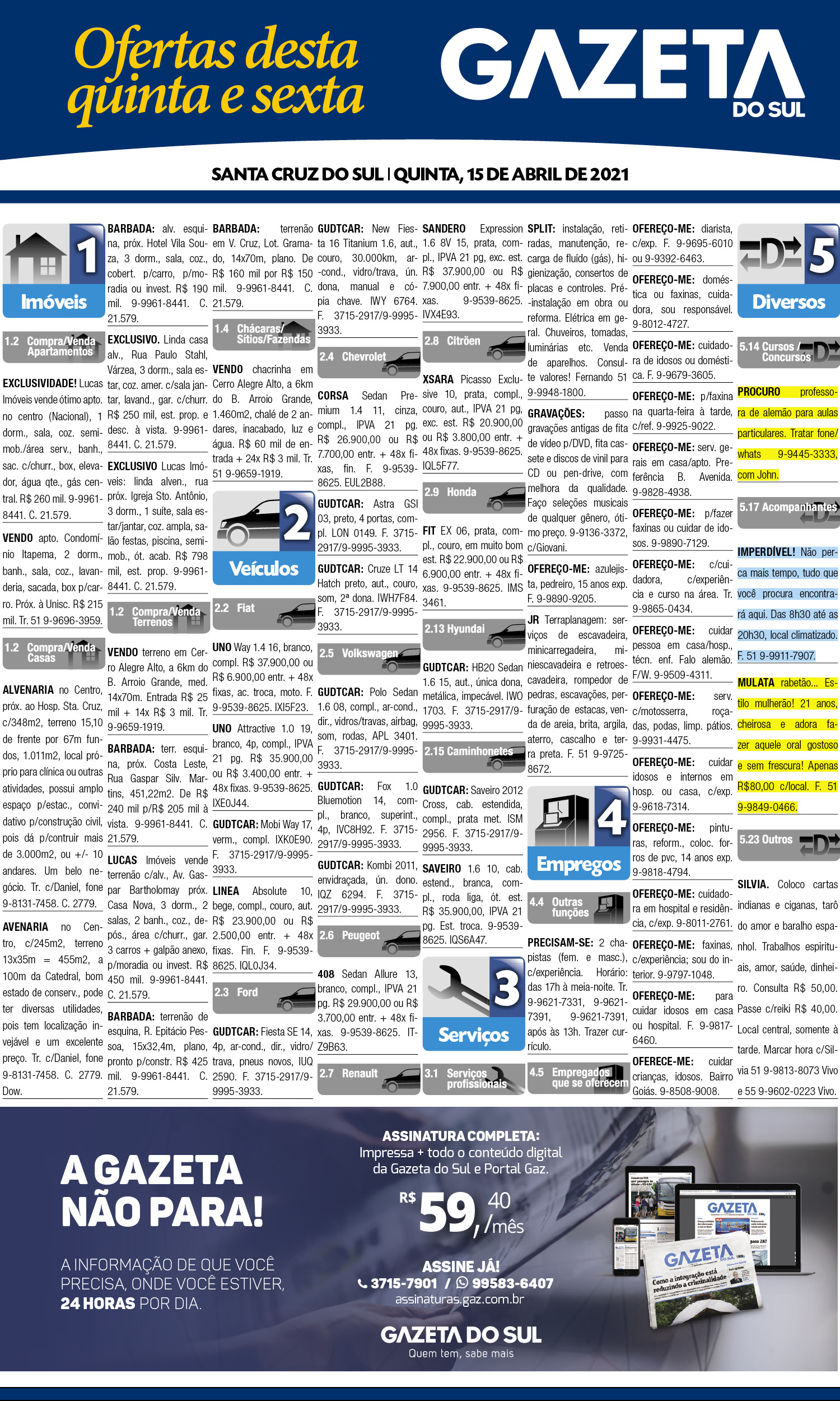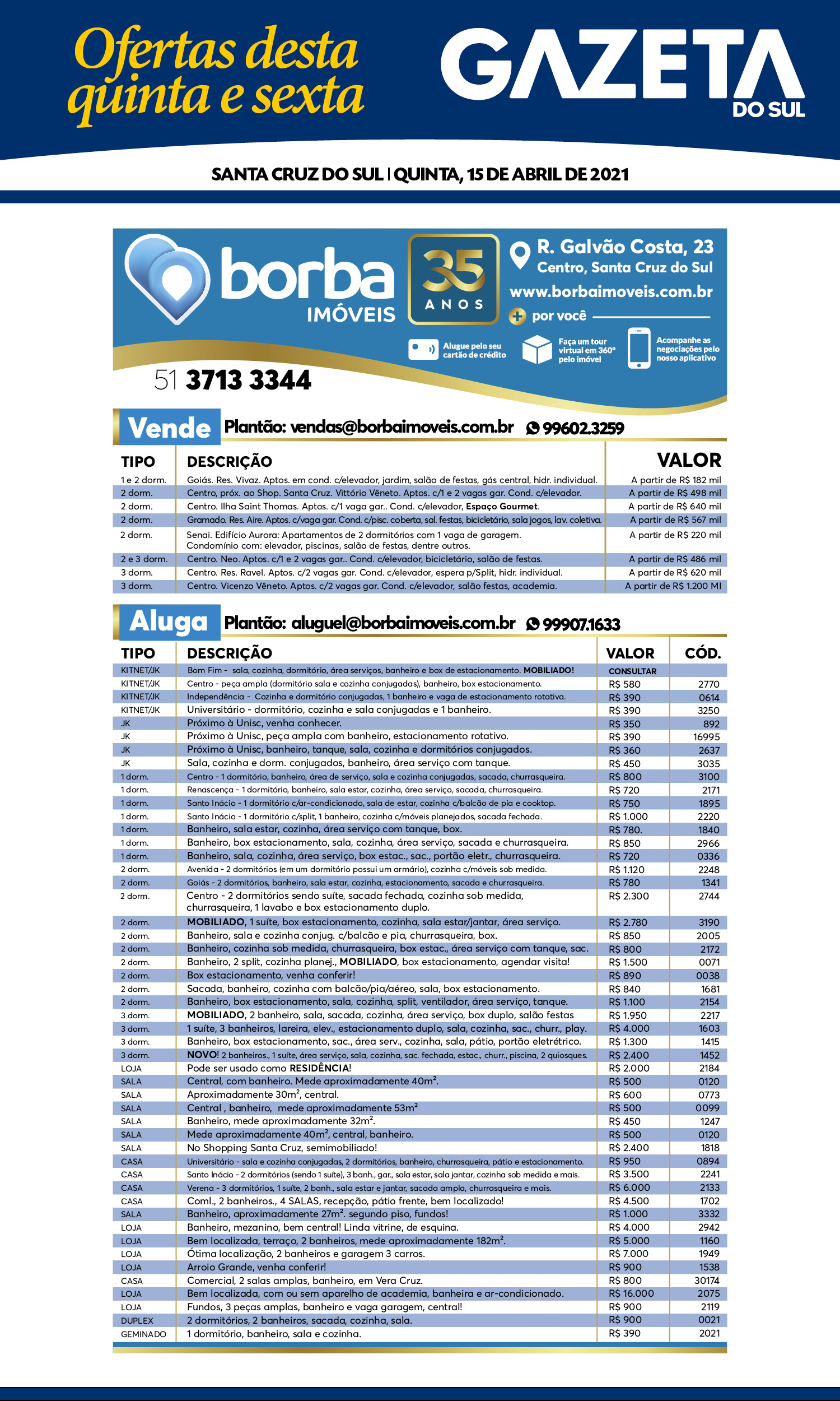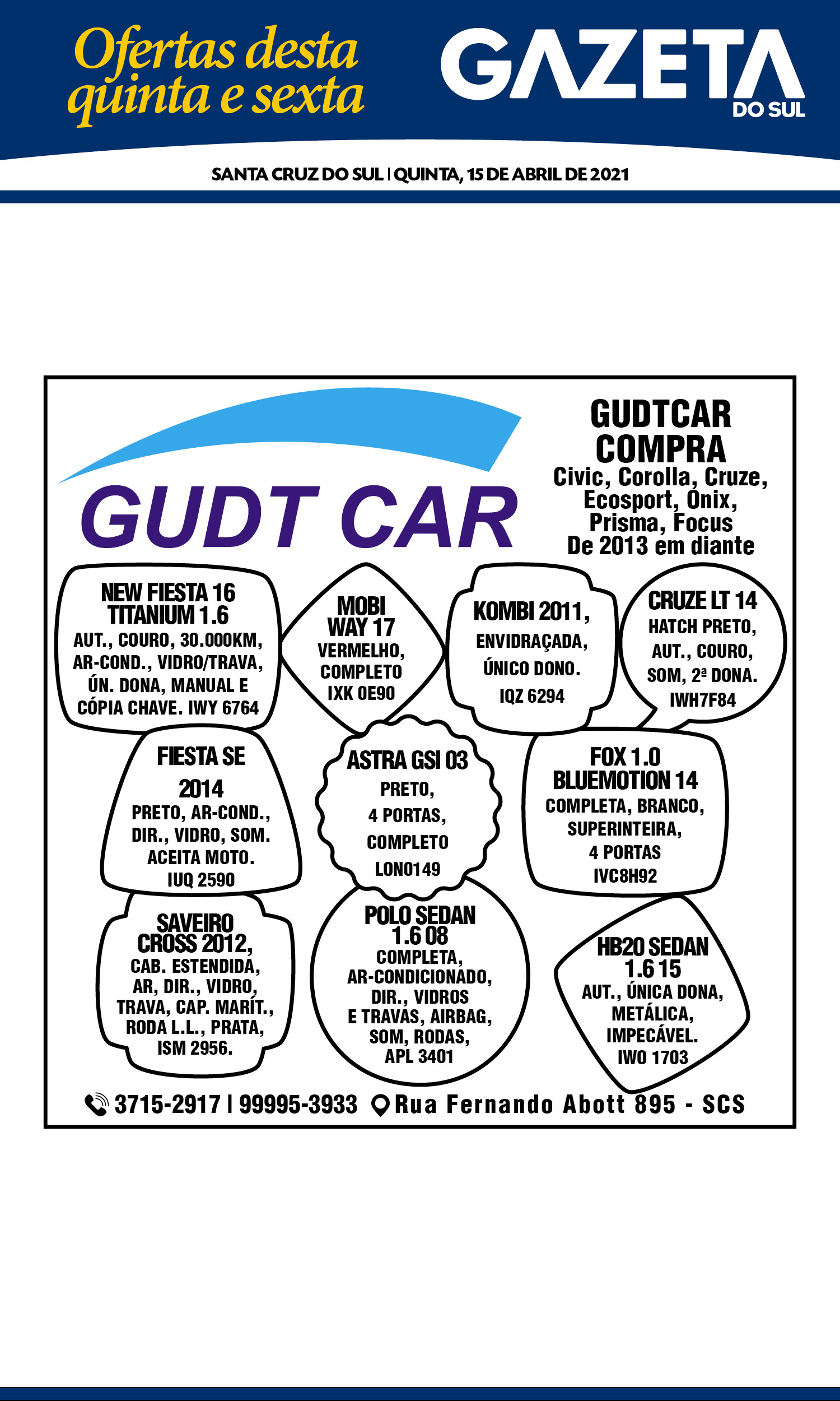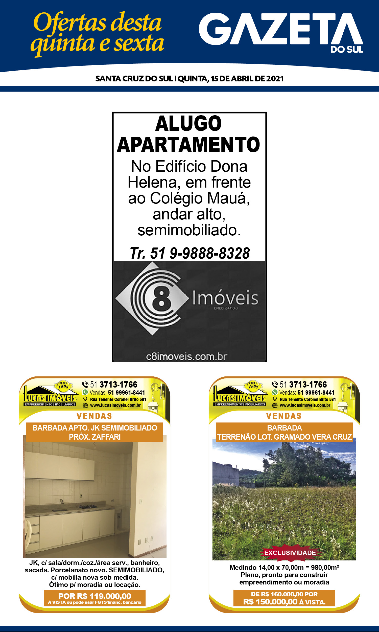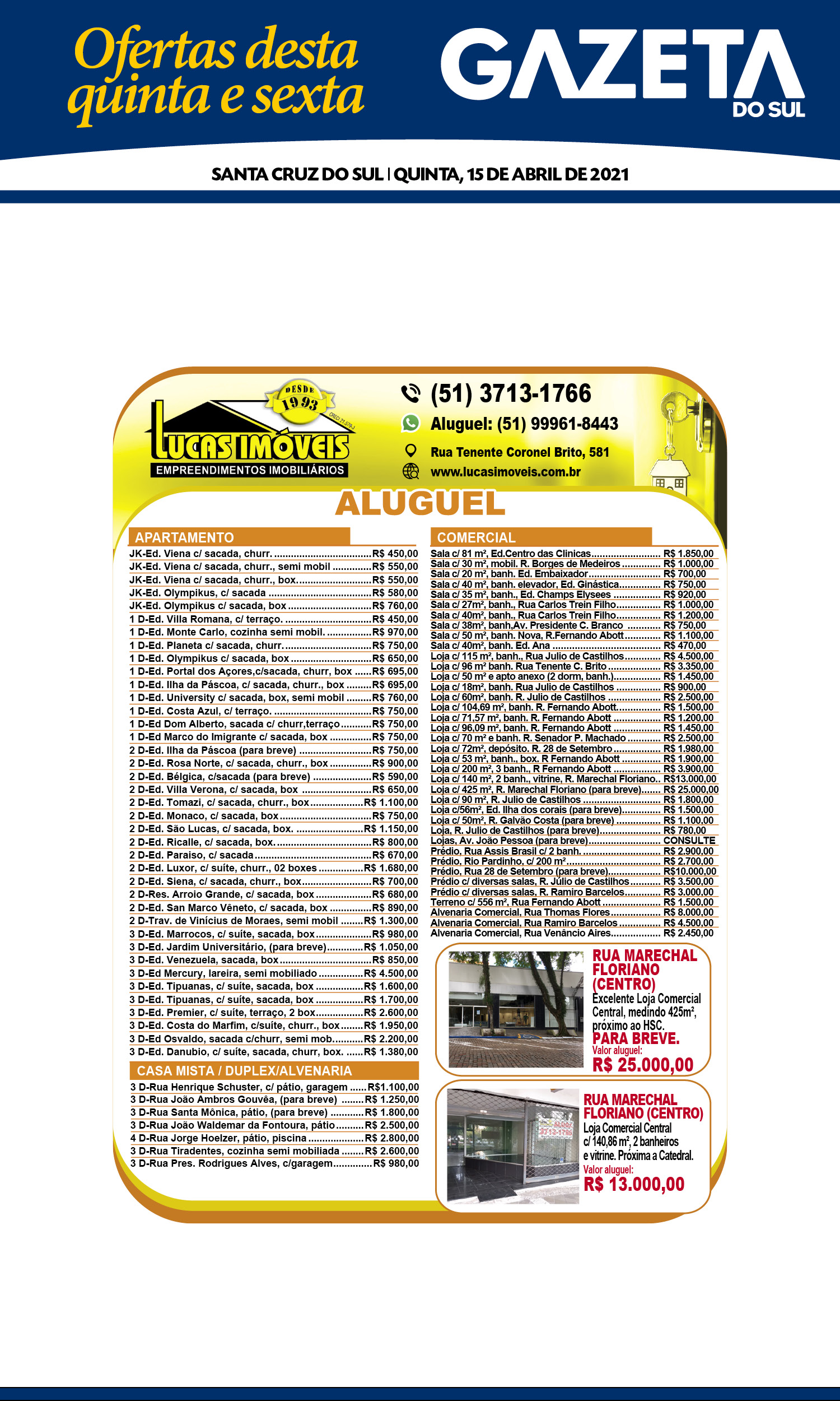 O suplemento de Classificados, que circula nas edições de terças, quintas e sábados, é um dos mais tradicionais da Gazeta do Sul, como vitrine e canal de negócios, de oferta, compra e venda em toda a região central do Rio Grande do Sul. E, para enriquecer pesquisas de produtos e serviços e possibilitar resultado ainda melhor a usuários e parceiros, nos anúncios de clientes cadastrados, o leitor tem acesso direto com link ao site do anunciante, onde poderá verificar mais detalhes sobre os itens. Confira:
