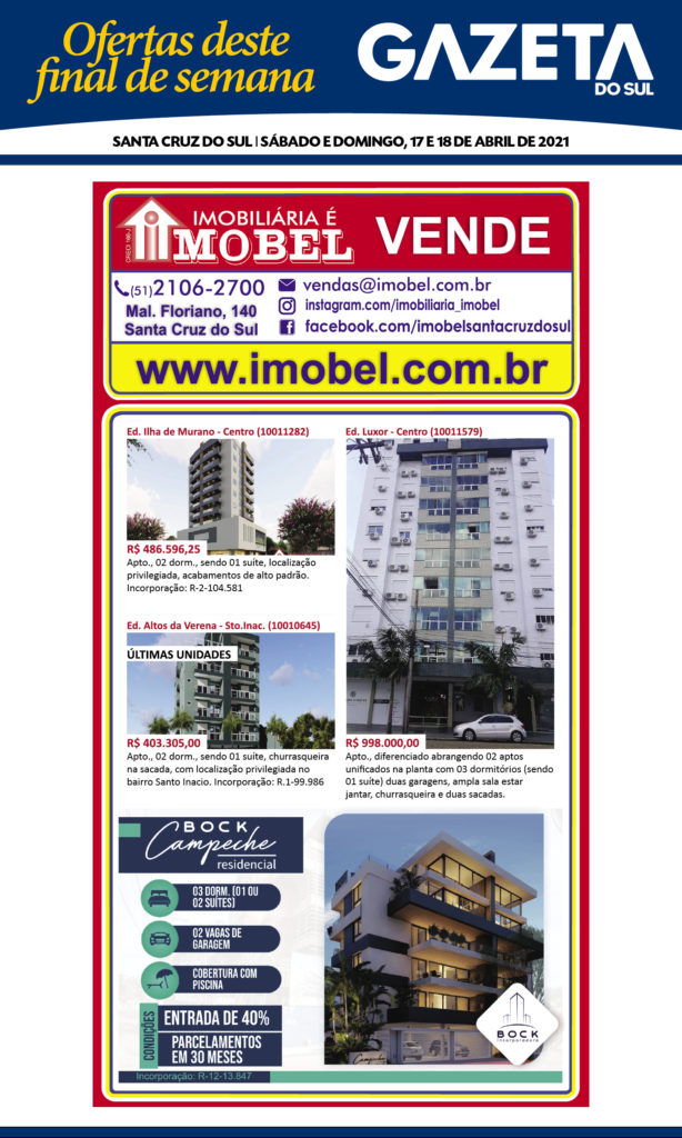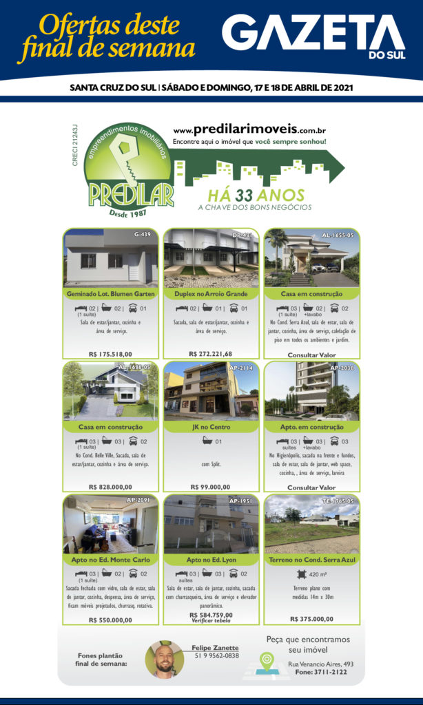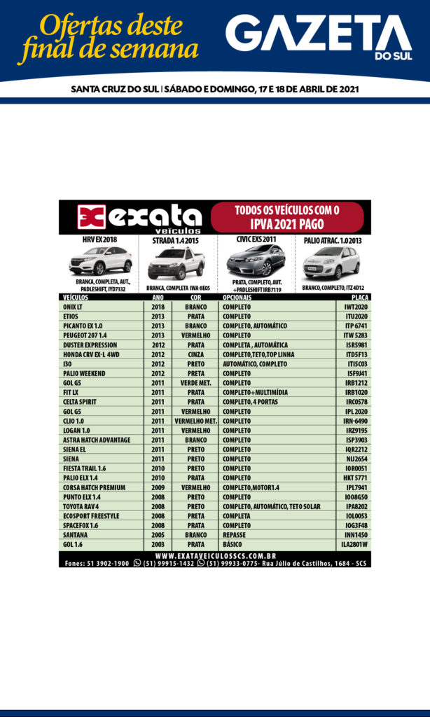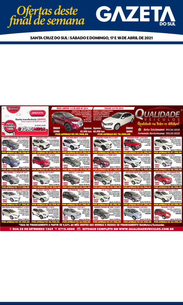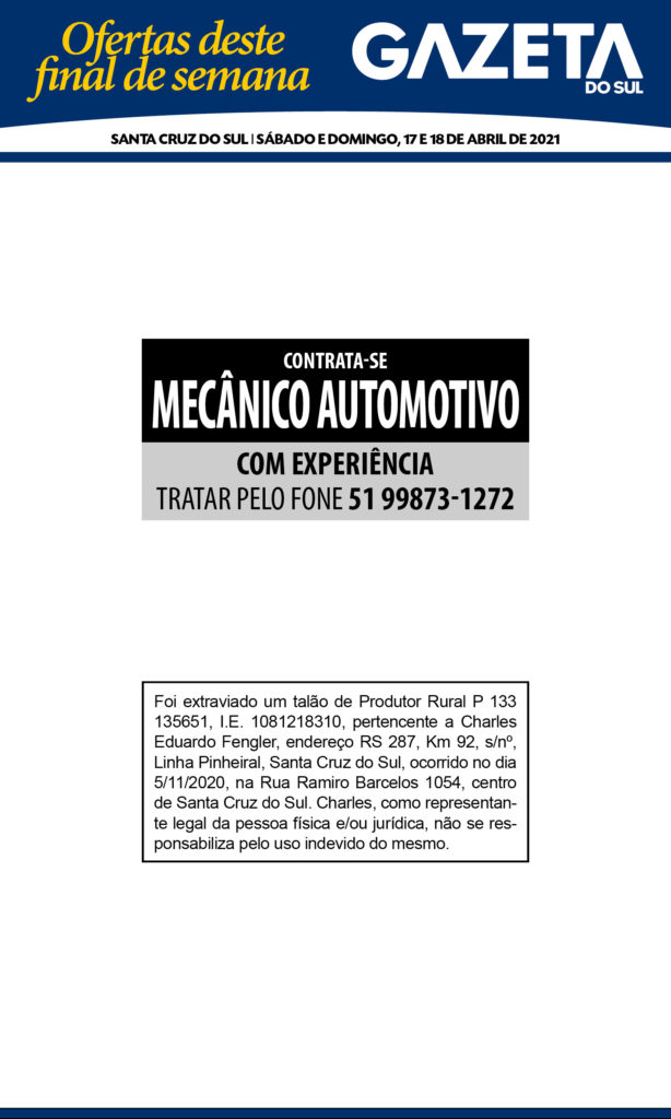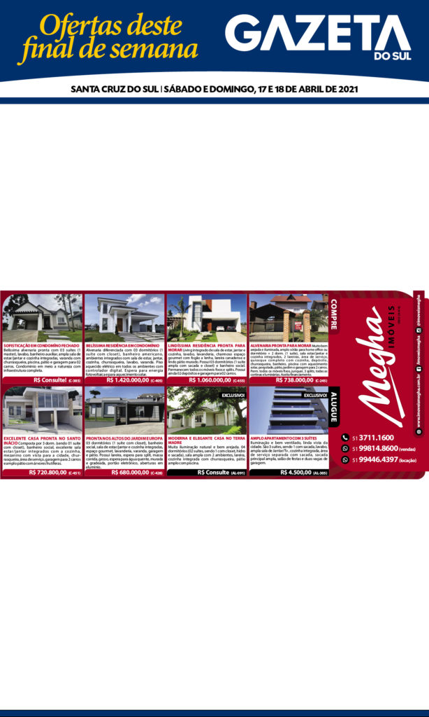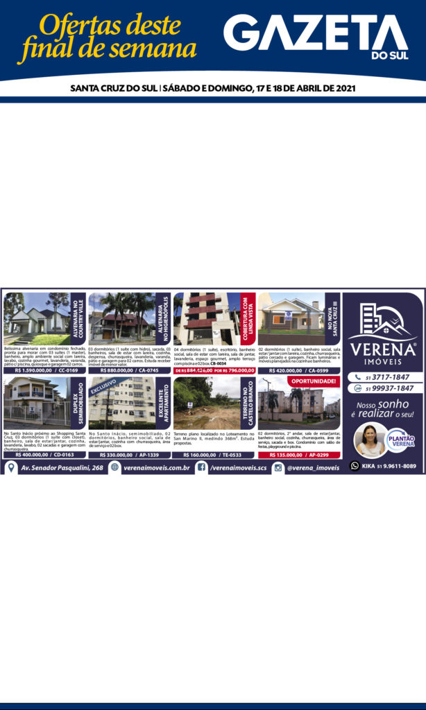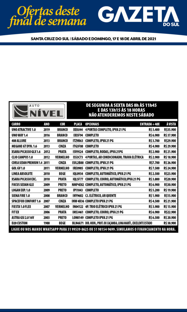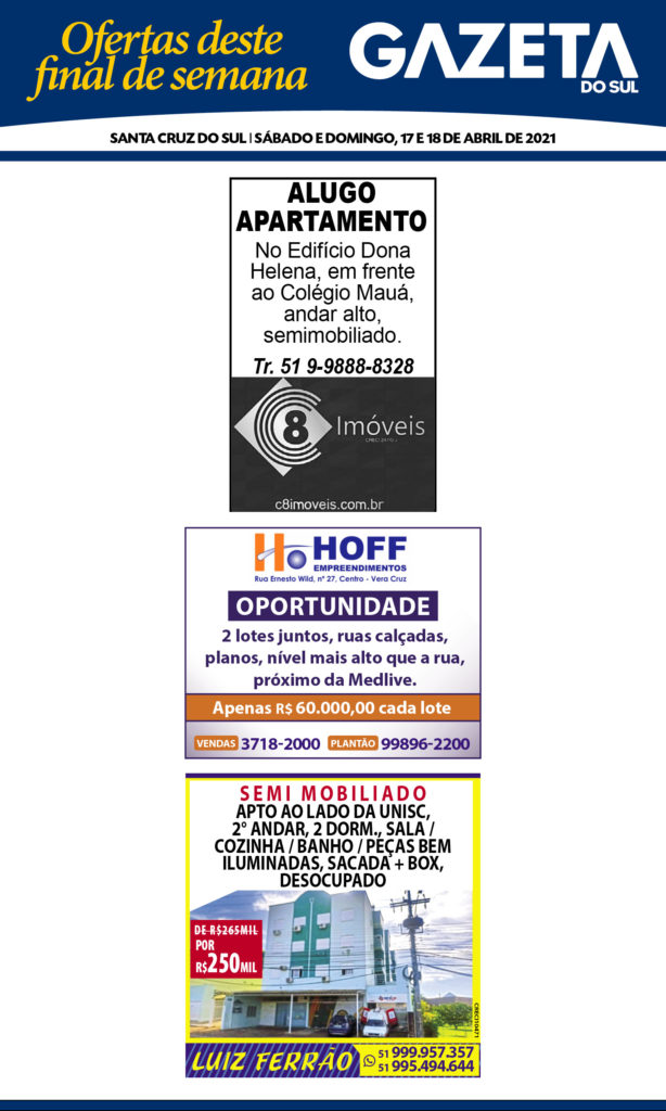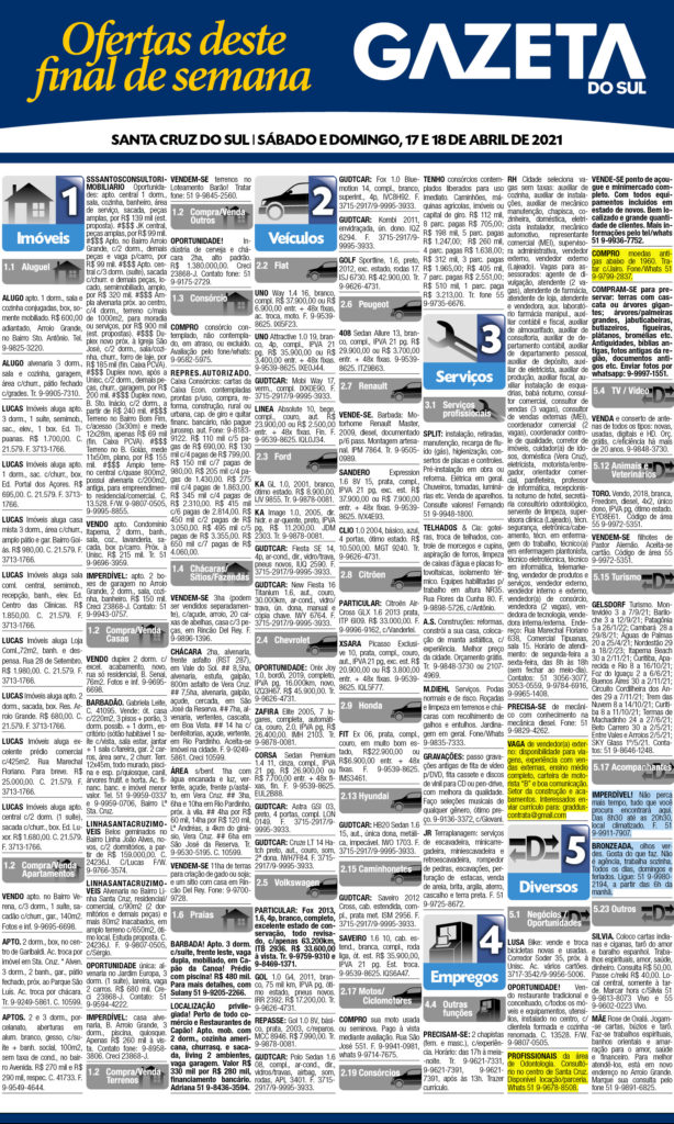 O suplemento de Classificados, que circula nas edições de terças, quintas e sábados, é um dos mais tradicionais da Gazeta do Sul, como vitrine e canal de negócios, de oferta, compra e venda em toda a região central do Rio Grande do Sul. E, para enriquecer pesquisas de produtos e serviços e possibilitar resultado ainda melhor a usuários e parceiros, nos anúncios de clientes cadastrados, o leitor tem acesso direto com link ao site do anunciante, onde poderá verificar mais detalhes sobre os itens. Confira: