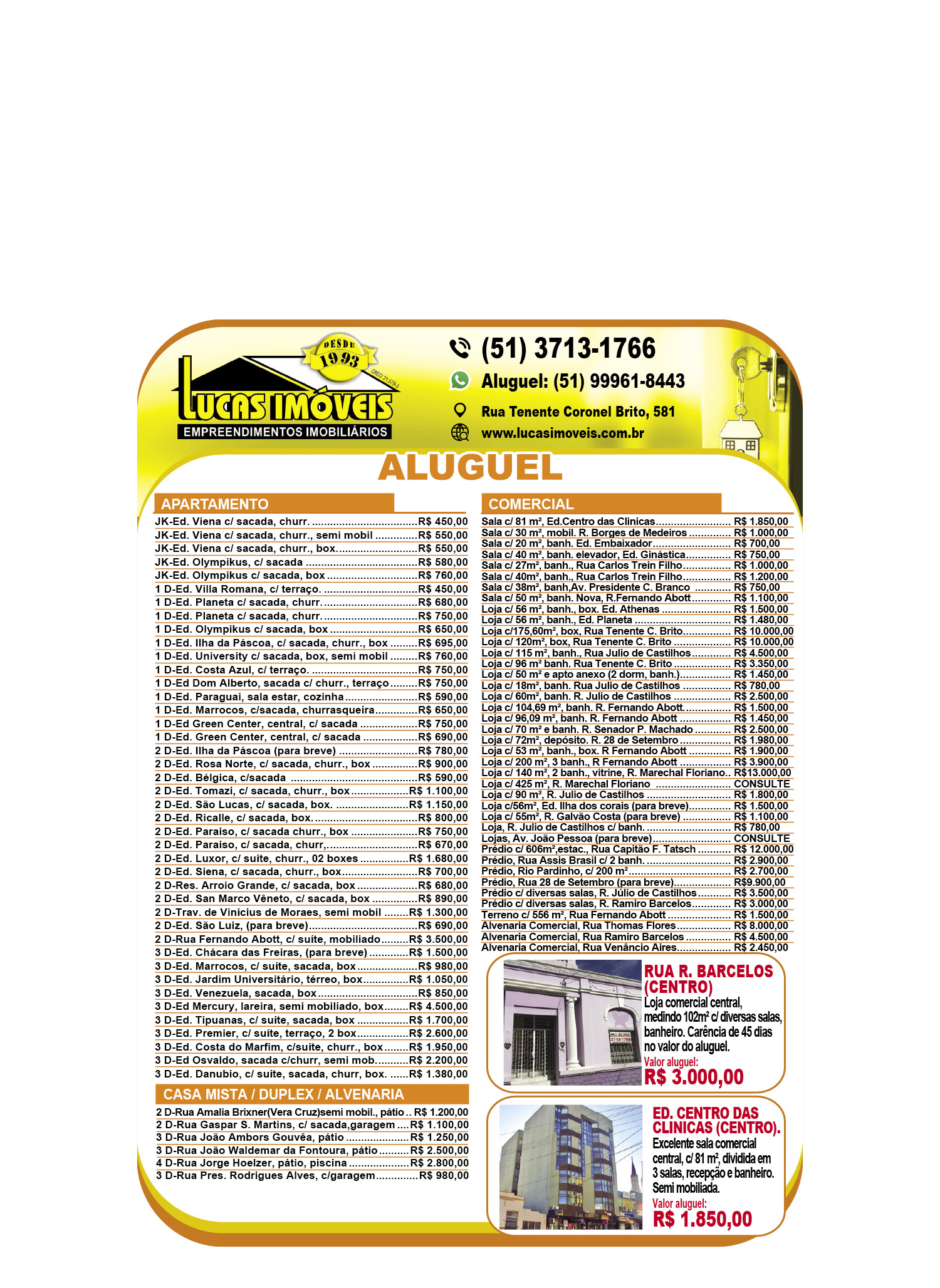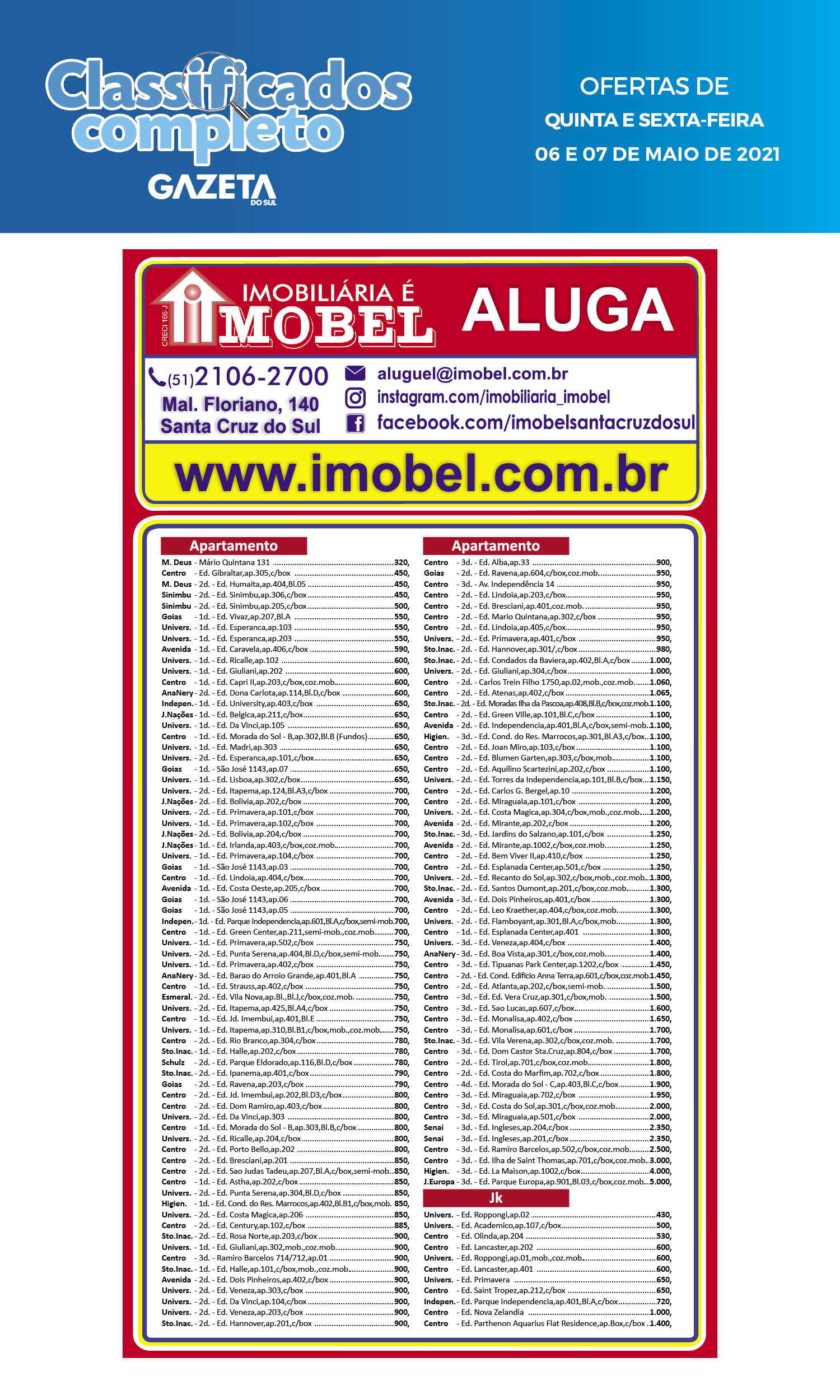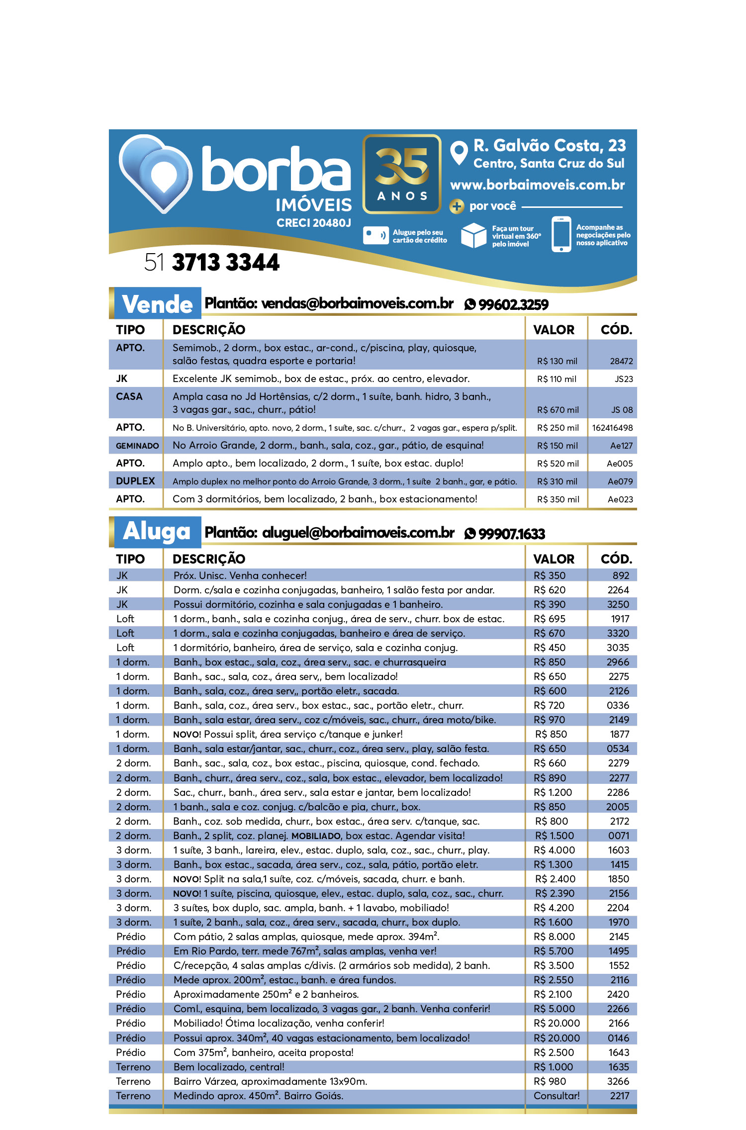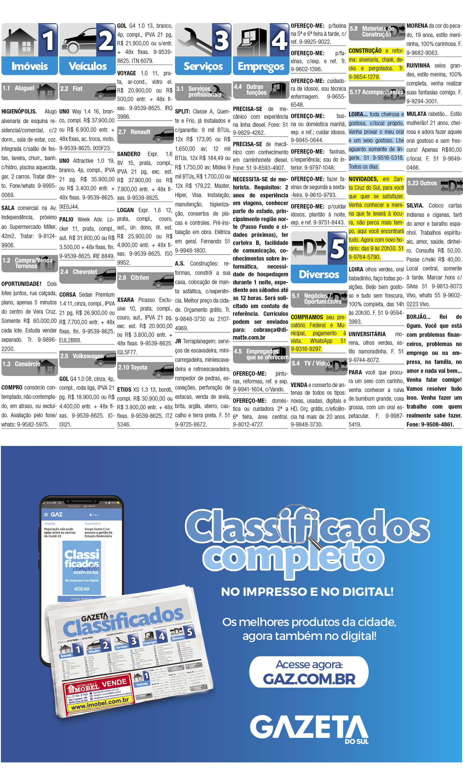 O suplemento de Classificados, que circula nas edições de terças, quintas e sábados, é um dos mais tradicionais da Gazeta do Sul, como vitrine e canal de negócios, de oferta, compra e venda em toda a região central do Rio Grande do Sul. E, para enriquecer pesquisas de produtos e serviços e possibilitar resultado ainda melhor a usuários e parceiros, nos anúncios de clientes cadastrados, o leitor tem acesso direto com link ao site do anunciante, onde poderá verificar mais detalhes sobre os itens. Confira: