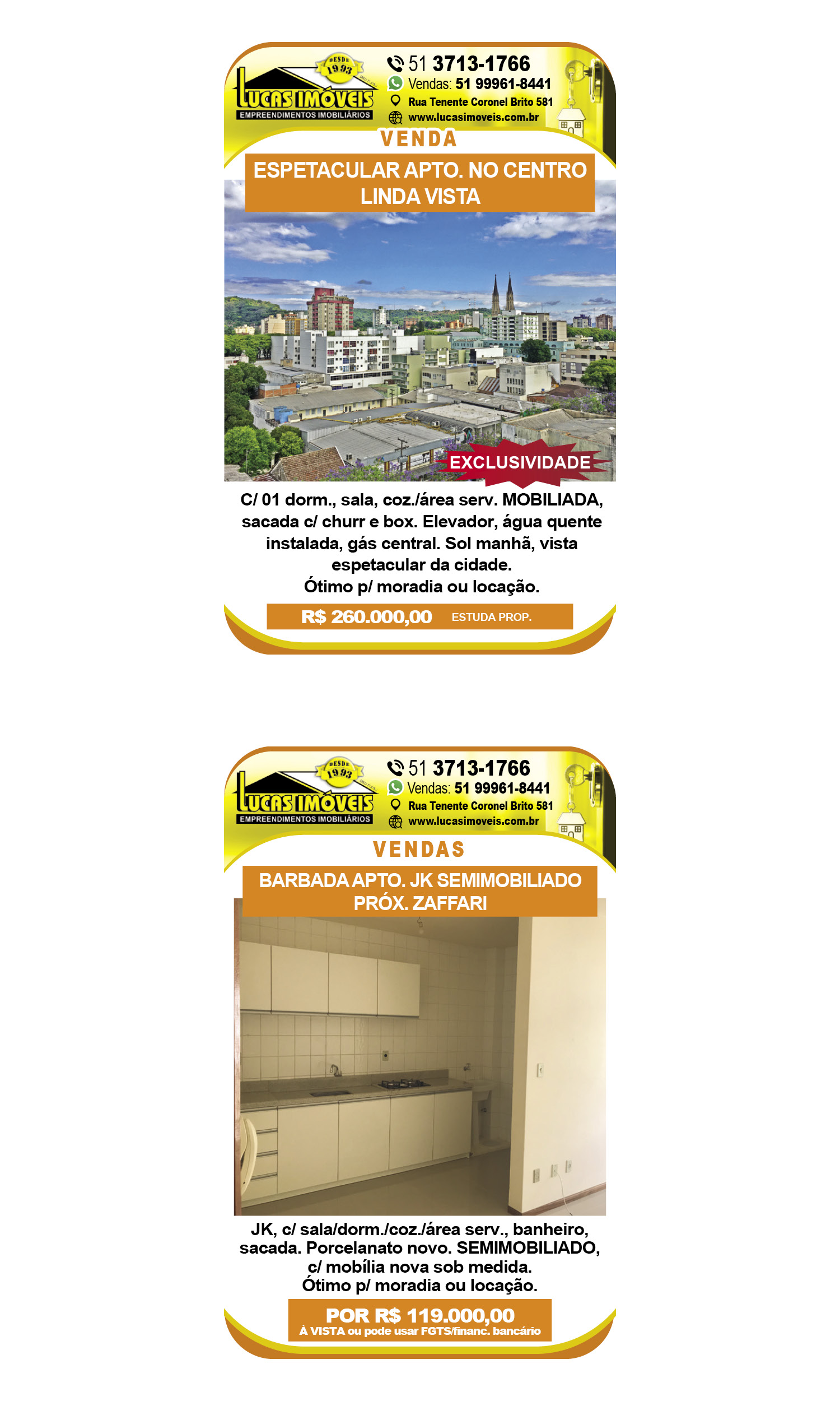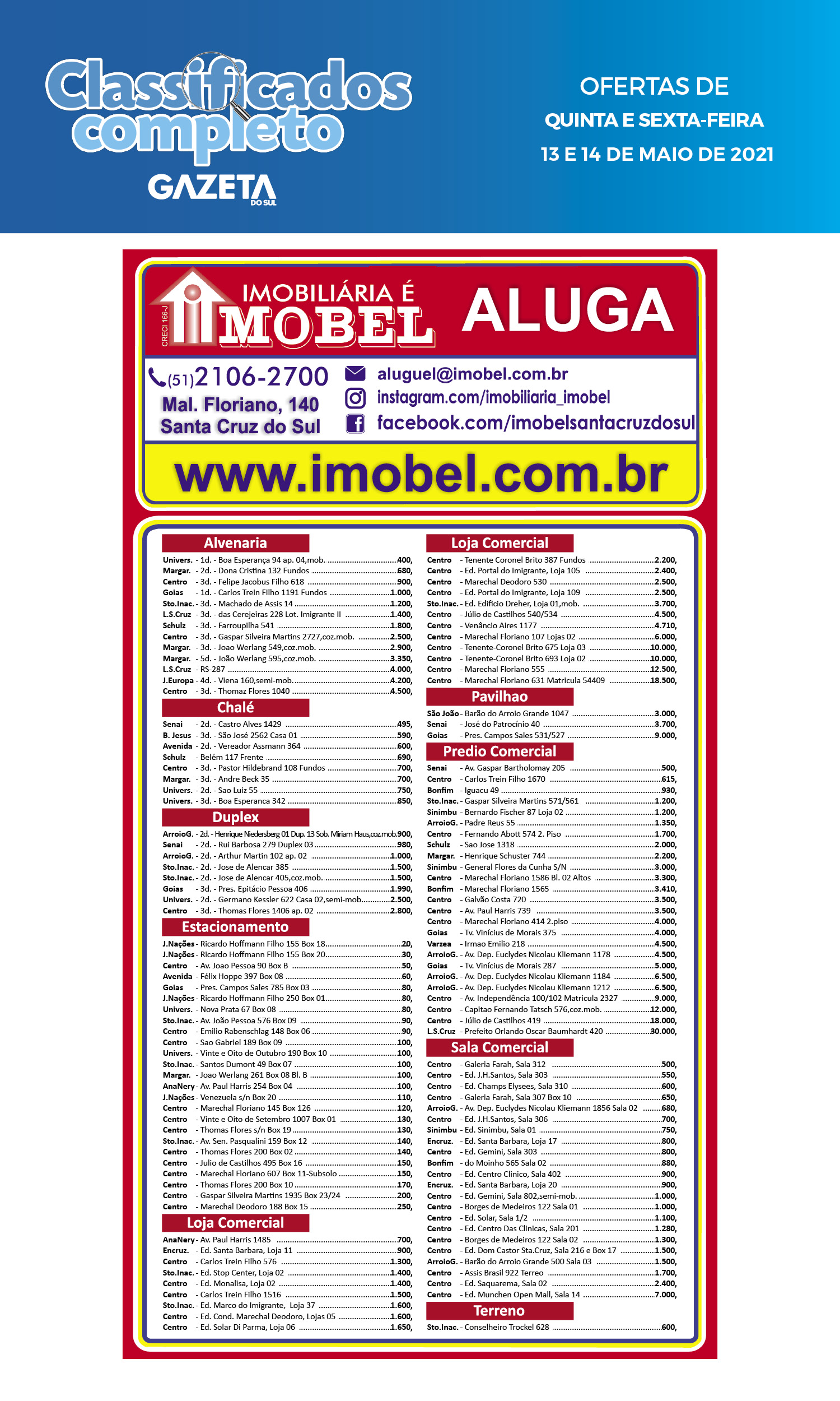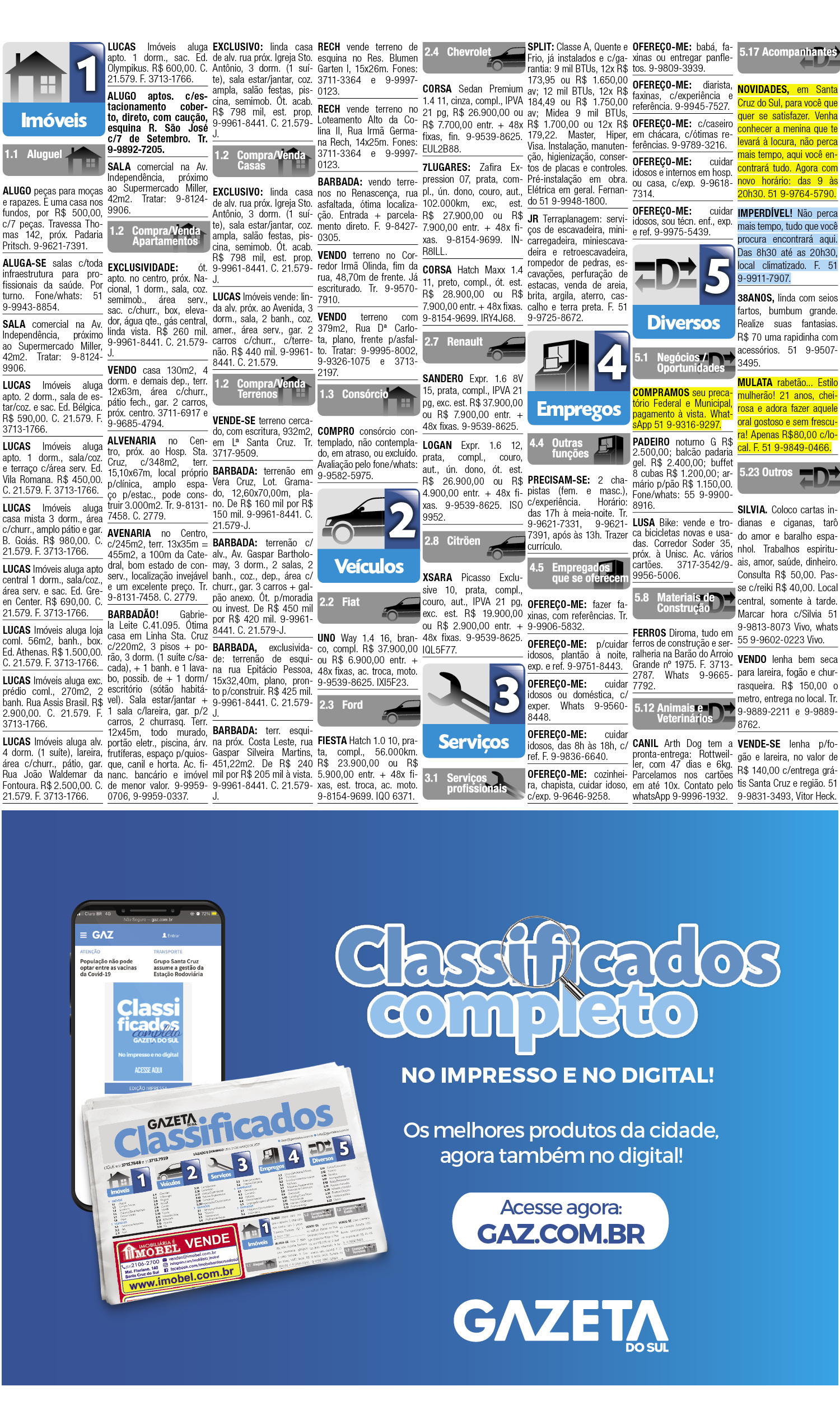 O suplemento de Classificados, que circula nas edições de terças, quintas e sábados, é um dos mais tradicionais da Gazeta do Sul, como vitrine e canal de negócios, de oferta, compra e venda em toda a região central do Rio Grande do Sul. E, para enriquecer pesquisas de produtos e serviços e possibilitar resultado ainda melhor a usuários e parceiros, nos anúncios de clientes cadastrados, o leitor tem acesso direto com link ao site do anunciante, onde poderá verificar mais detalhes sobre os itens. Confira: