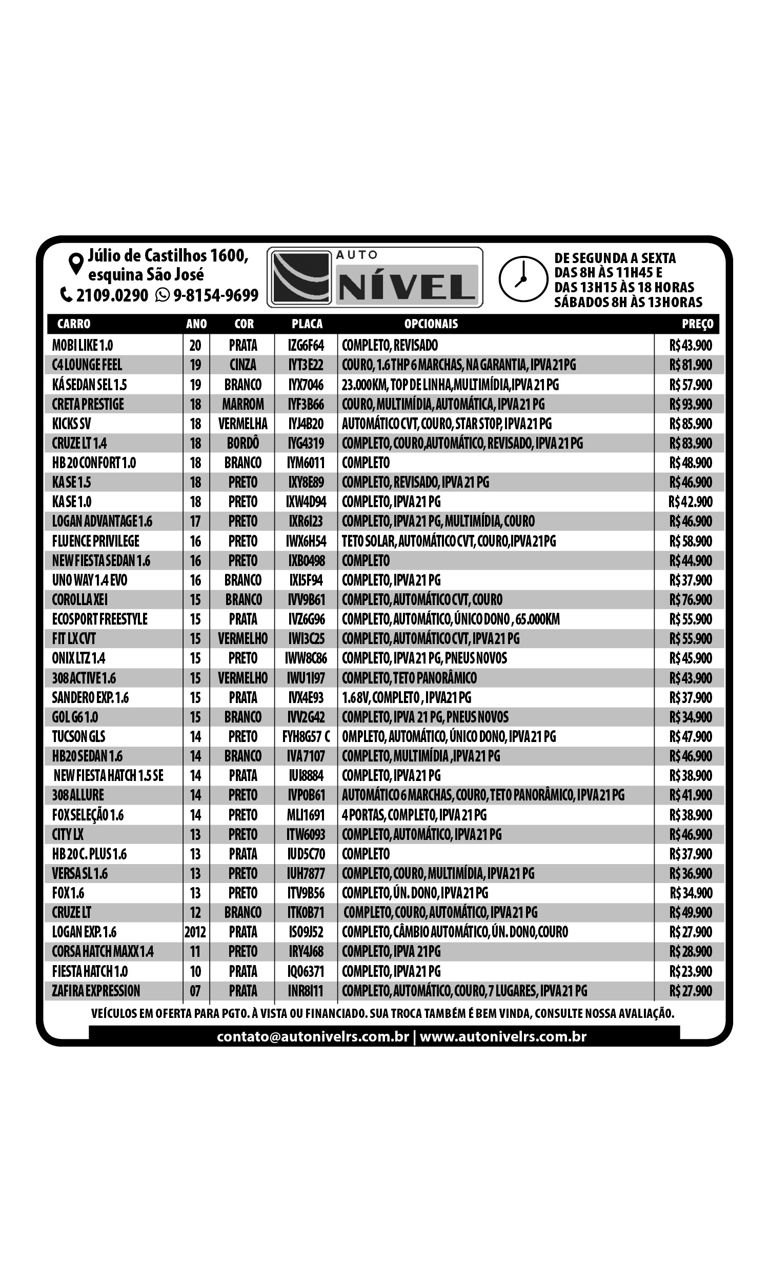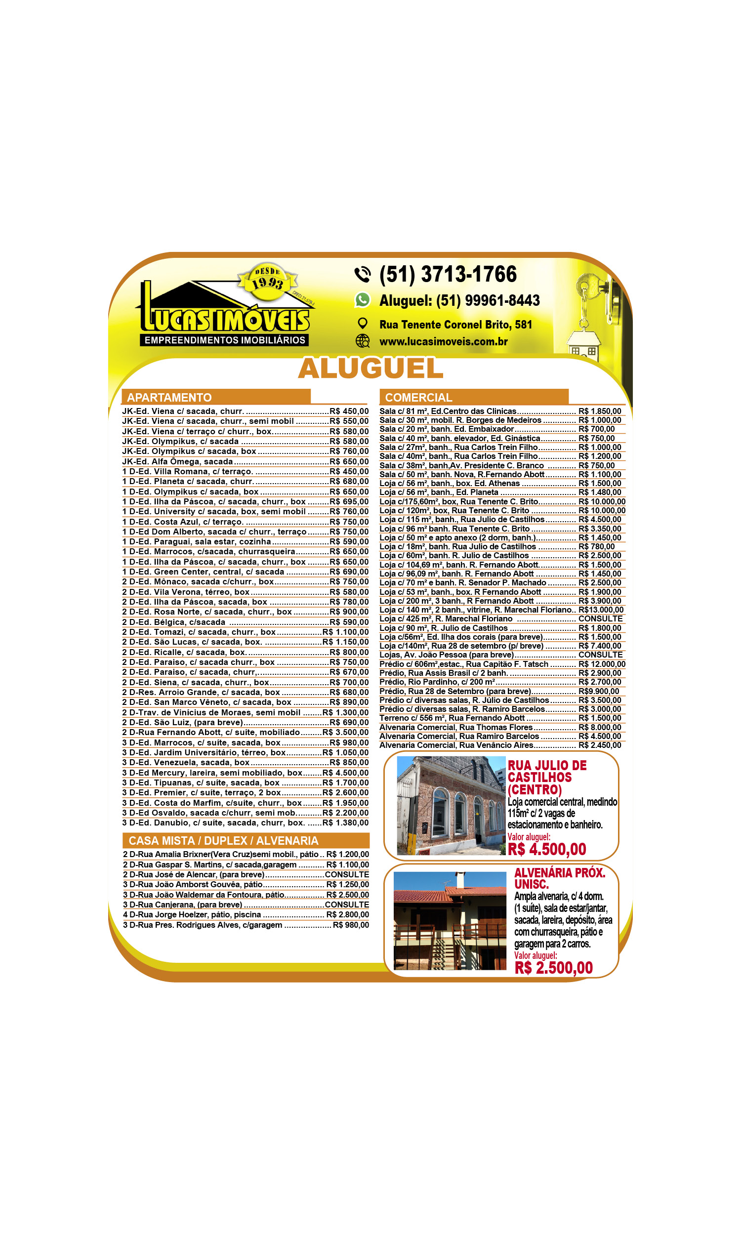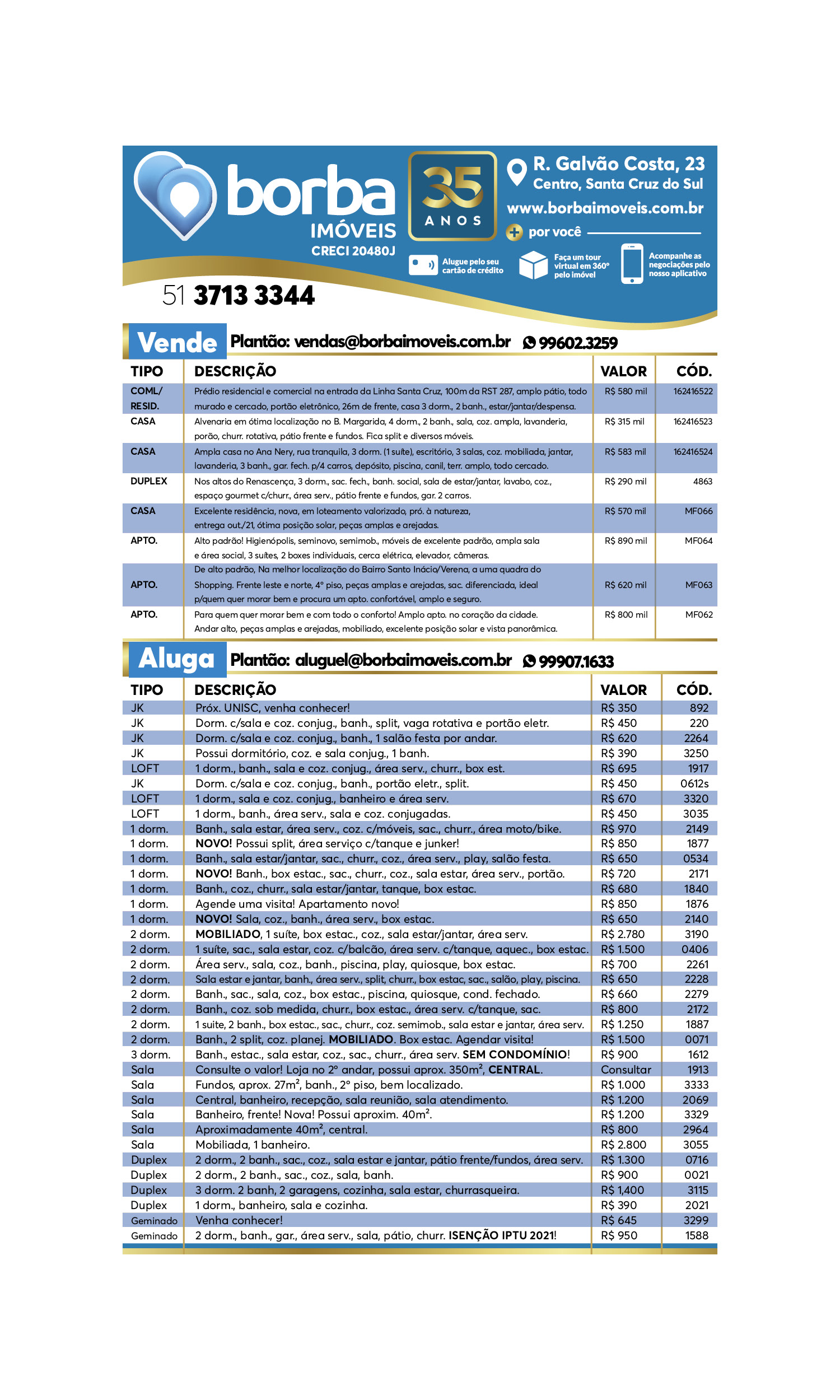 O suplemento de Classificados, que circula nas edições de terças, quintas e sábados, é um dos mais tradicionais da Gazeta do Sul, como vitrine e canal de negócios, de oferta, compra e venda em toda a região central do Rio Grande do Sul. E, para enriquecer pesquisas de produtos e serviços e possibilitar resultado ainda melhor a usuários e parceiros, nos anúncios de clientes cadastrados, o leitor tem acesso direto com link ao site do anunciante, onde poderá verificar mais detalhes sobre os itens. Confira: