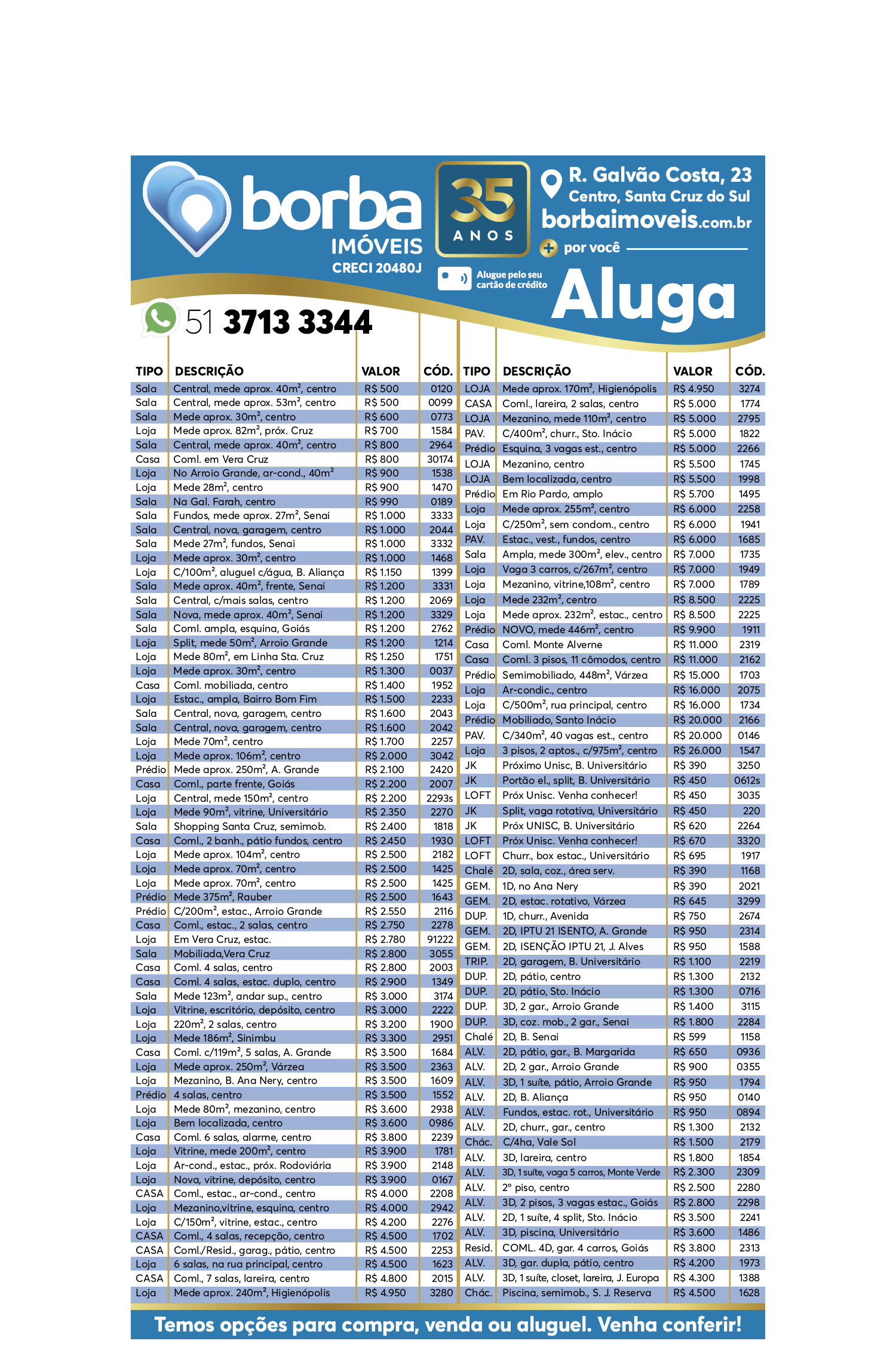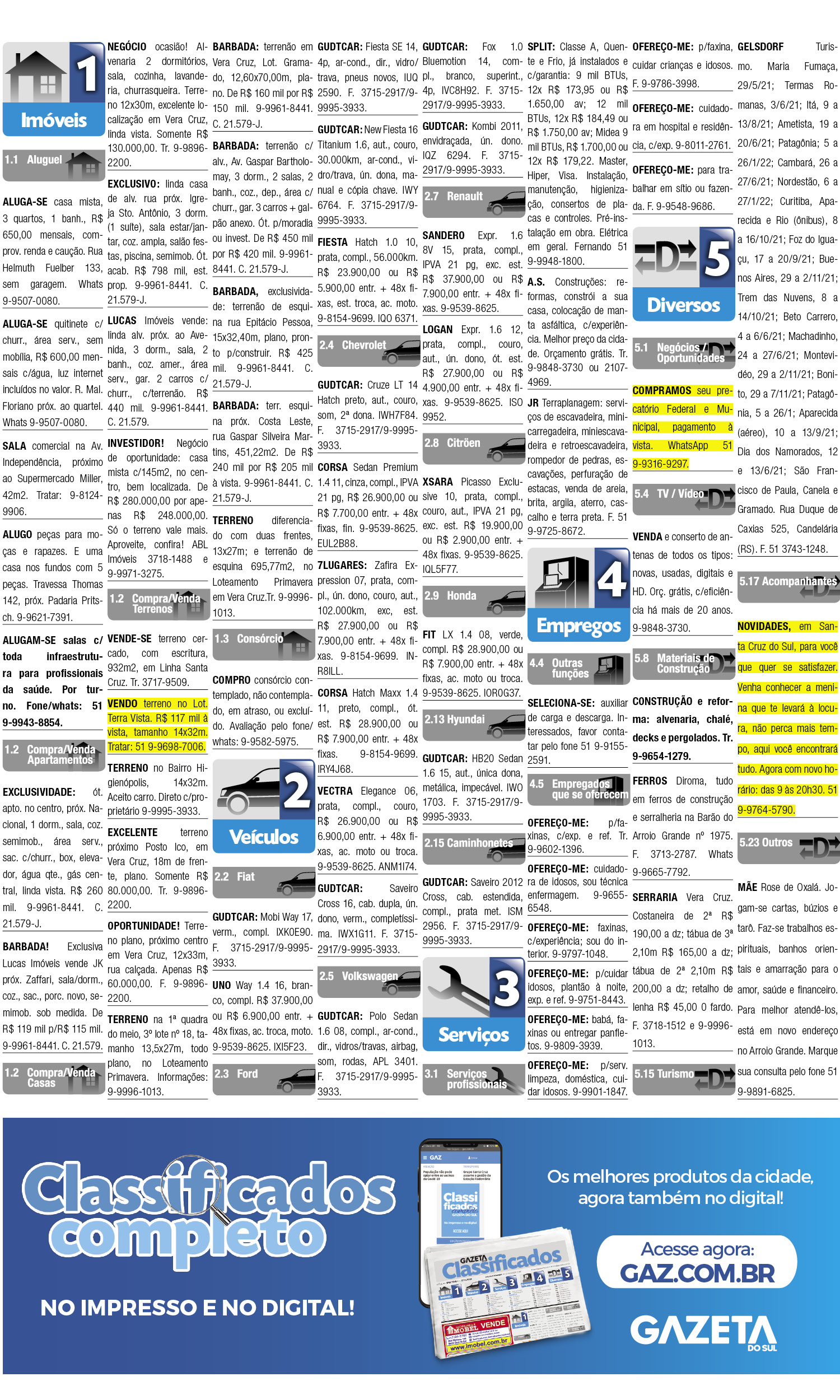 O suplemento de Classificados, que circula nas edições de terças, quintas e sábados, é um dos mais tradicionais da Gazeta do Sul, como vitrine e canal de negócios, de oferta, compra e venda em toda a região central do Rio Grande do Sul. E, para enriquecer pesquisas de produtos e serviços e possibilitar resultado ainda melhor a usuários e parceiros, nos anúncios de clientes cadastrados, o leitor tem acesso direto com link ao site do anunciante, onde poderá verificar mais detalhes sobre os itens. Confira: