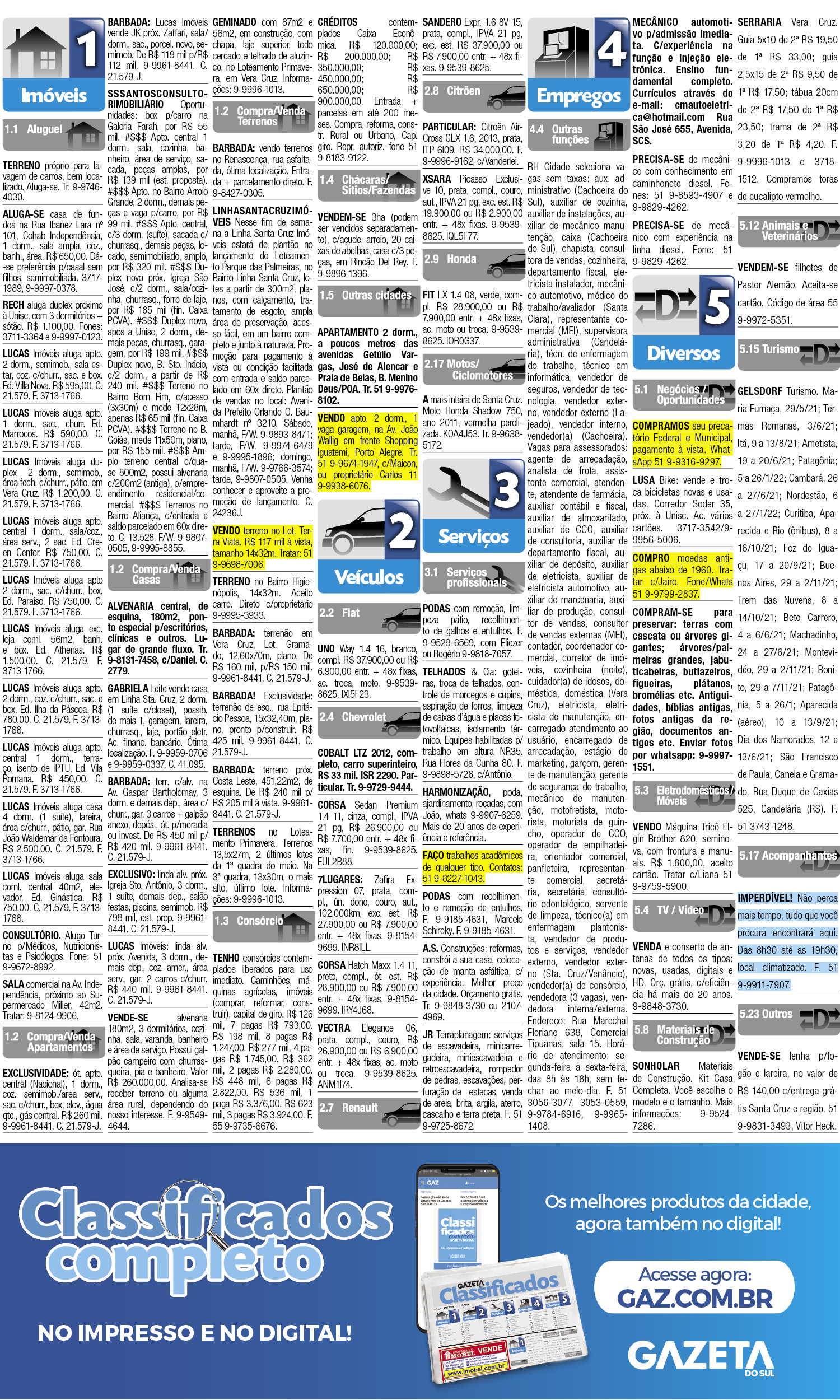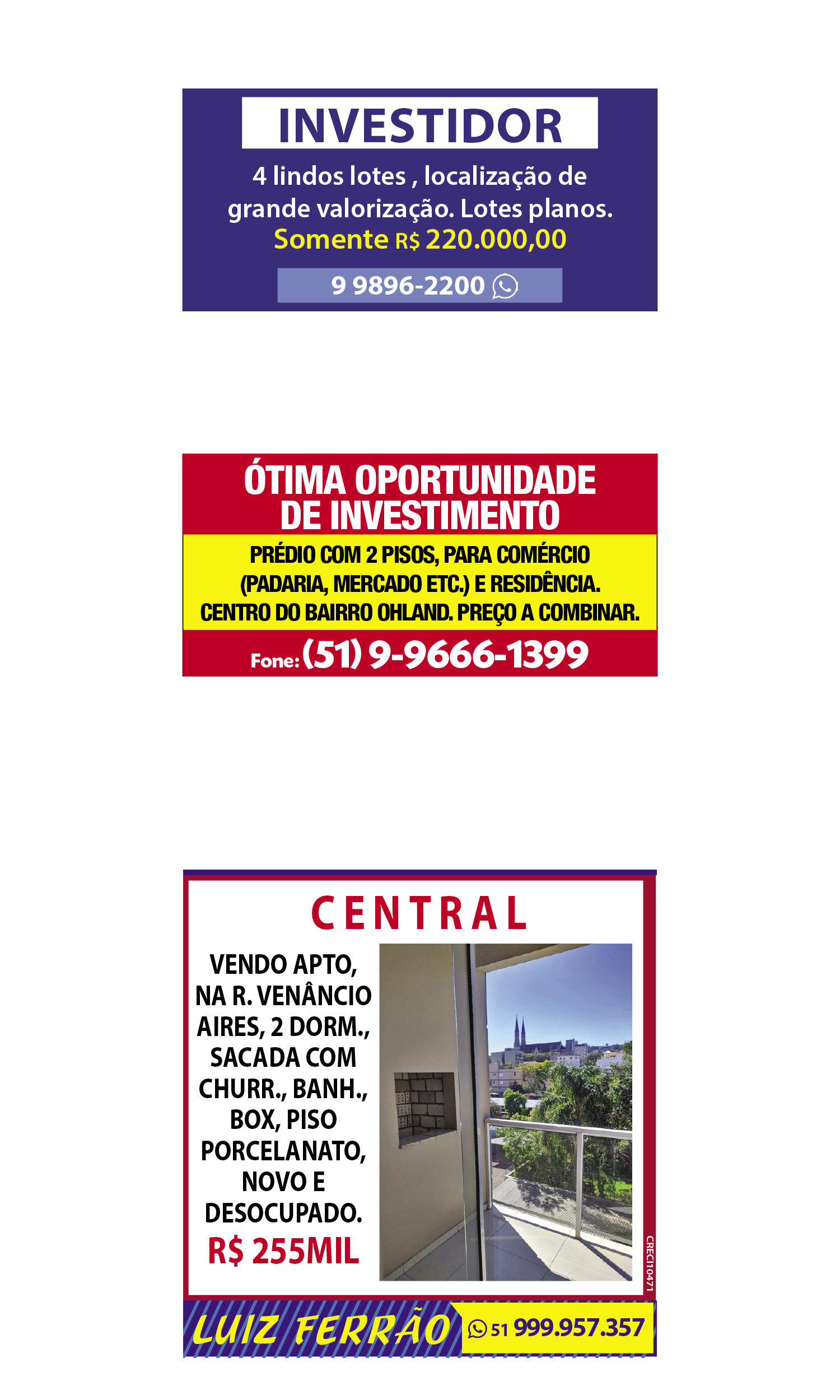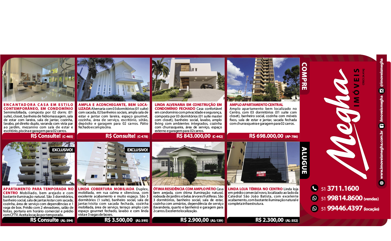 O suplemento de Classificados, que circula nas edições de terças, quintas e sábados, é um dos mais tradicionais da Gazeta do Sul, como vitrine e canal de negócios, de oferta, compra e venda em toda a região central do Rio Grande do Sul. E, para enriquecer pesquisas de produtos e serviços e possibilitar resultado ainda melhor a usuários e parceiros, nos anúncios de clientes cadastrados, o leitor tem acesso direto com link ao site do anunciante, onde poderá verificar mais detalhes sobre os itens. Confira: