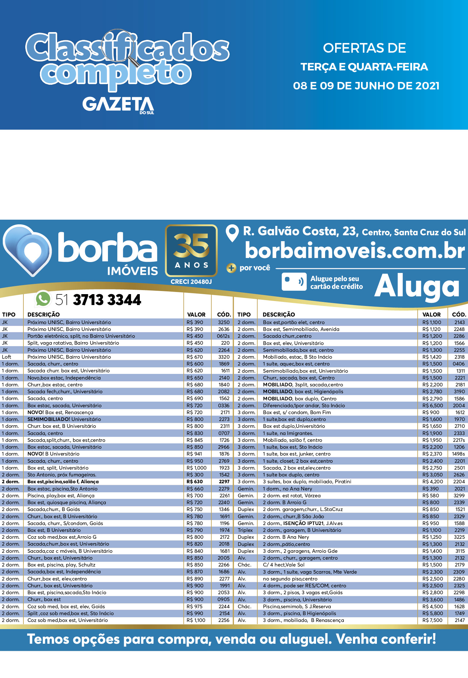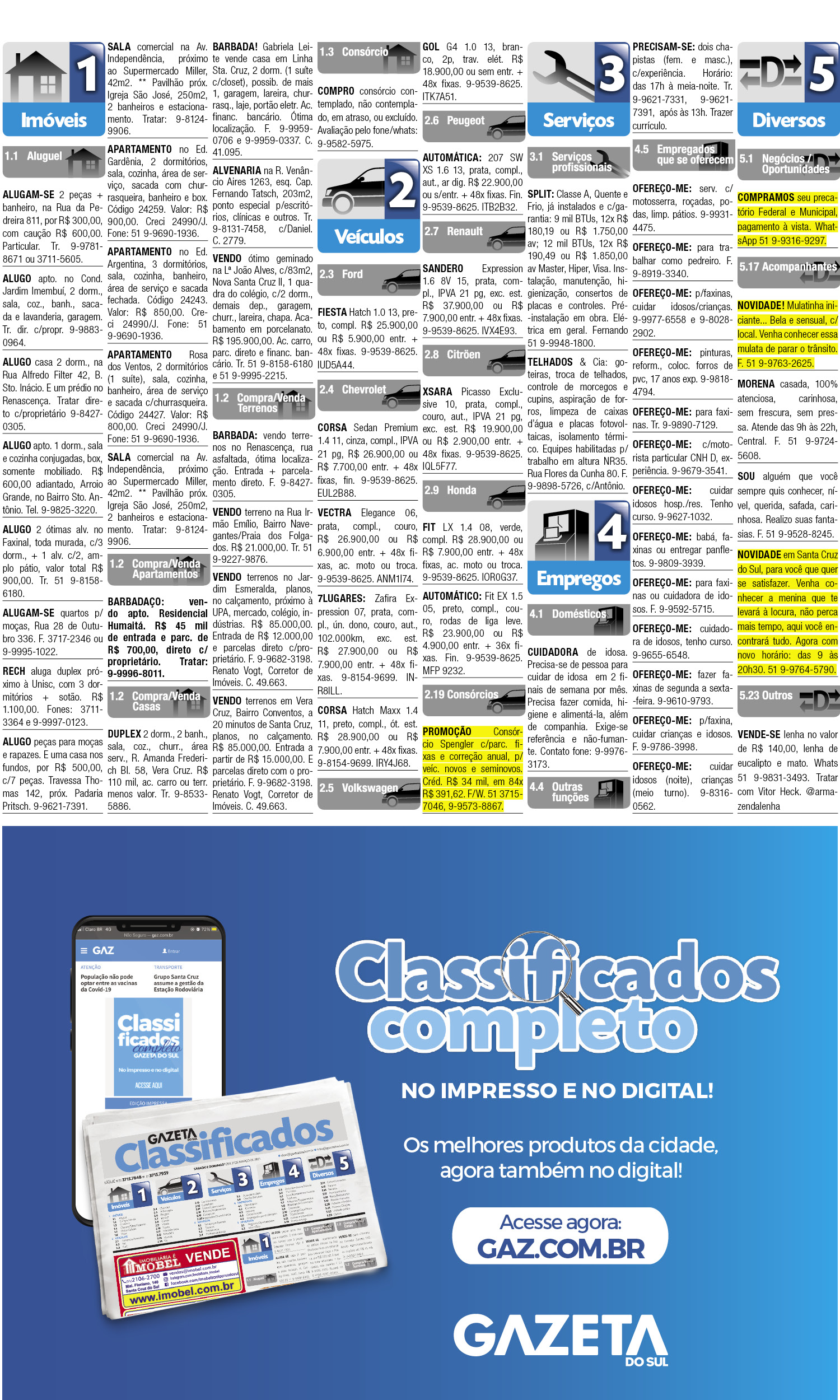 O suplemento de Classificados, que circula nas edições de terças, quintas e sábados, é um dos mais tradicionais da Gazeta do Sul, como vitrine e canal de negócios, de oferta, compra e venda em toda a região central do Rio Grande do Sul. E, para enriquecer pesquisas de produtos e serviços e possibilitar resultado ainda melhor a usuários e parceiros, nos anúncios de clientes cadastrados, o leitor tem acesso direto com link ao site do anunciante, onde poderá verificar mais detalhes sobre os itens. Confira: