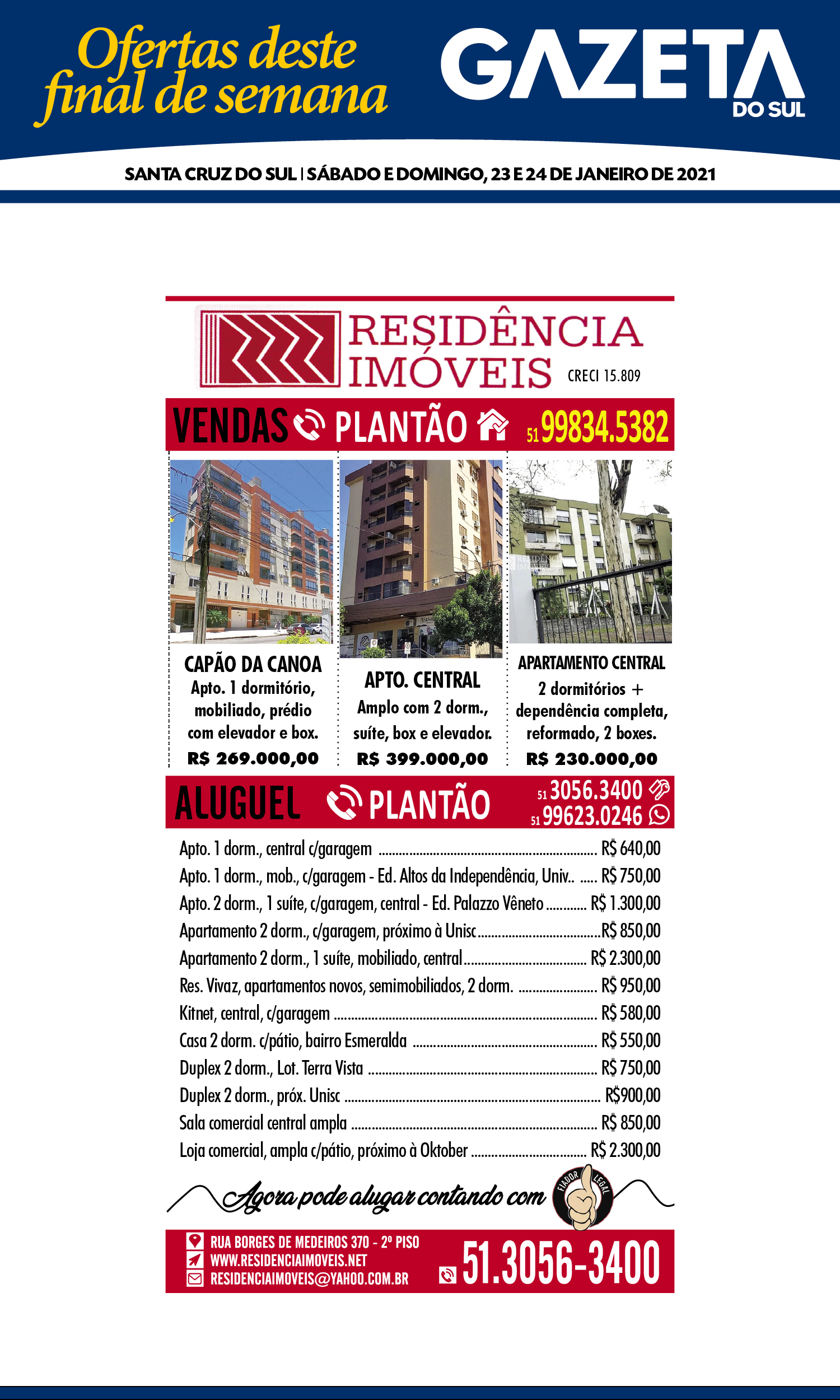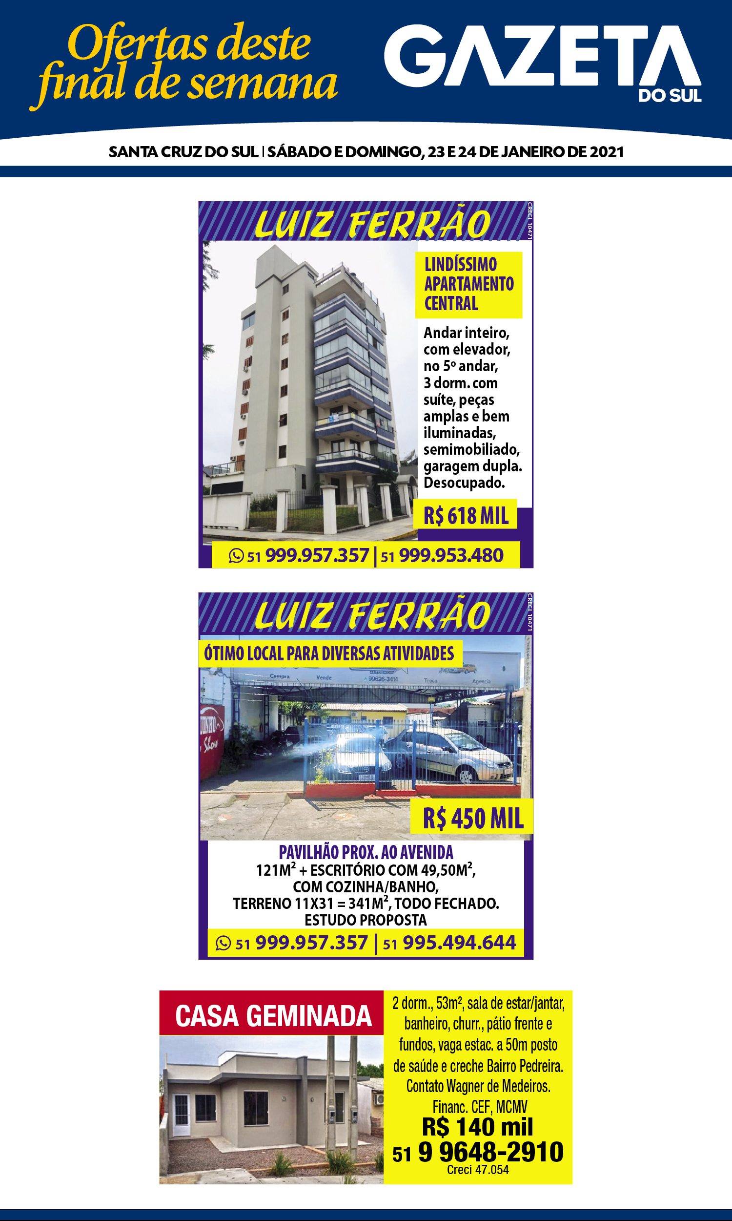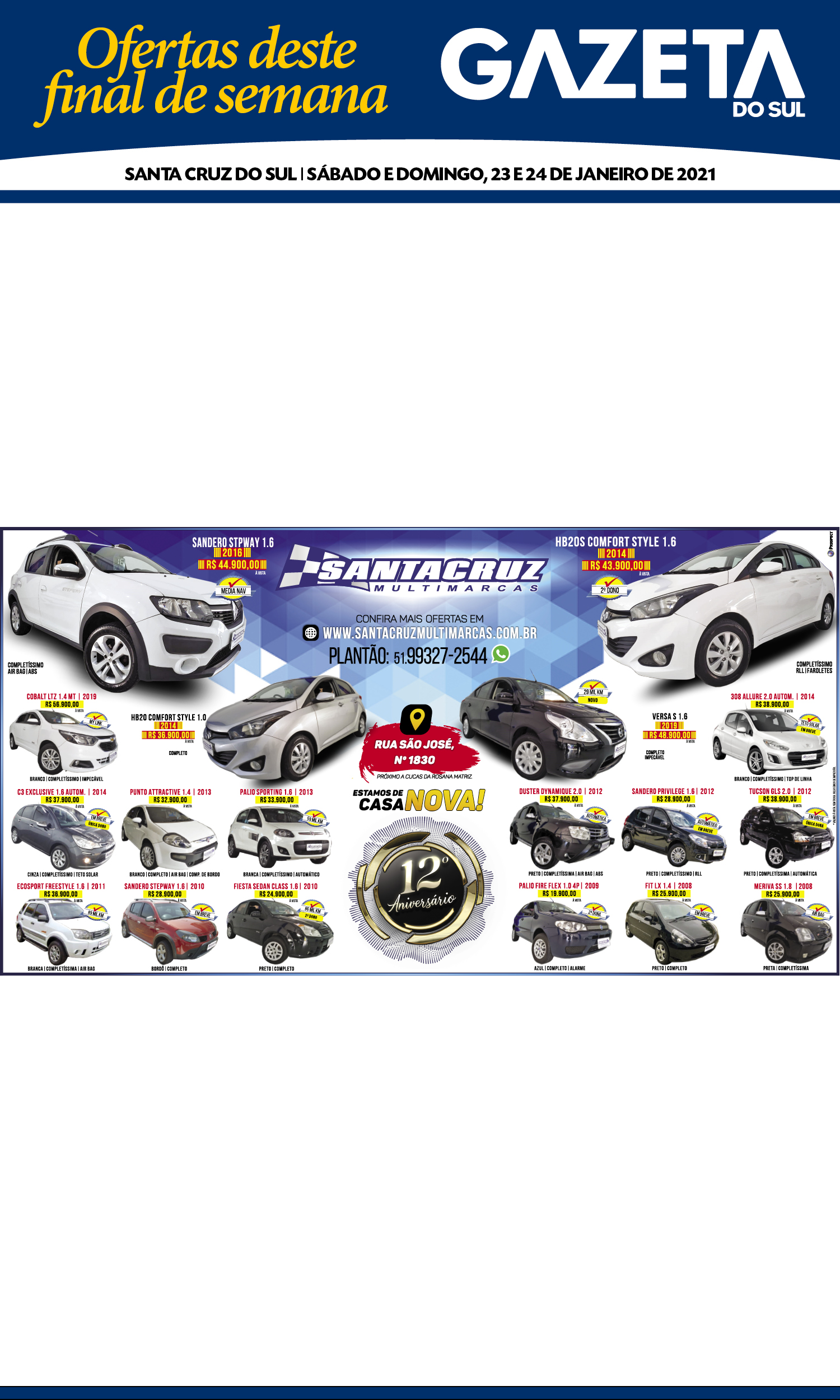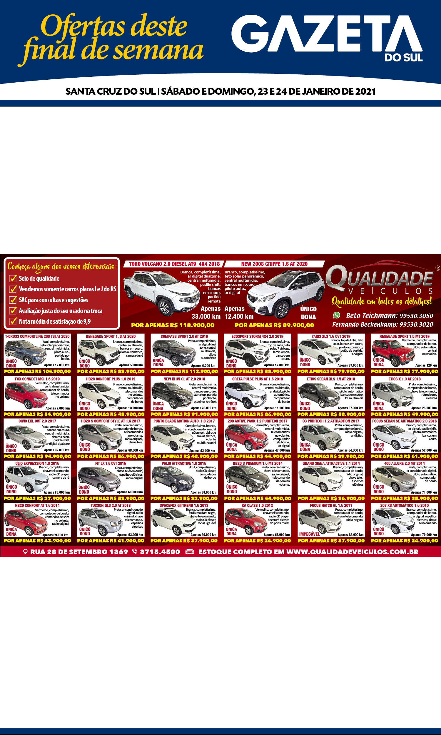 O suplemento de Classificados, que circula nas edições de terças, quintas e sábados, é um dos mais tradicionais da Gazeta do Sul, como vitrine e canal de negócios, de oferta, compra e venda em toda a região central do Rio Grande do Sul. E, para enriquecer pesquisas de produtos e serviços e possibilitar resultado ainda melhor a usuários e parceiros, nos anúncios de clientes cadastrados, o leitor tem acesso direto com link ao site do anunciante, onde poderá verificar mais detalhes sobre os itens. Confira: