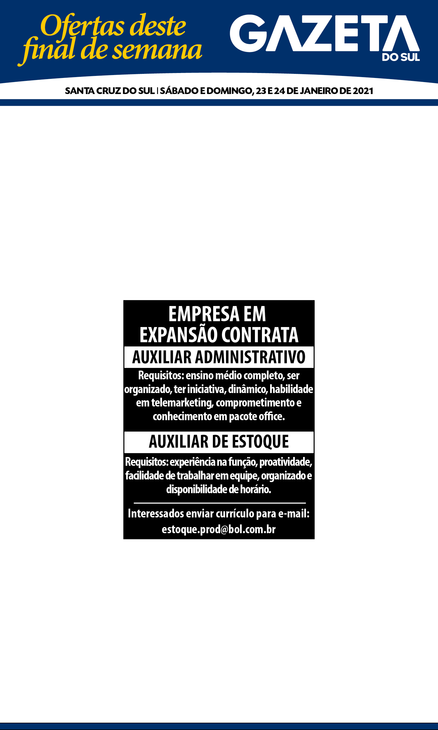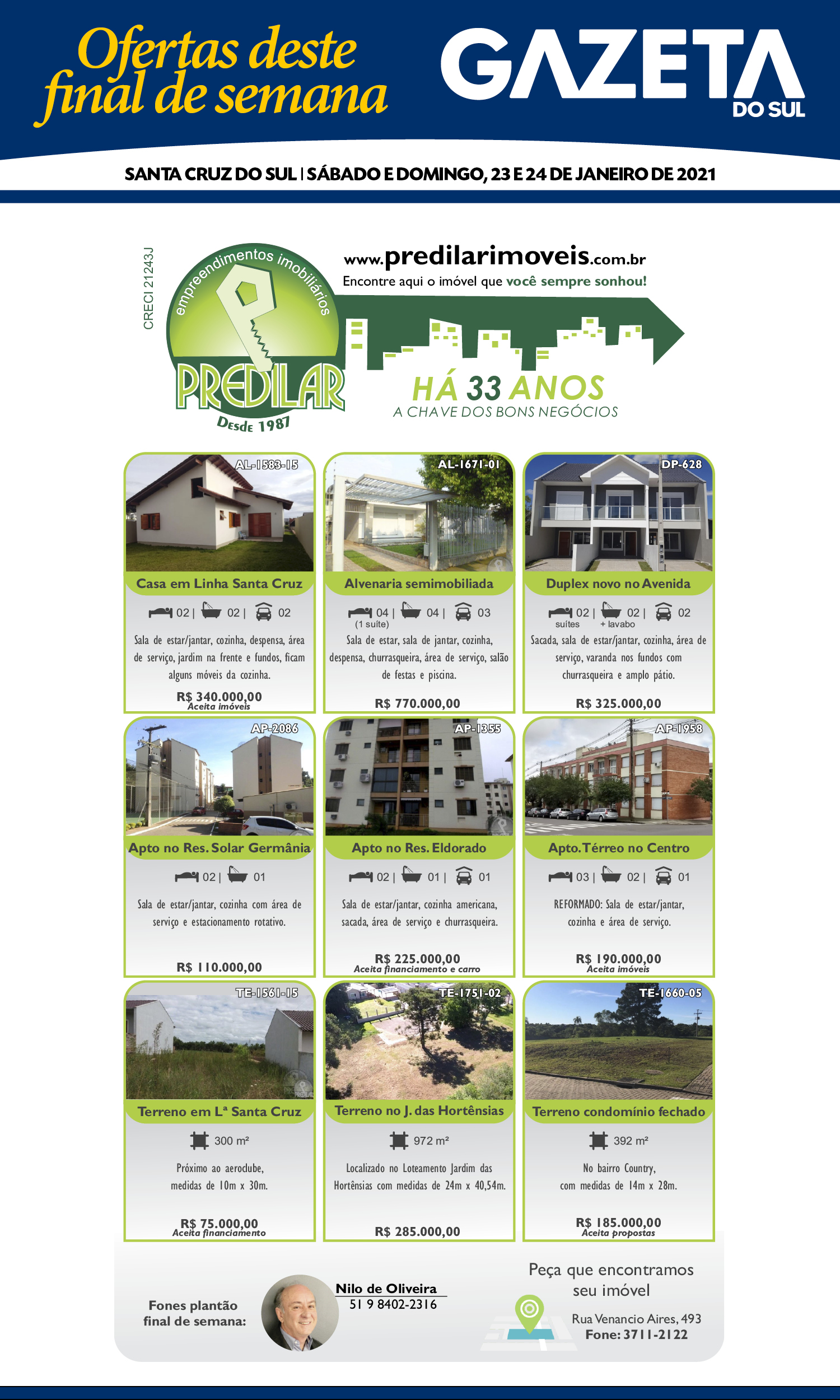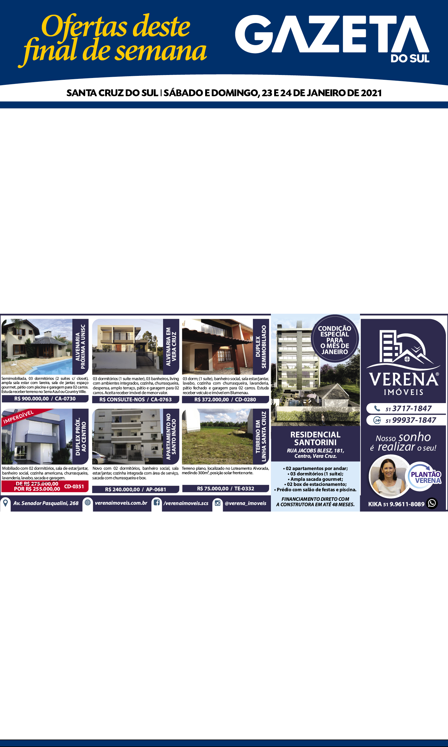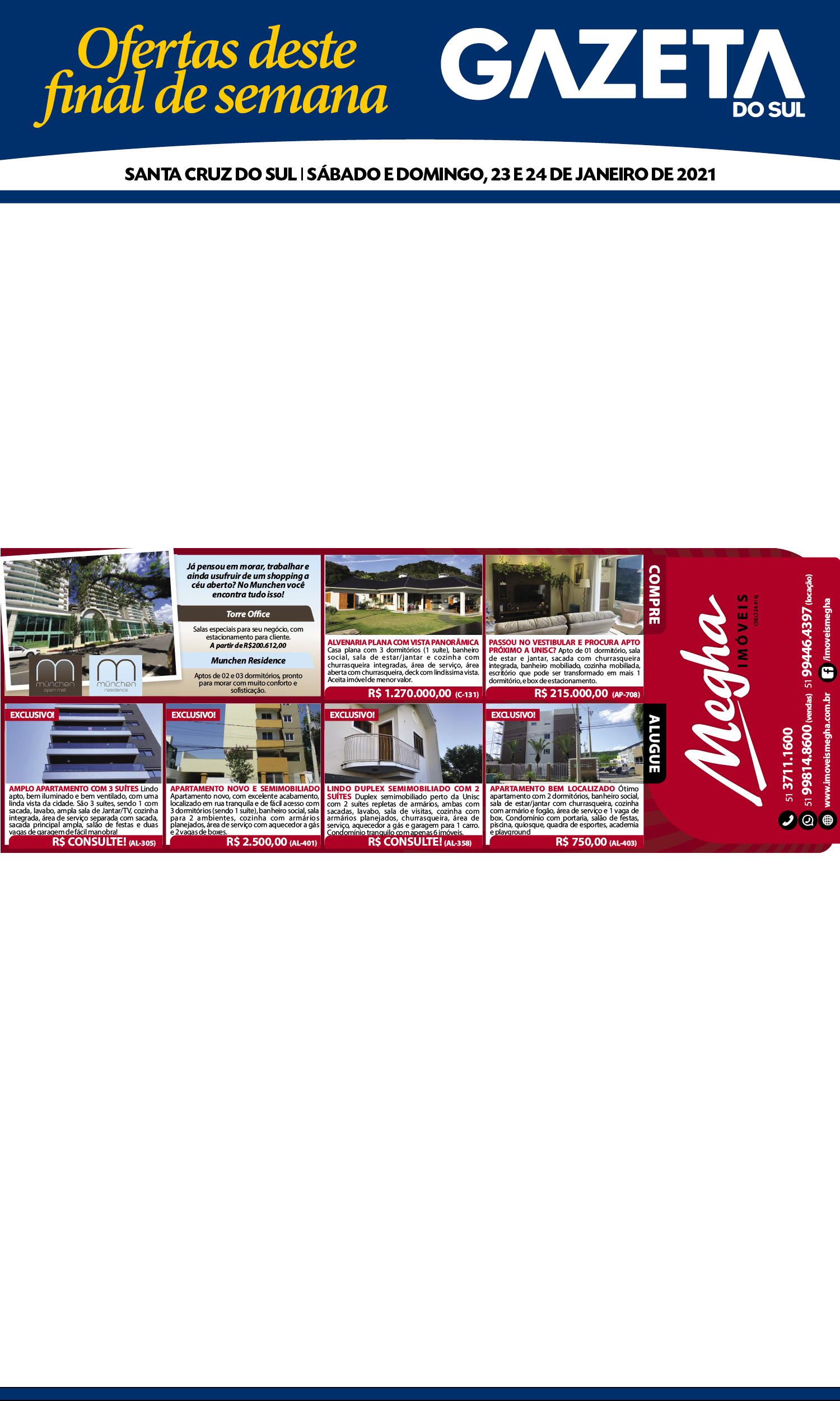 O suplemento de Classificados, que circula nas edições de terças, quintas e sábados, é um dos mais tradicionais da Gazeta do Sul, como vitrine e canal de negócios, de oferta, compra e venda em toda a região central do Rio Grande do Sul. E, para enriquecer pesquisas de produtos e serviços e possibilitar resultado ainda melhor a usuários e parceiros, nos anúncios de clientes cadastrados, o leitor tem acesso direto com link ao site do anunciante, onde poderá verificar mais detalhes sobre os itens. Confira: