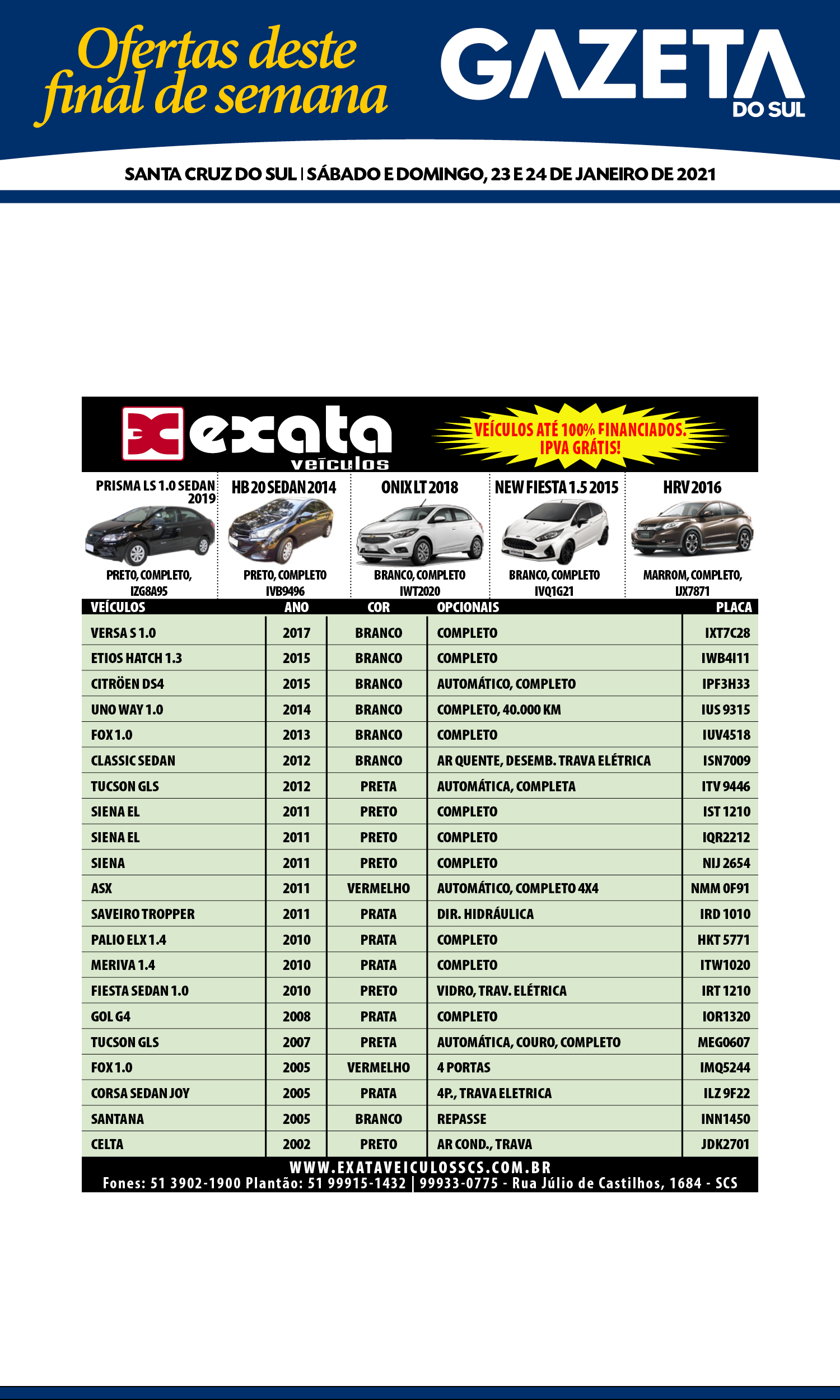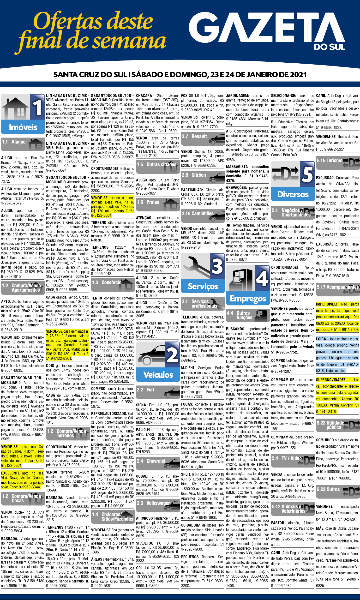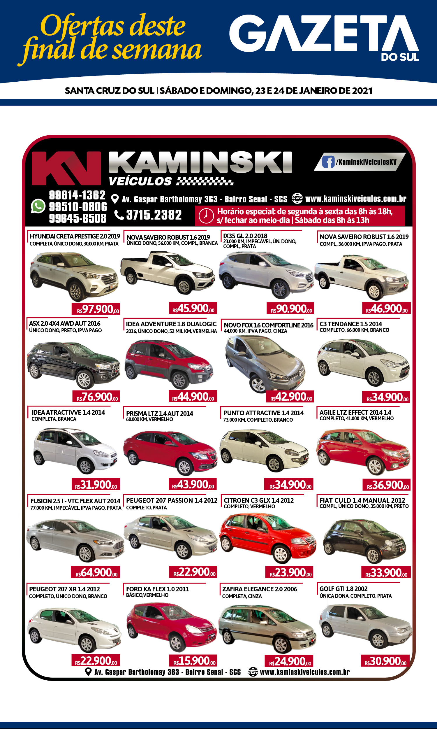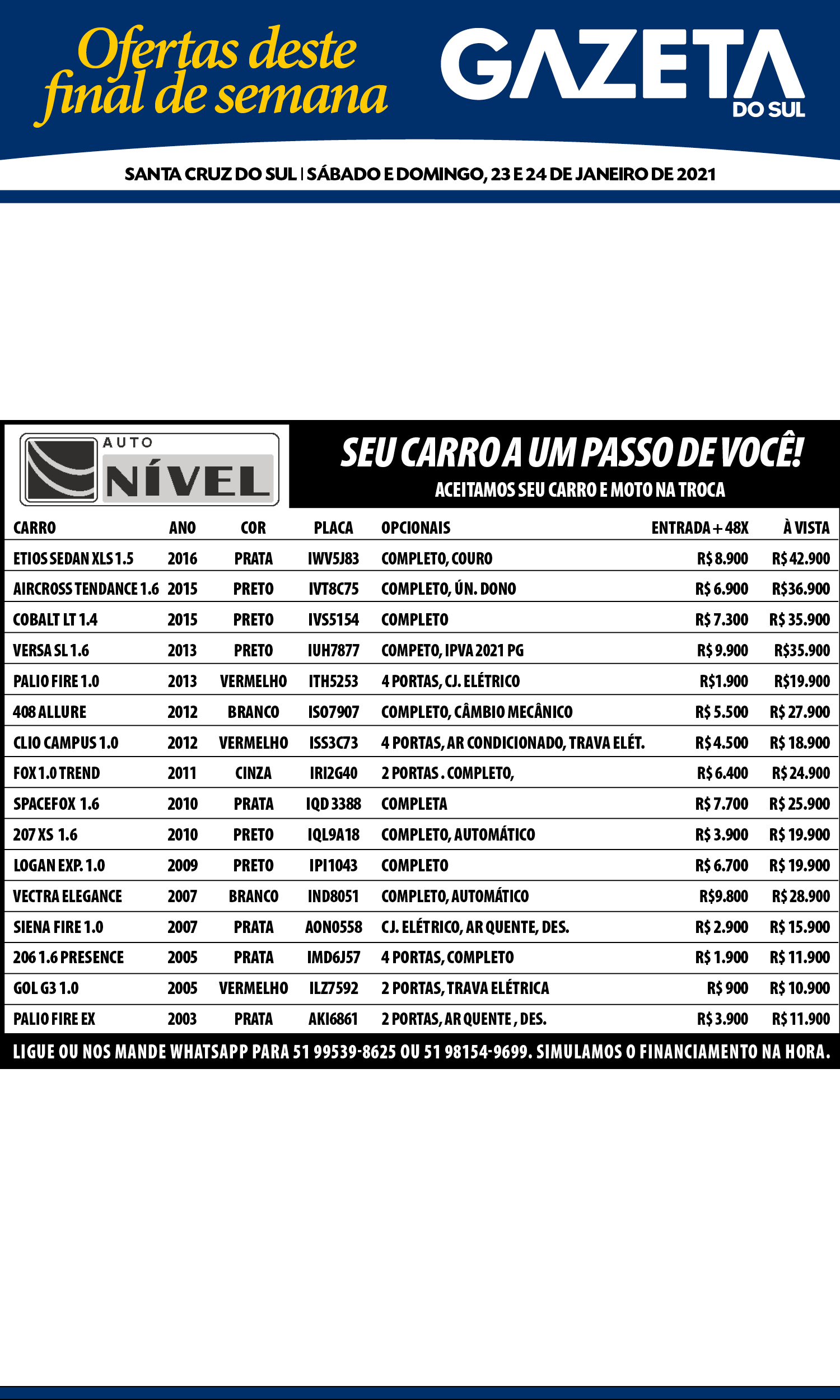 O suplemento de Classificados, que circula nas edições de terças, quintas e sábados, é um dos mais tradicionais da Gazeta do Sul, como vitrine e canal de negócios, de oferta, compra e venda em toda a região central do Rio Grande do Sul. E, para enriquecer pesquisas de produtos e serviços e possibilitar resultado ainda melhor a usuários e parceiros, nos anúncios de clientes cadastrados, o leitor tem acesso direto com link ao site do anunciante, onde poderá verificar mais detalhes sobre os itens. Confira:
