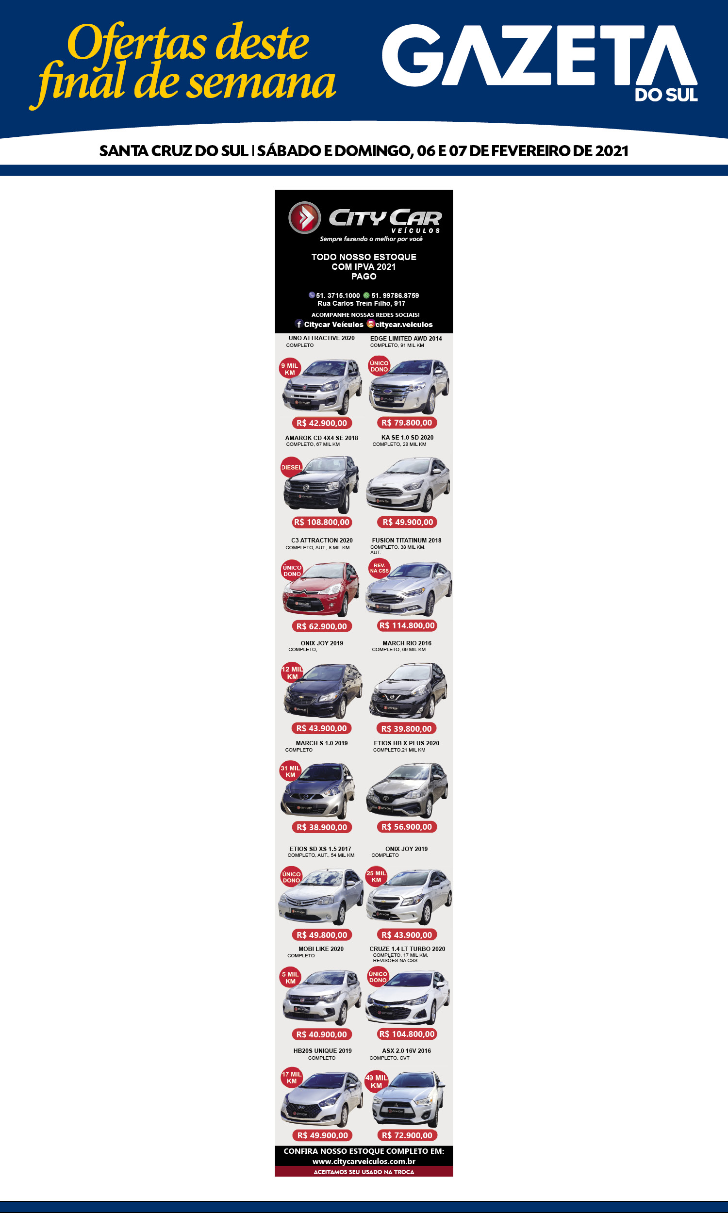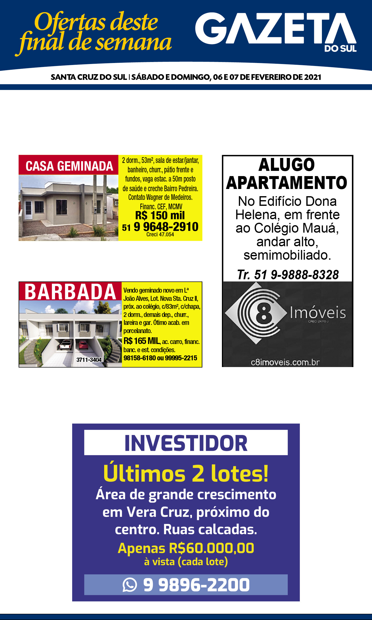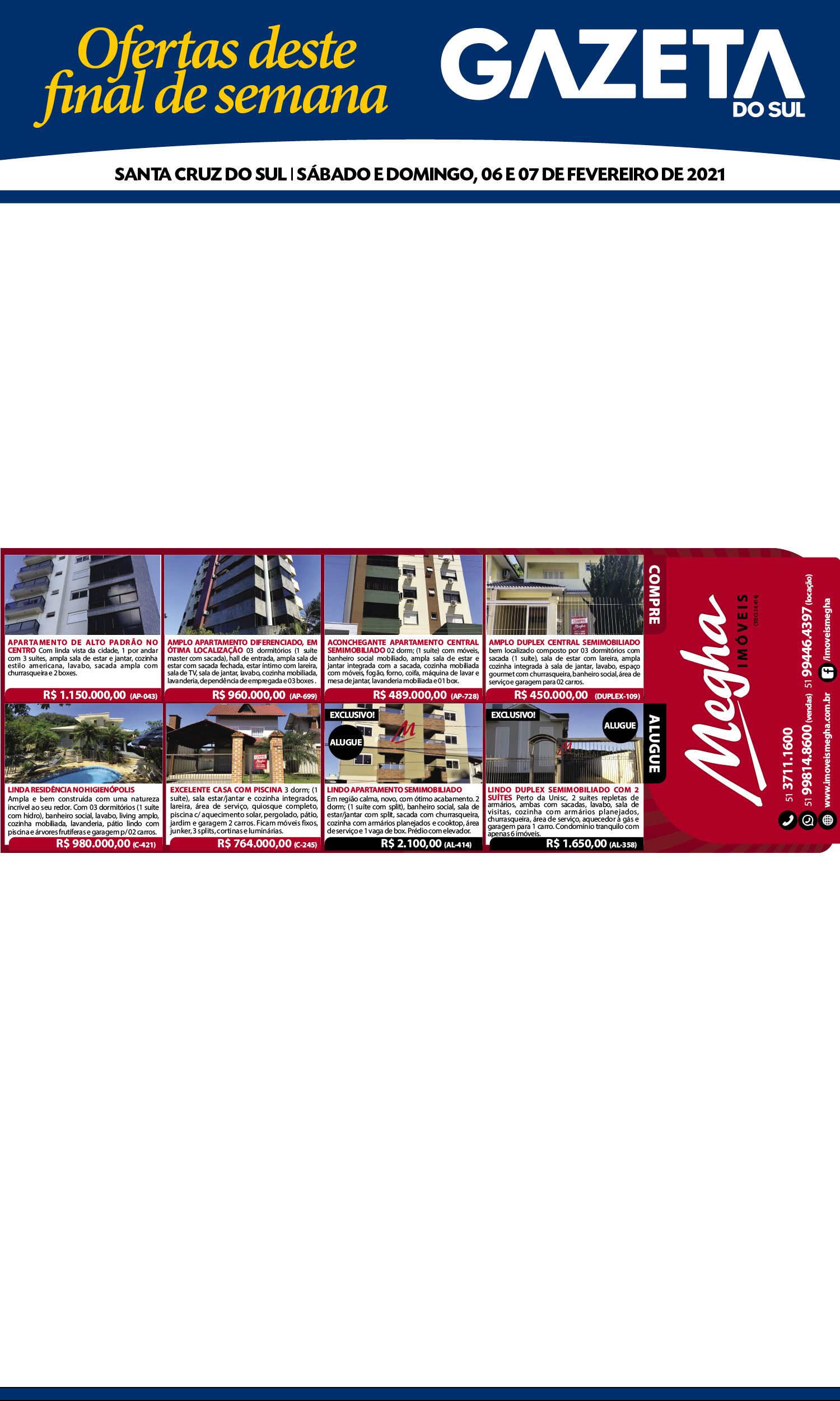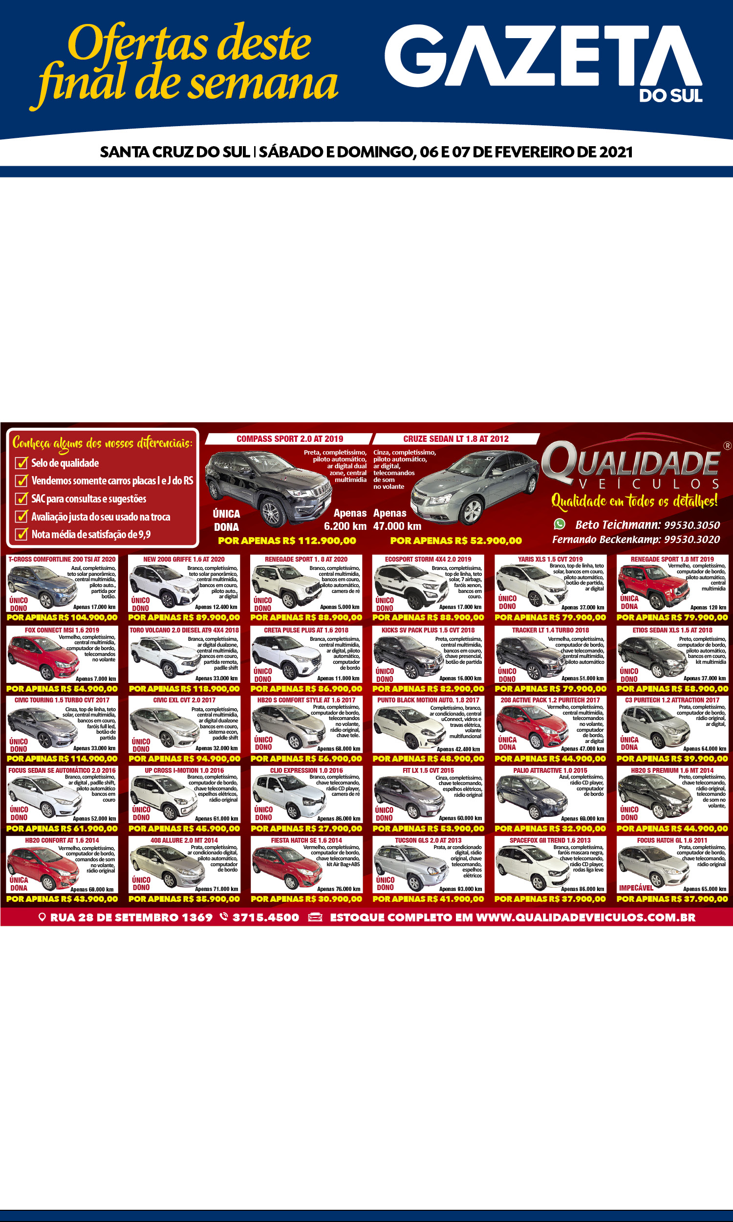 O suplemento de Classificados, que circula nas edições de terças, quintas e sábados, é um dos mais tradicionais da Gazeta do Sul, como vitrine e canal de negócios, de oferta, compra e venda em toda a região central do Rio Grande do Sul. E, para enriquecer pesquisas de produtos e serviços e possibilitar resultado ainda melhor a usuários e parceiros, nos anúncios de clientes cadastrados, o leitor tem acesso direto com link ao site do anunciante, onde poderá verificar mais detalhes sobre os itens. Confira: