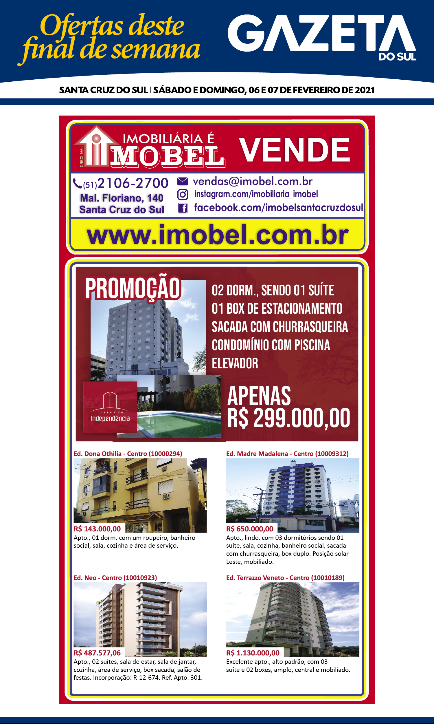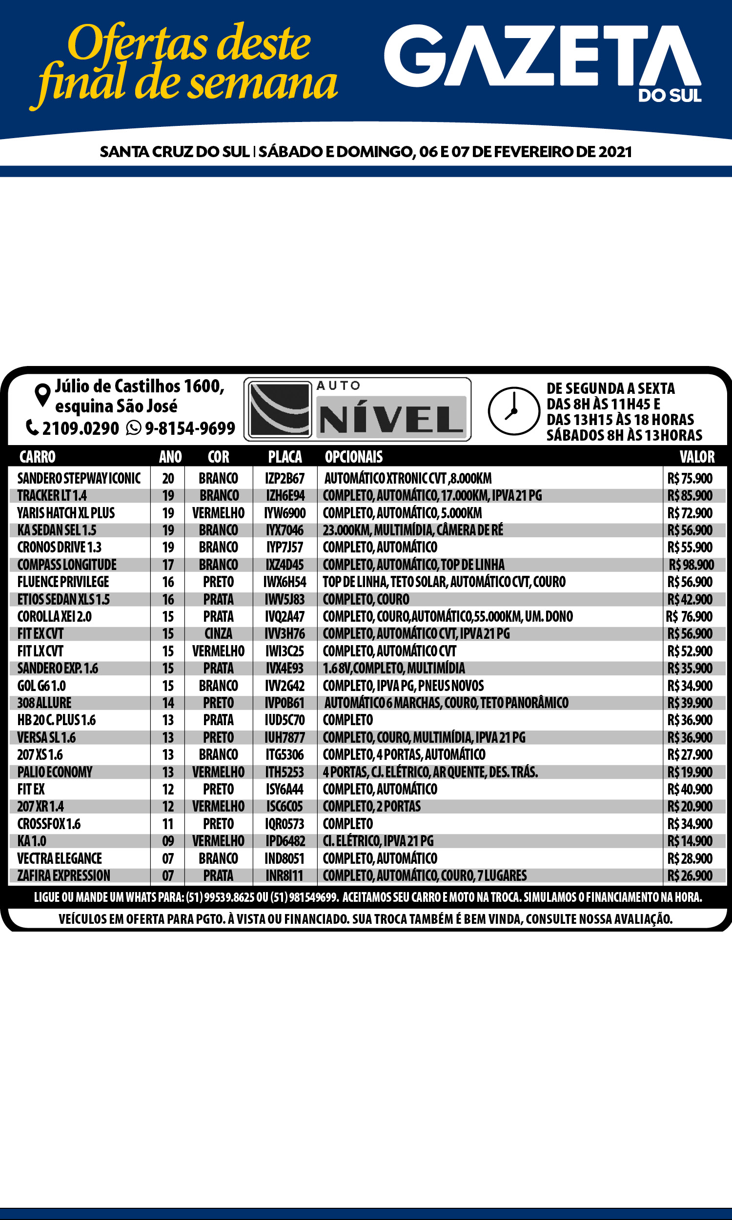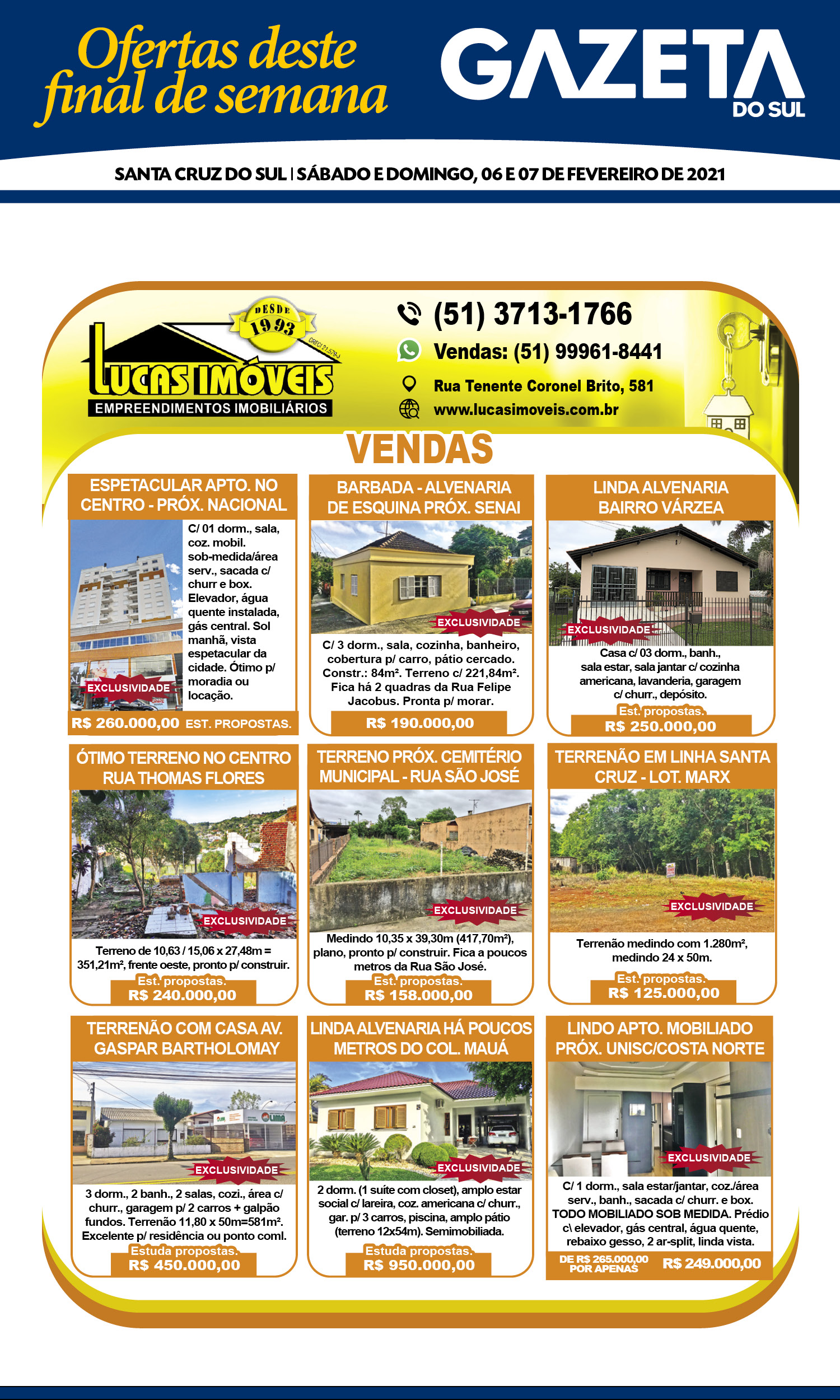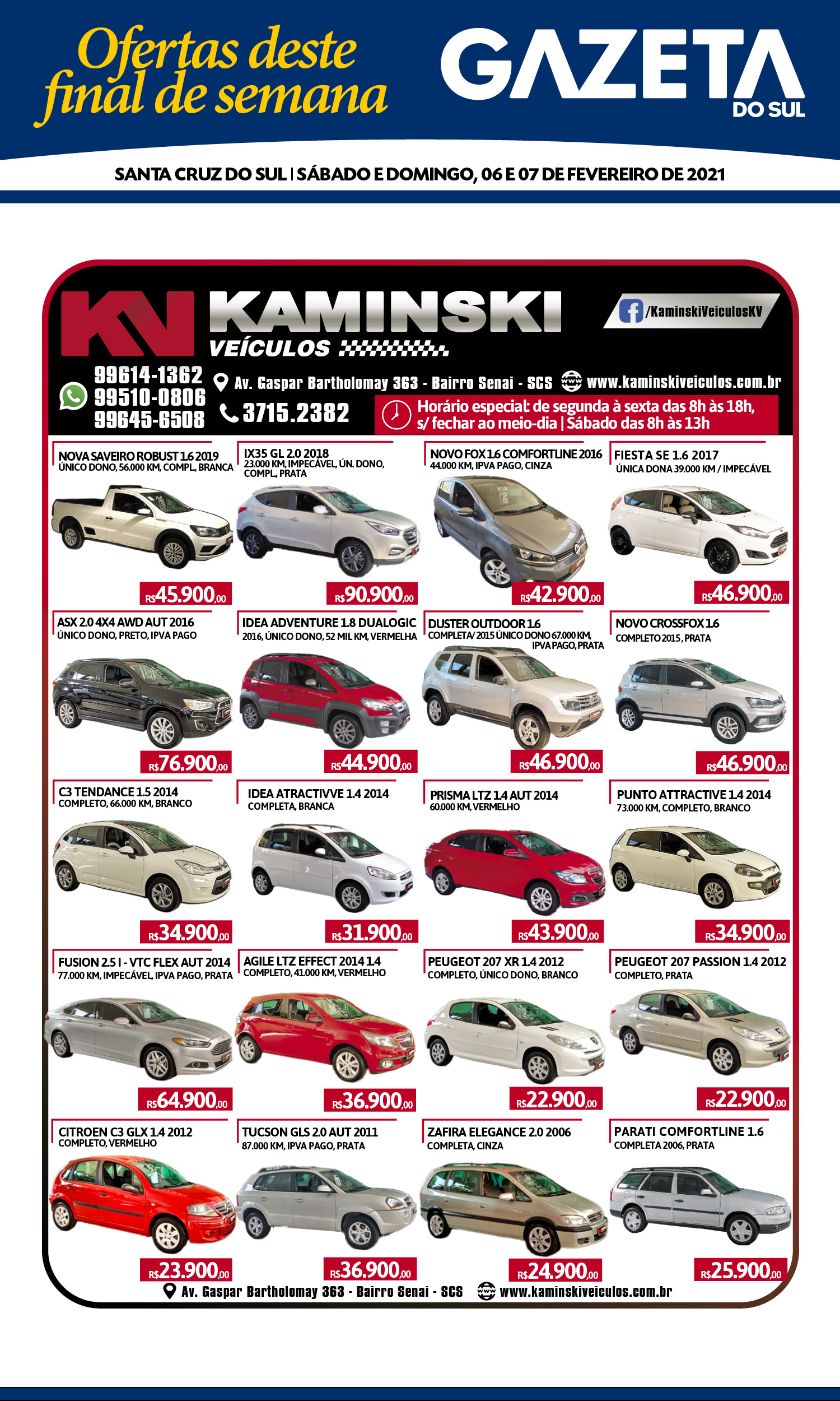 O suplemento de Classificados, que circula nas edições de terças, quintas e sábados, é um dos mais tradicionais da Gazeta do Sul, como vitrine e canal de negócios, de oferta, compra e venda em toda a região central do Rio Grande do Sul. E, para enriquecer pesquisas de produtos e serviços e possibilitar resultado ainda melhor a usuários e parceiros, nos anúncios de clientes cadastrados, o leitor tem acesso direto com link ao site do anunciante, onde poderá verificar mais detalhes sobre os itens. Confira: