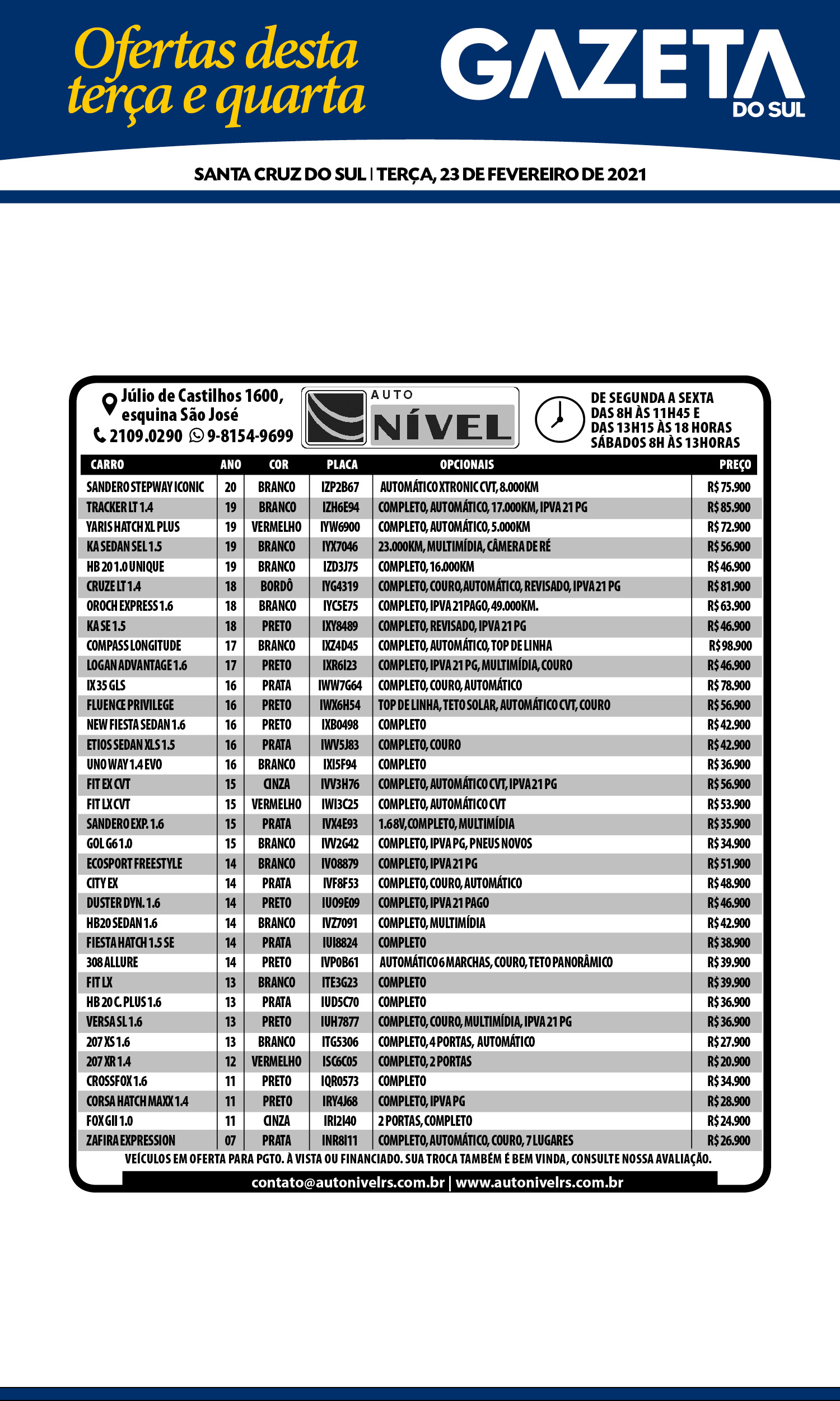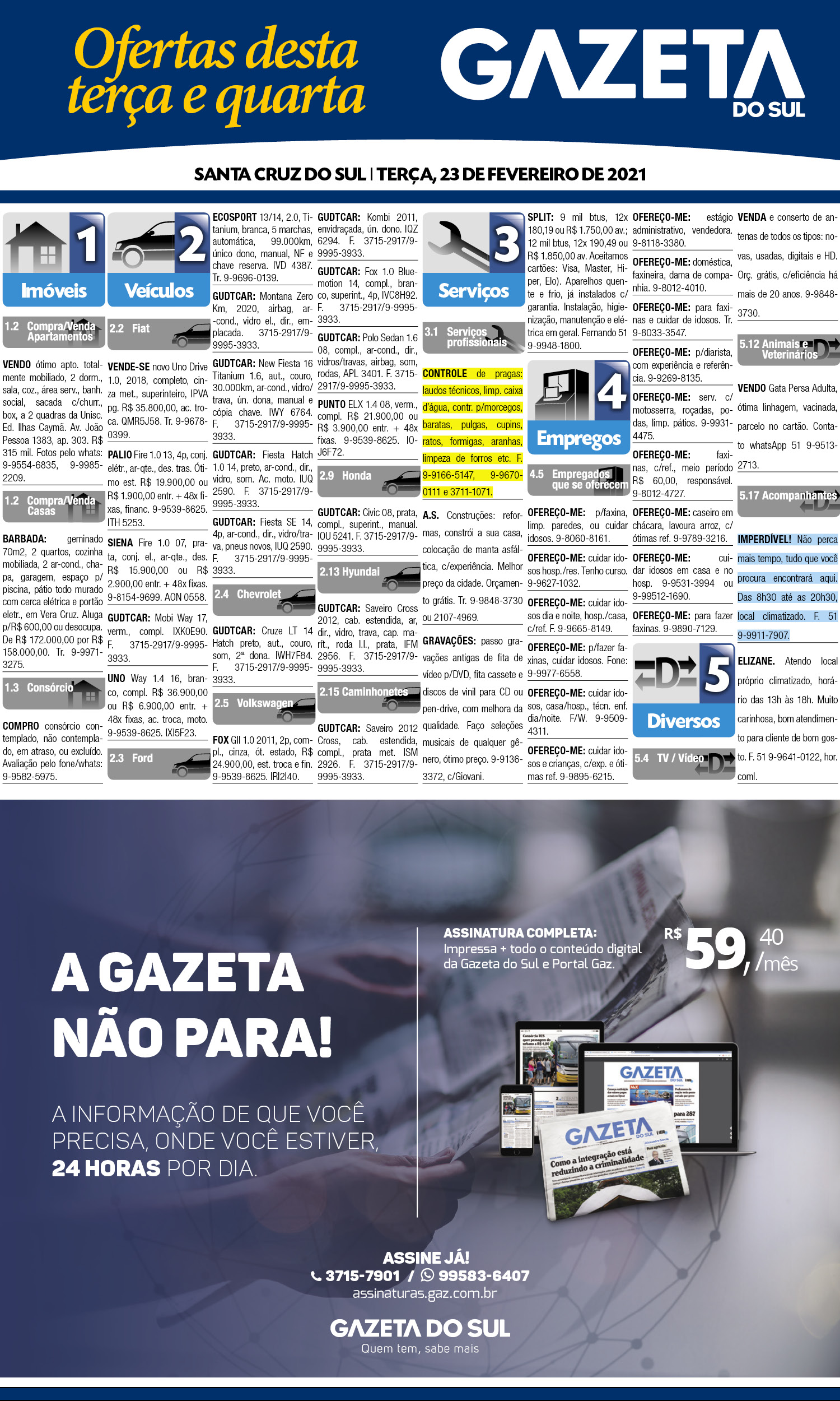 O suplemento de Classificados, que circula nas edições de terças, quintas e sábados, é um dos mais tradicionais da Gazeta do Sul, como vitrine e canal de negócios, de oferta, compra e venda em toda a região central do Rio Grande do Sul. E, para enriquecer pesquisas de produtos e serviços e possibilitar resultado ainda melhor a usuários e parceiros, nos anúncios de clientes cadastrados, o leitor tem acesso direto com link ao site do anunciante, onde poderá verificar mais detalhes sobre os itens. Confira: