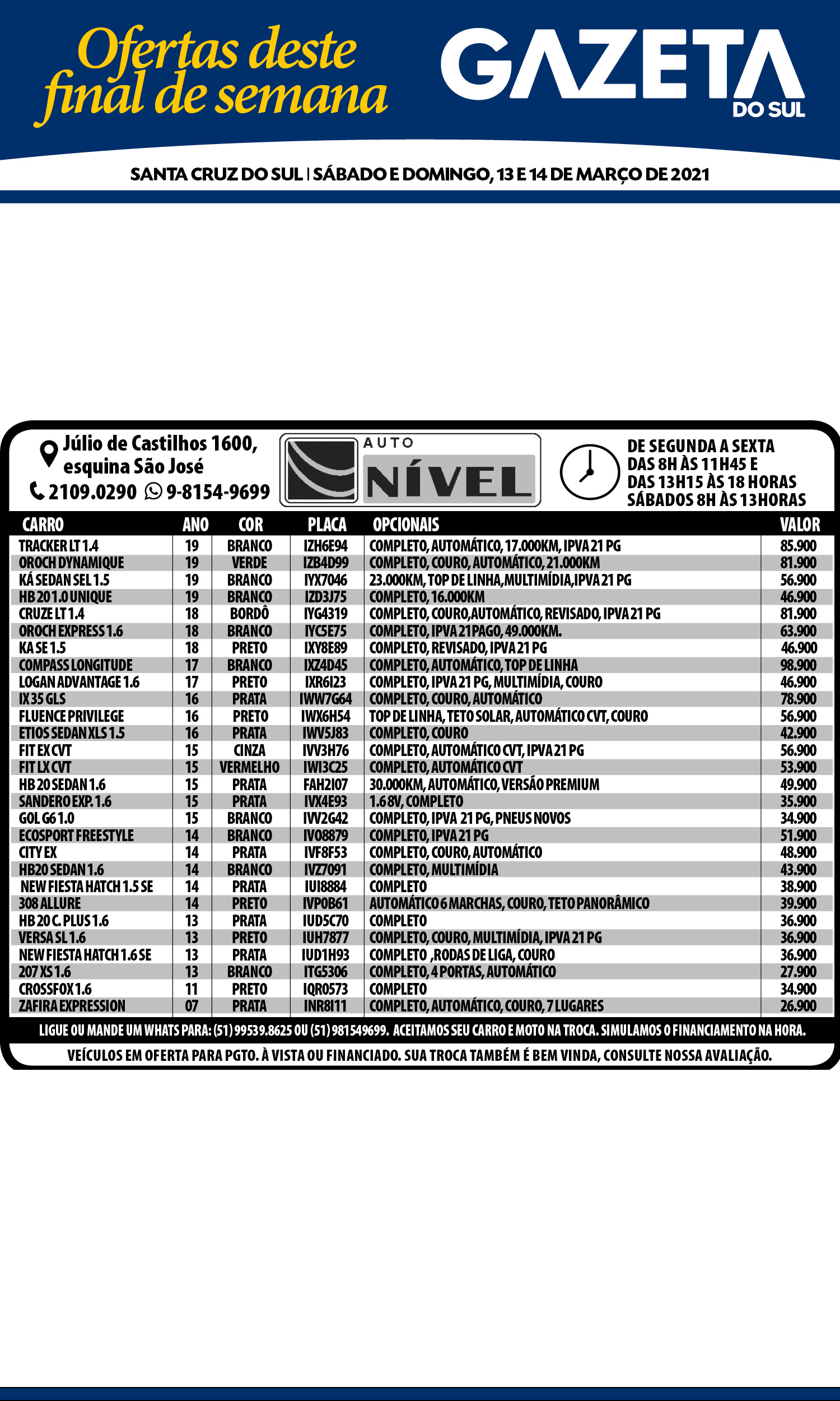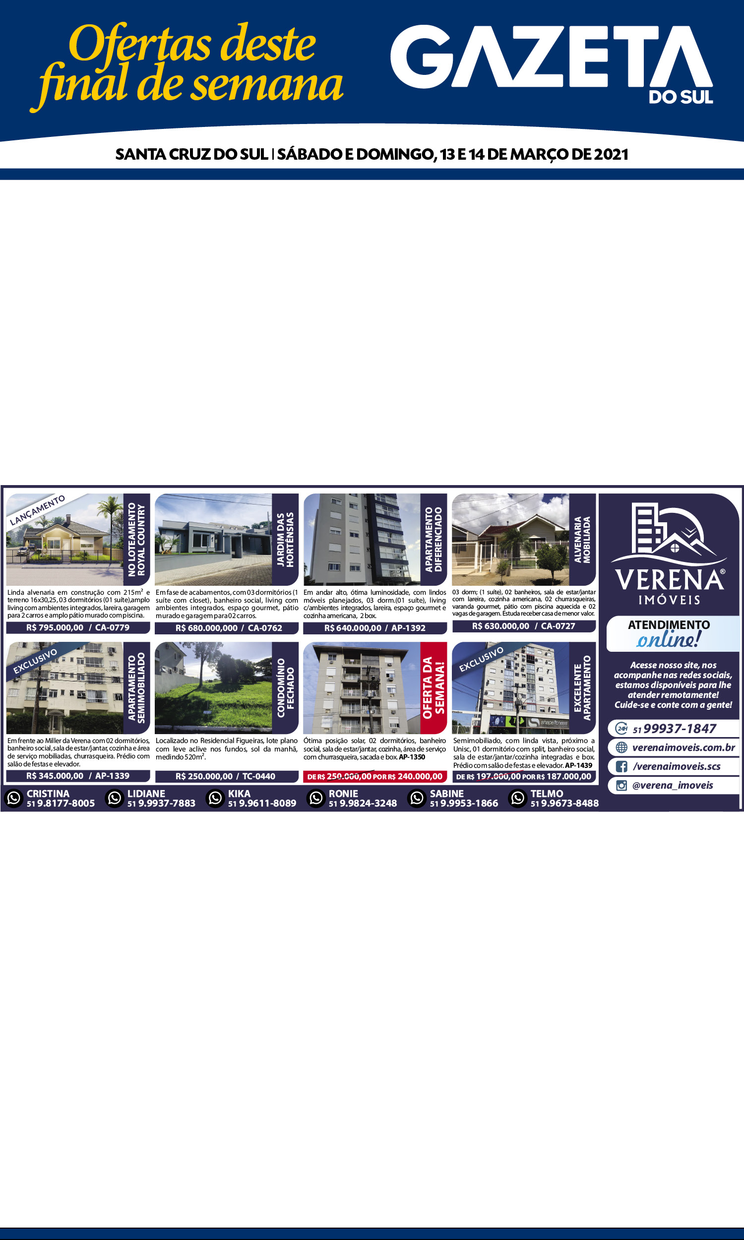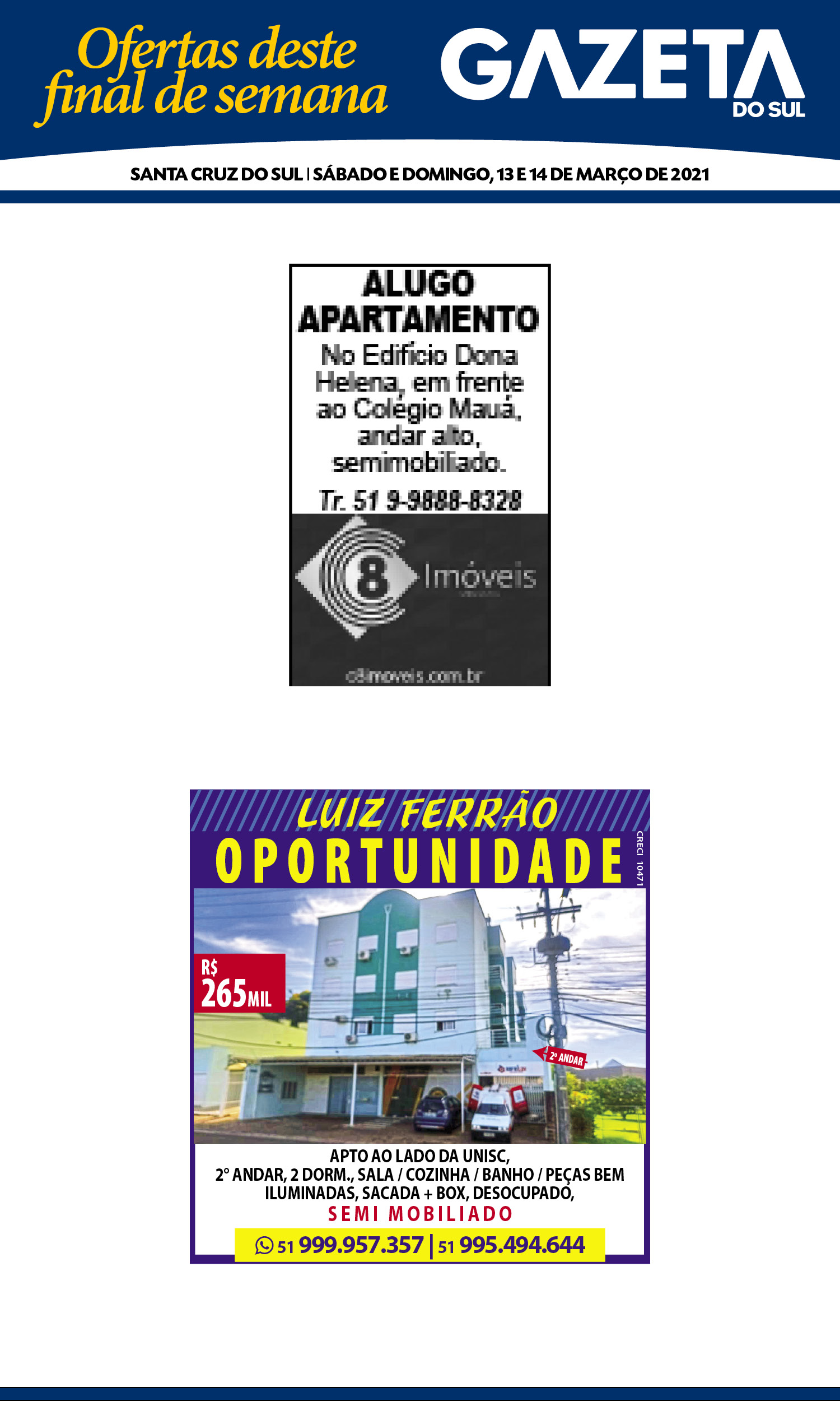 O suplemento de Classificados, que circula nas edições de terças, quintas e sábados, é um dos mais tradicionais da Gazeta do Sul, como vitrine e canal de negócios, de oferta, compra e venda em toda a região central do Rio Grande do Sul. E, para enriquecer pesquisas de produtos e serviços e possibilitar resultado ainda melhor a usuários e parceiros, nos anúncios de clientes cadastrados, o leitor tem acesso direto com link ao site do anunciante, onde poderá verificar mais detalhes sobre os itens. Confira: