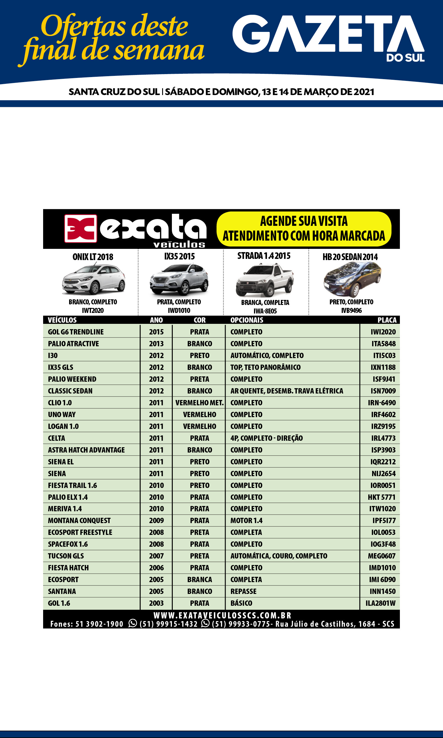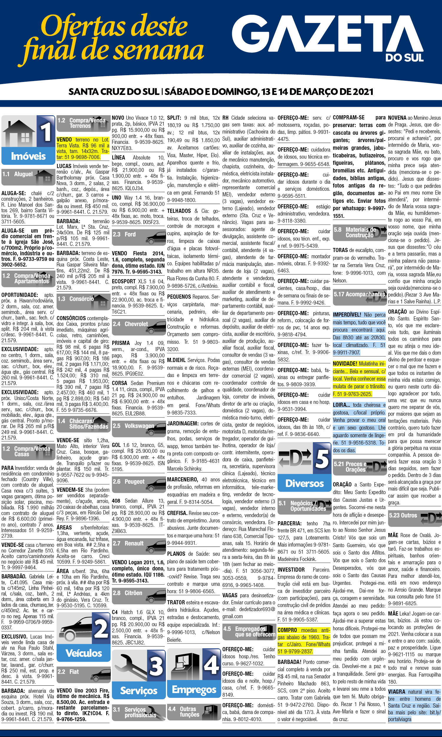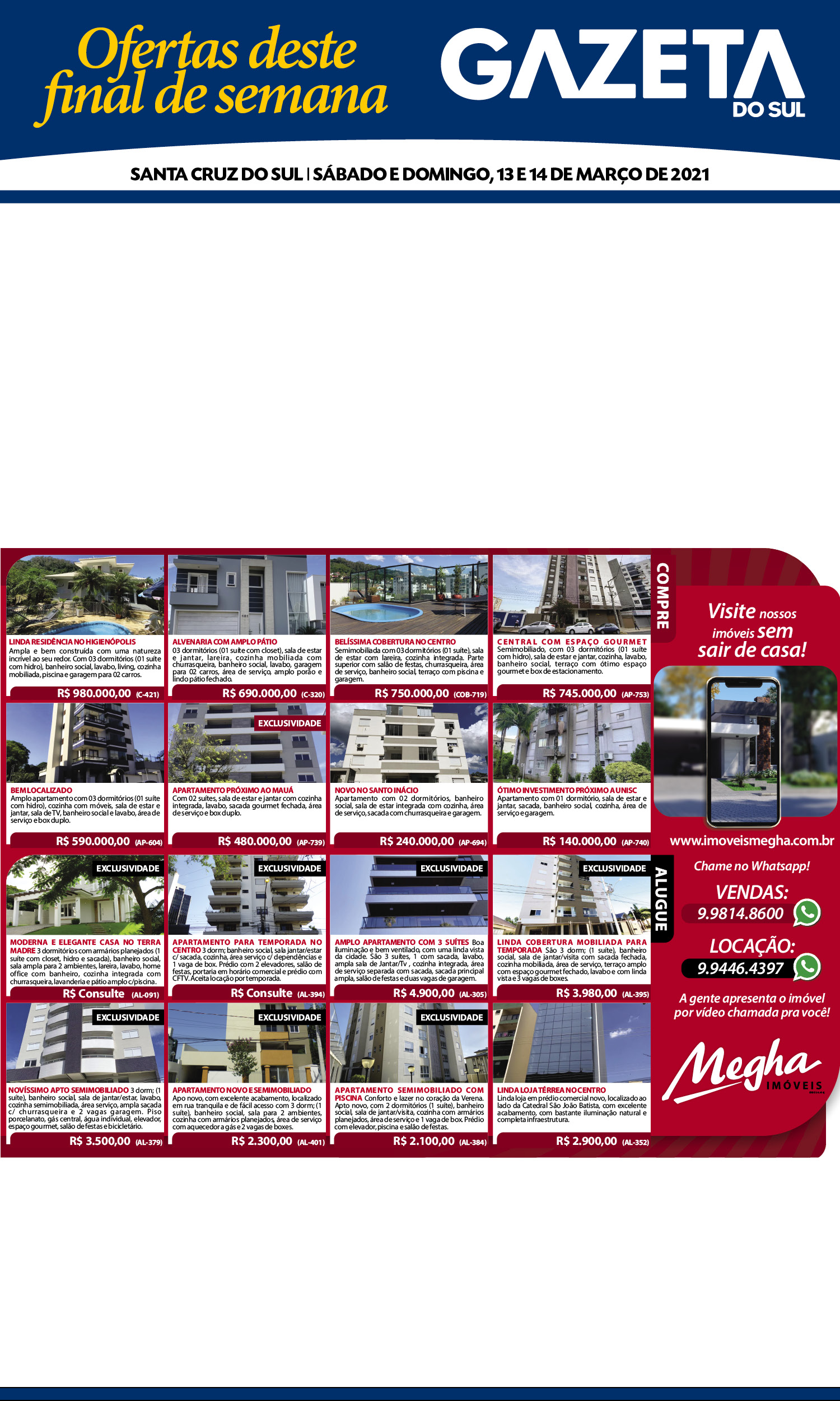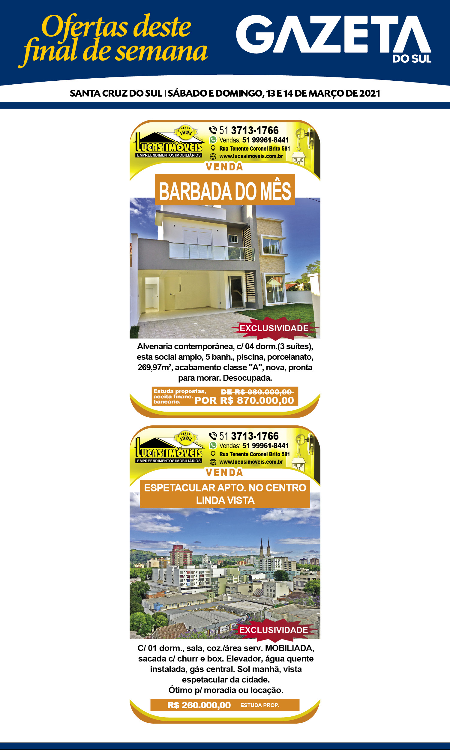 O suplemento de Classificados, que circula nas edições de terças, quintas e sábados, é um dos mais tradicionais da Gazeta do Sul, como vitrine e canal de negócios, de oferta, compra e venda em toda a região central do Rio Grande do Sul. E, para enriquecer pesquisas de produtos e serviços e possibilitar resultado ainda melhor a usuários e parceiros, nos anúncios de clientes cadastrados, o leitor tem acesso direto com link ao site do anunciante, onde poderá verificar mais detalhes sobre os itens. Confira: