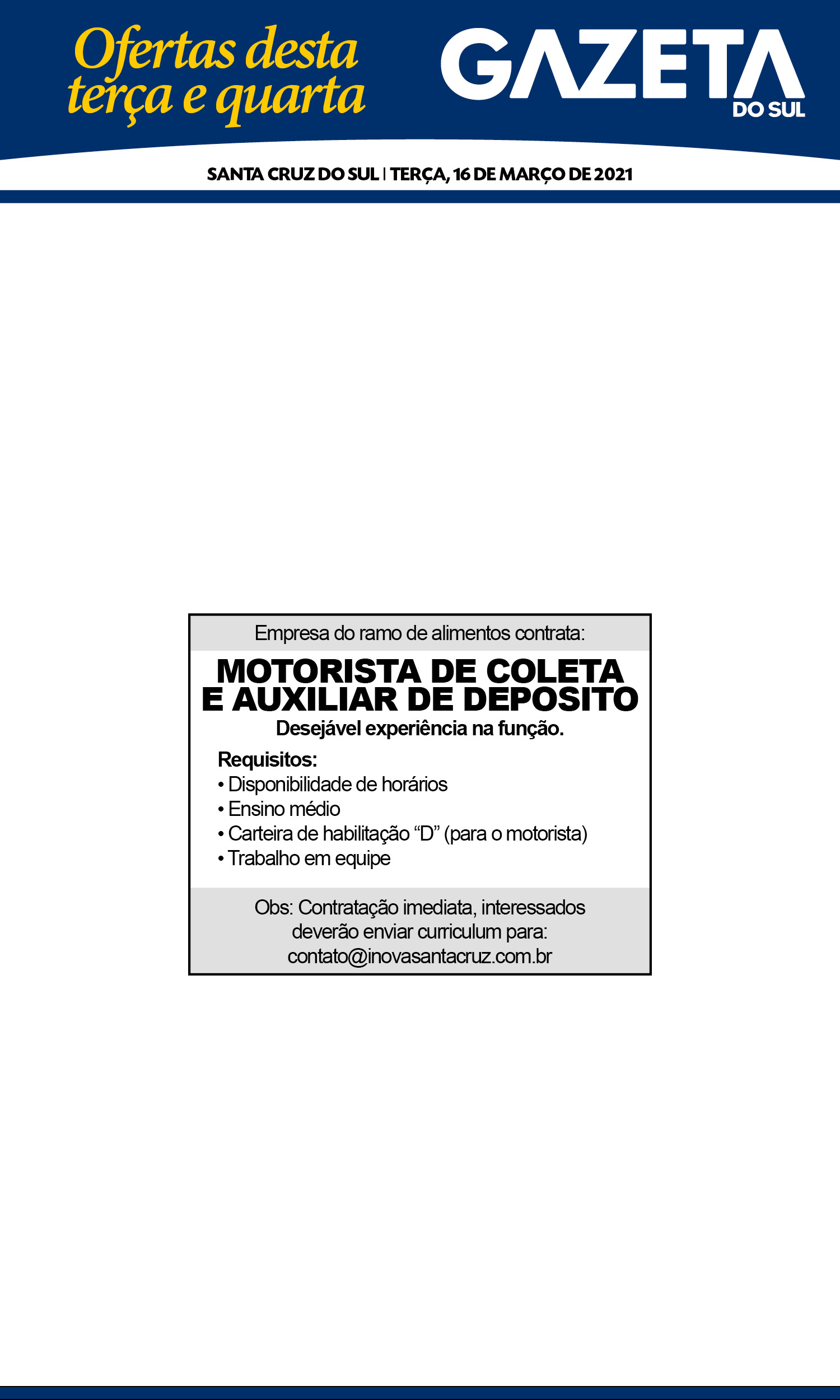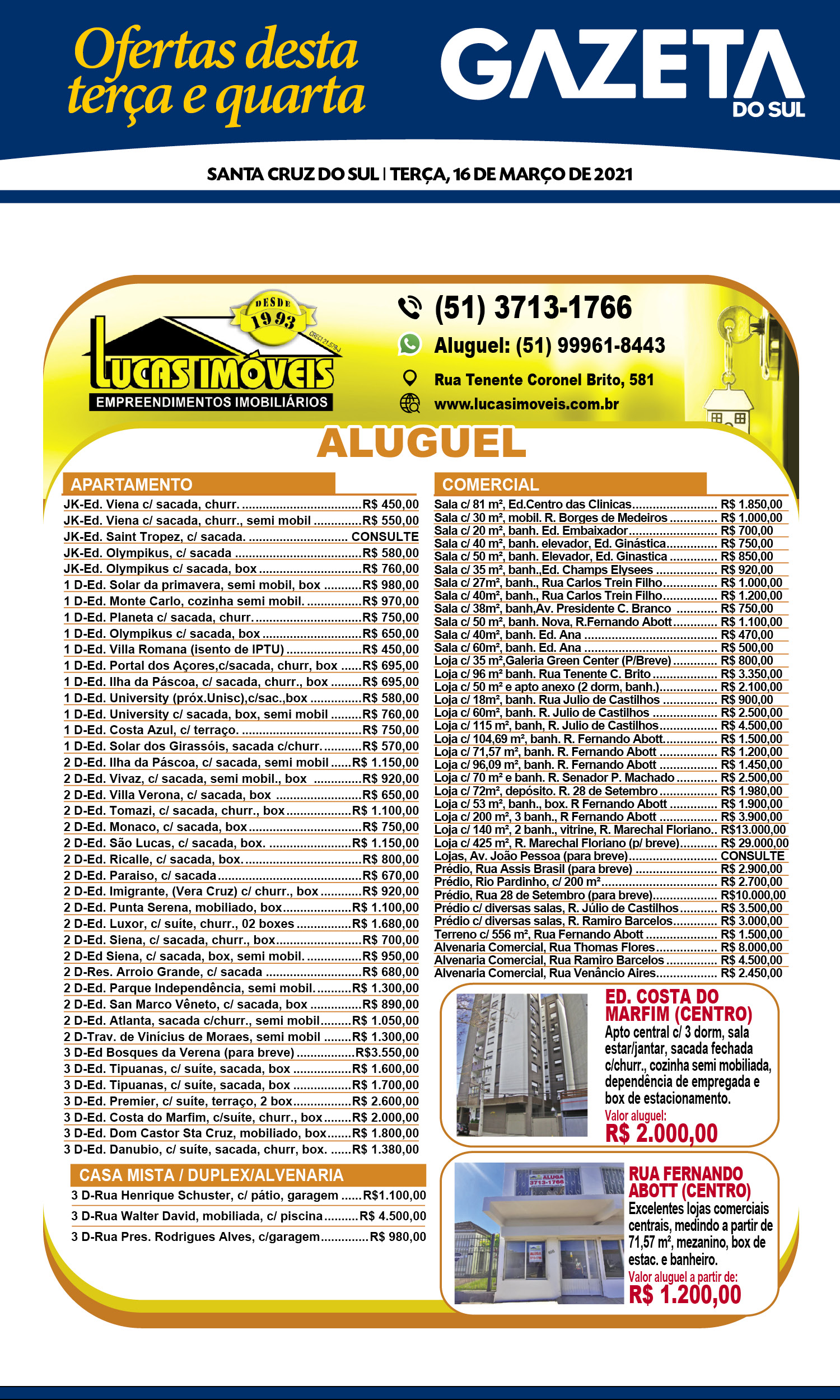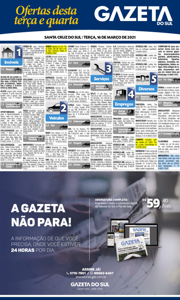 O suplemento de Classificados, que circula nas edições de terças, quintas e sábados, é um dos mais tradicionais da Gazeta do Sul, como vitrine e canal de negócios, de oferta, compra e venda em toda a região central do Rio Grande do Sul. E, para enriquecer pesquisas de produtos e serviços e possibilitar resultado ainda melhor a usuários e parceiros, nos anúncios de clientes cadastrados, o leitor tem acesso direto com link ao site do anunciante, onde poderá verificar mais detalhes sobre os itens. Confira: