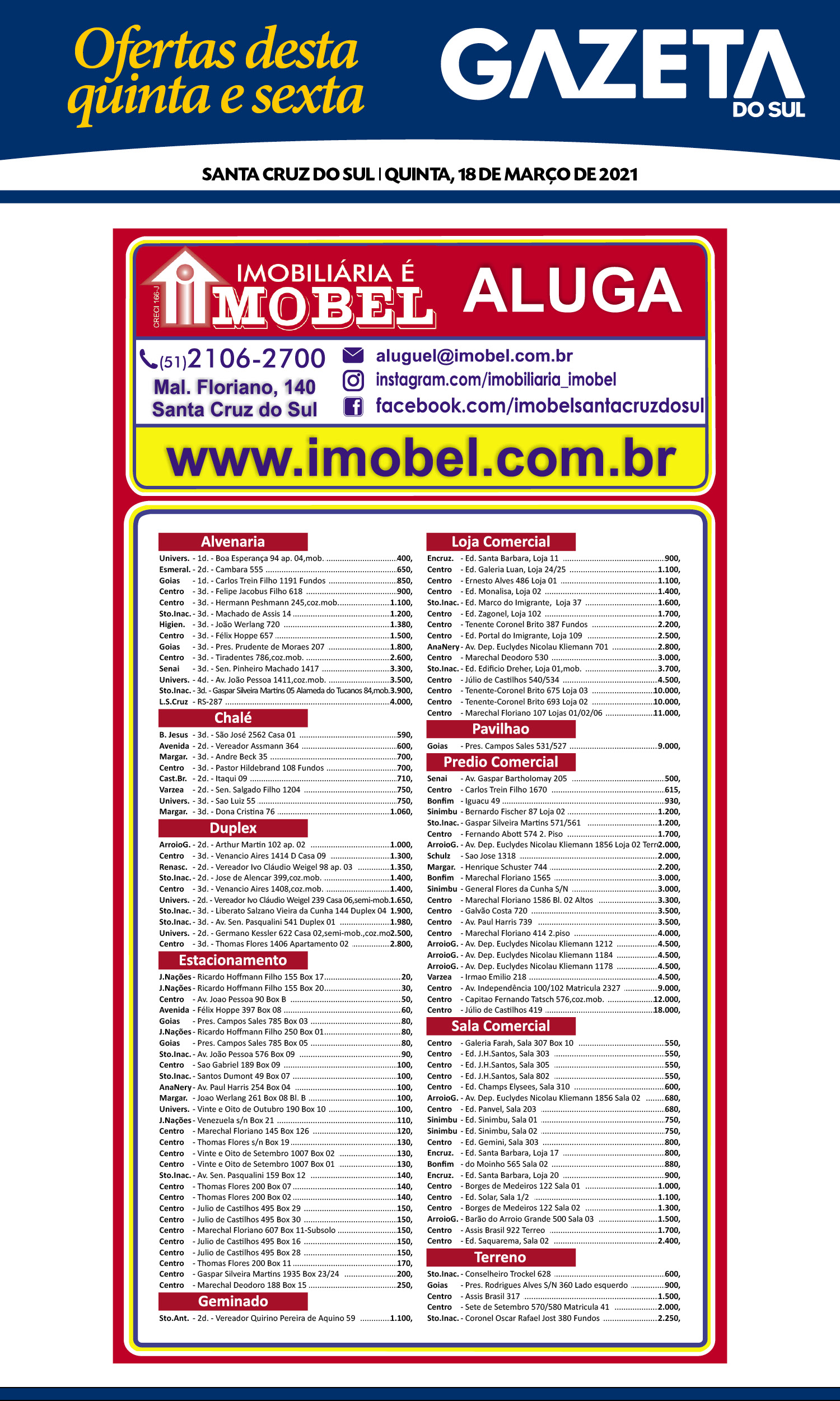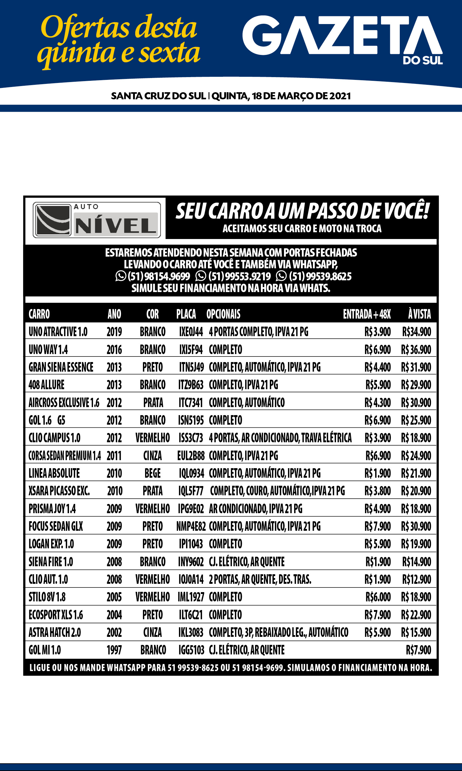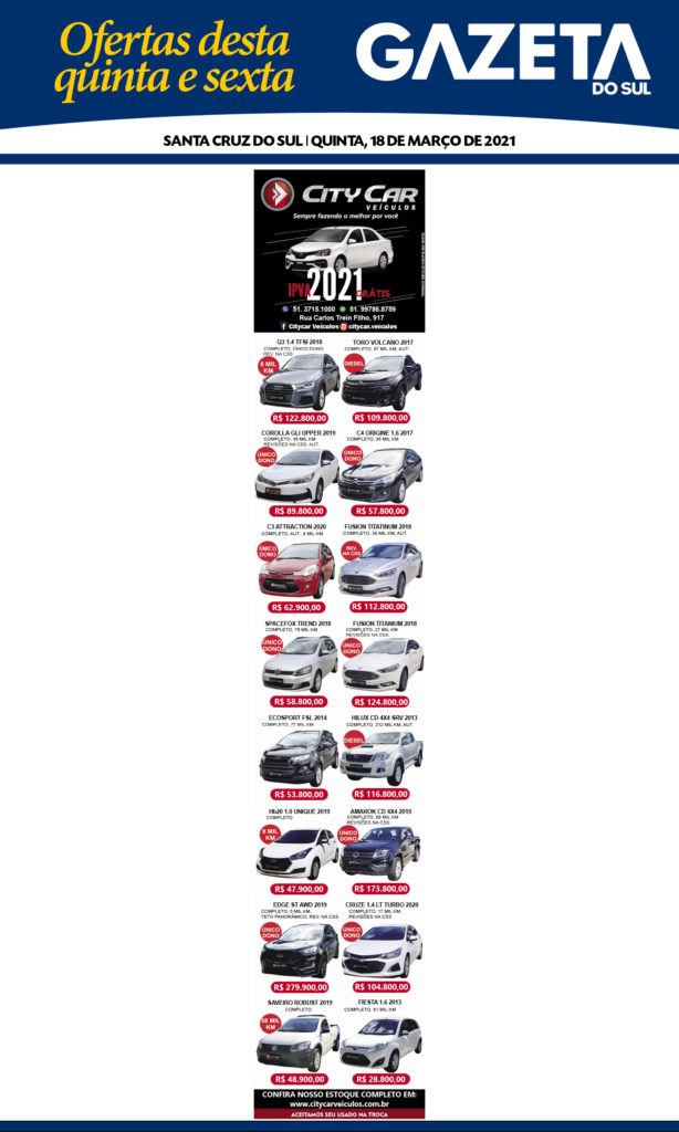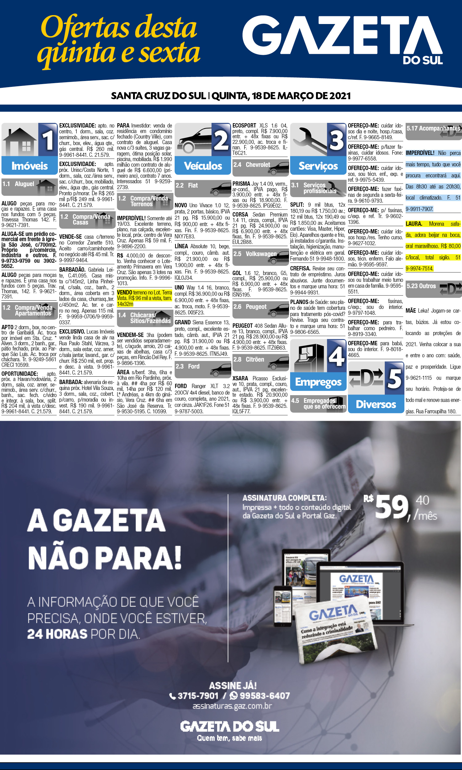 O suplemento de Classificados, que circula nas edições de terças, quintas e sábados, é um dos mais tradicionais da Gazeta do Sul, como vitrine e canal de negócios, de oferta, compra e venda em toda a região central do Rio Grande do Sul. E, para enriquecer pesquisas de produtos e serviços e possibilitar resultado ainda melhor a usuários e parceiros, nos anúncios de clientes cadastrados, o leitor tem acesso direto com link ao site do anunciante, onde poderá verificar mais detalhes sobre os itens. Confira: