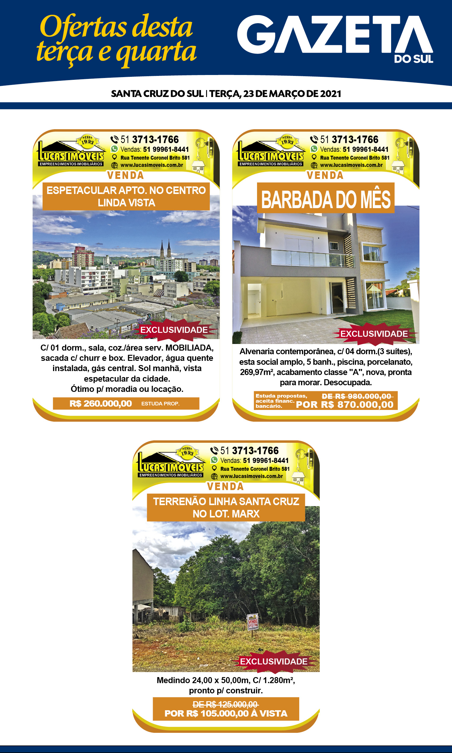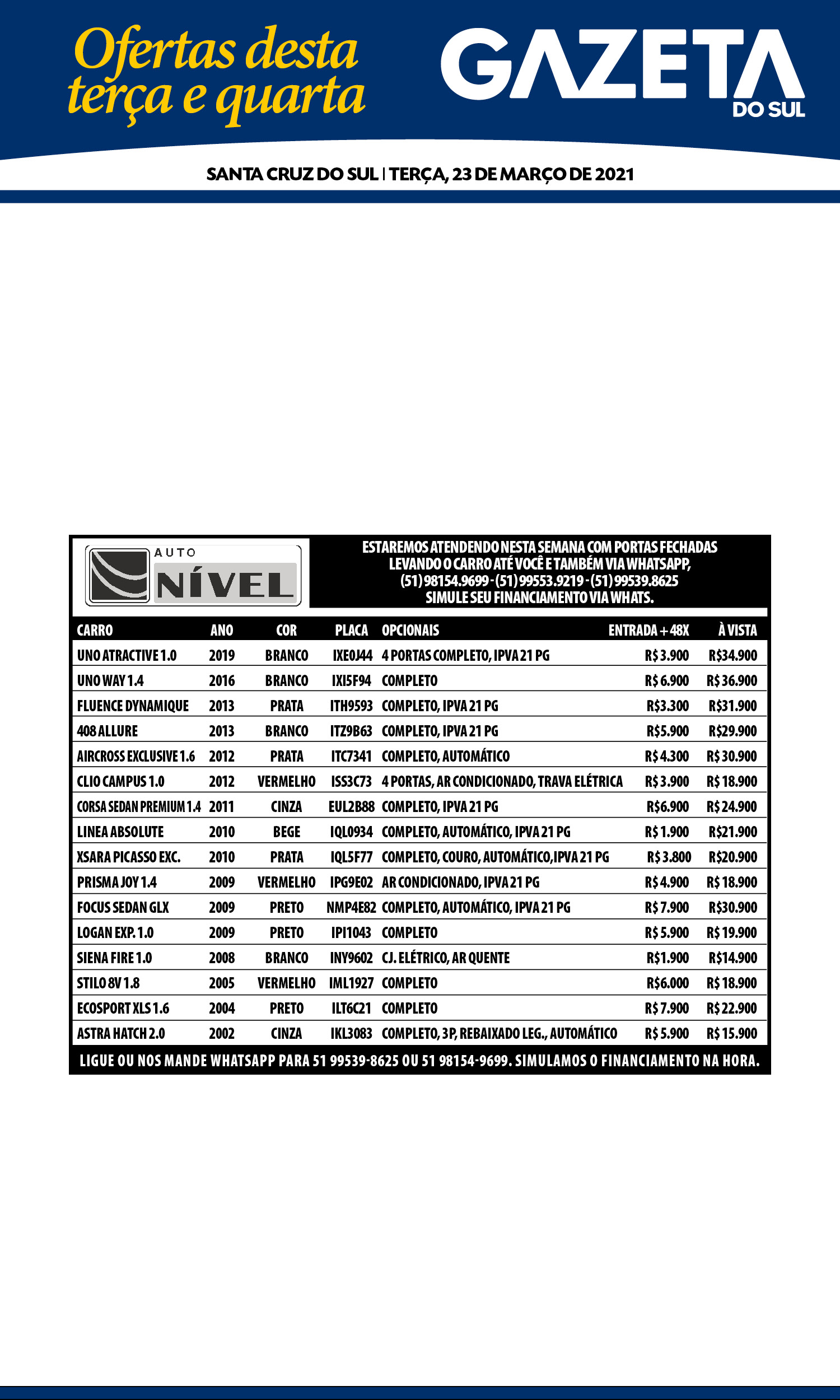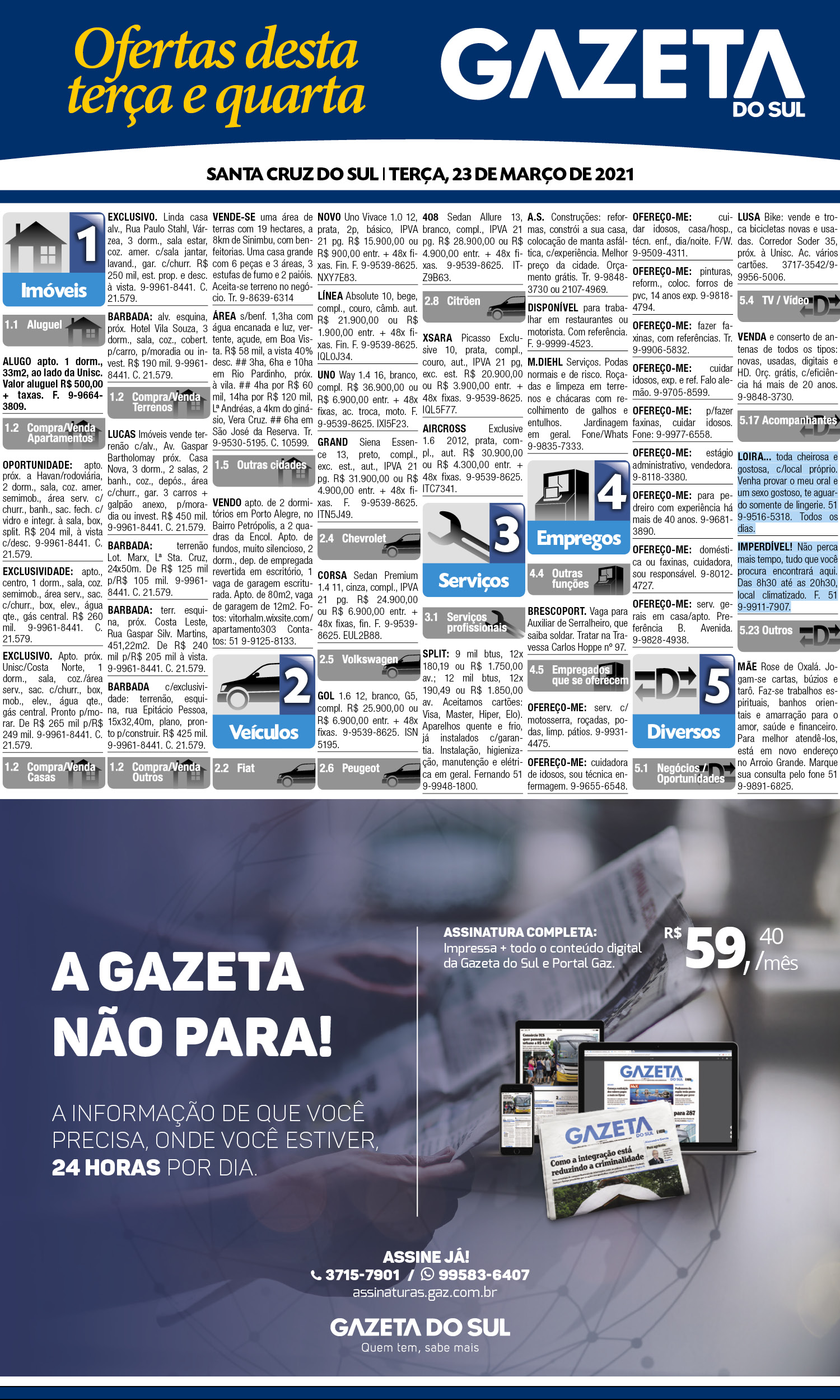 O suplemento de Classificados, que circula nas edições de terças, quintas e sábados, é um dos mais tradicionais da Gazeta do Sul, como vitrine e canal de negócios, de oferta, compra e venda em toda a região central do Rio Grande do Sul. E, para enriquecer pesquisas de produtos e serviços e possibilitar resultado ainda melhor a usuários e parceiros, nos anúncios de clientes cadastrados, o leitor tem acesso direto com link ao site do anunciante, onde poderá verificar mais detalhes sobre os itens. Confira: