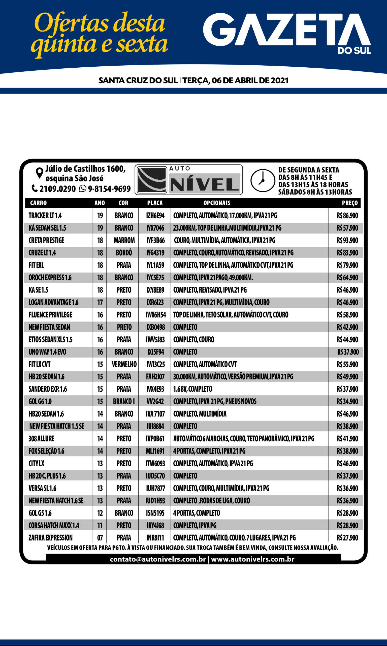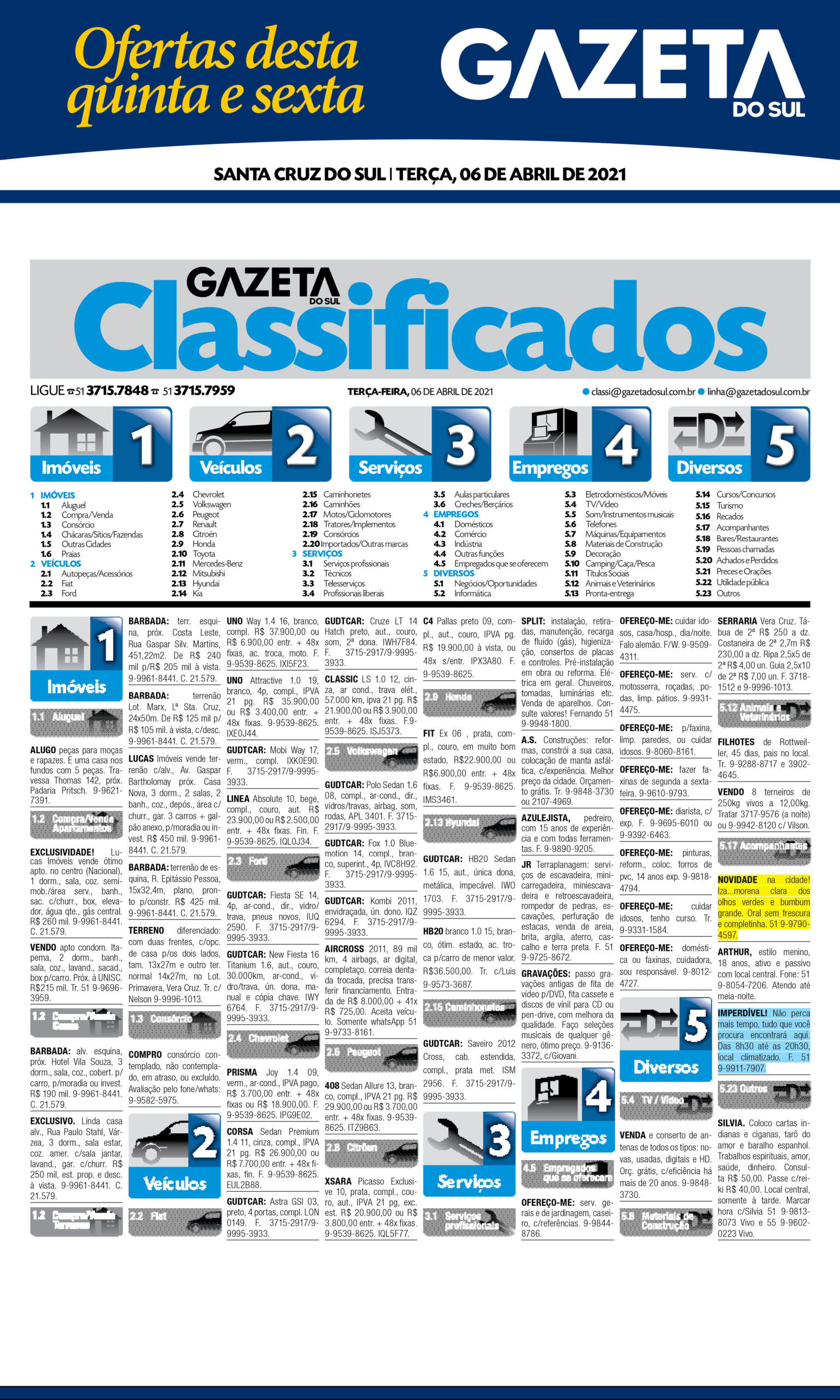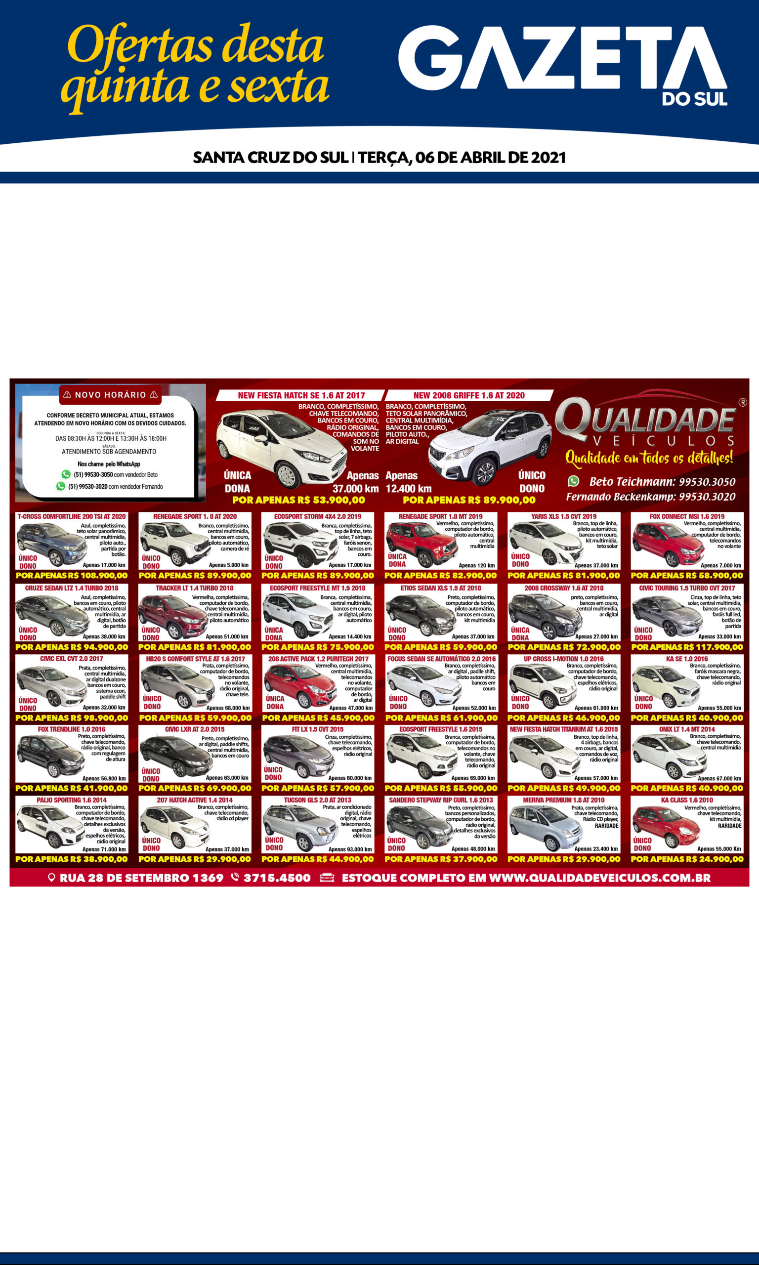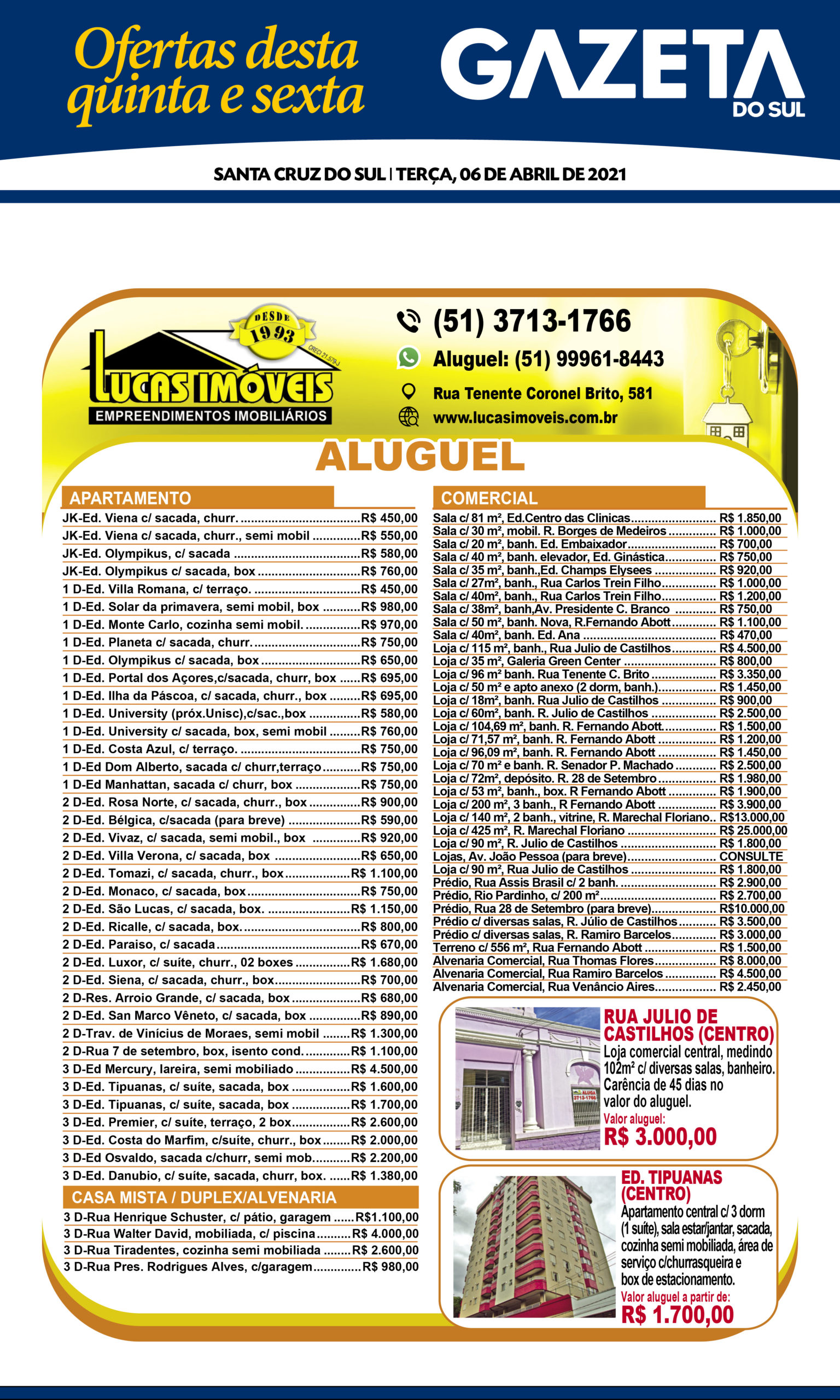 O suplemento de Classificados, que circula nas edições de terças, quintas e sábados, é um dos mais tradicionais da Gazeta do Sul, como vitrine e canal de negócios, de oferta, compra e venda em toda a região central do Rio Grande do Sul. E, para enriquecer pesquisas de produtos e serviços e possibilitar resultado ainda melhor a usuários e parceiros, nos anúncios de clientes cadastrados, o leitor tem acesso direto com link ao site do anunciante, onde poderá verificar mais detalhes sobre os itens. Confira: