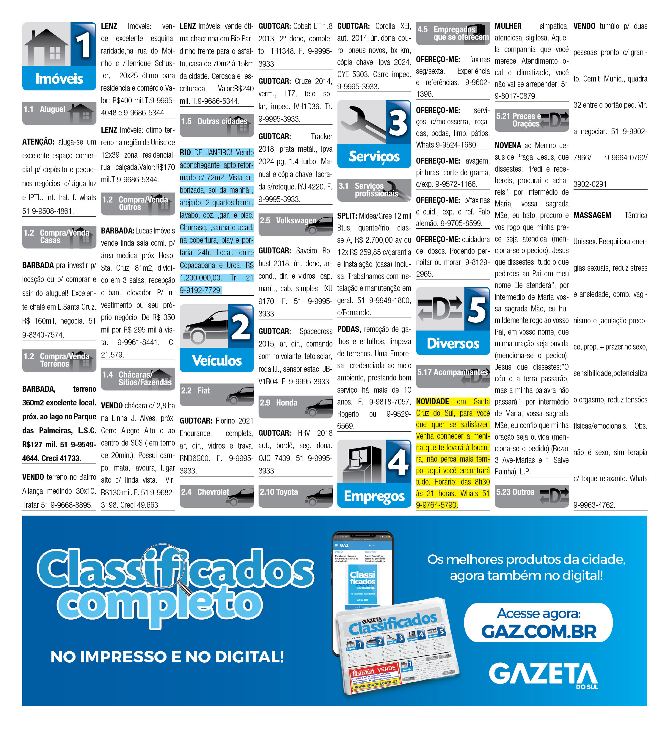 O suplemento de Classificados, que circula nas edições de terças, quintas e sábados, é um dos mais tradicionais da Gazeta do Sul, como vitrine e canal de negócios, de oferta, compra e venda em toda a região central do Rio Grande do Sul. E, para enriquecer pesquisas de produtos e serviços e possibilitar resultado ainda melhor a usuários e parceiros, nos anúncios de clientes cadastrados, o leitor tem acesso direto com link ao site do anunciante, onde poderá verificar mais detalhes sobre os itens. Confira as ofertas: