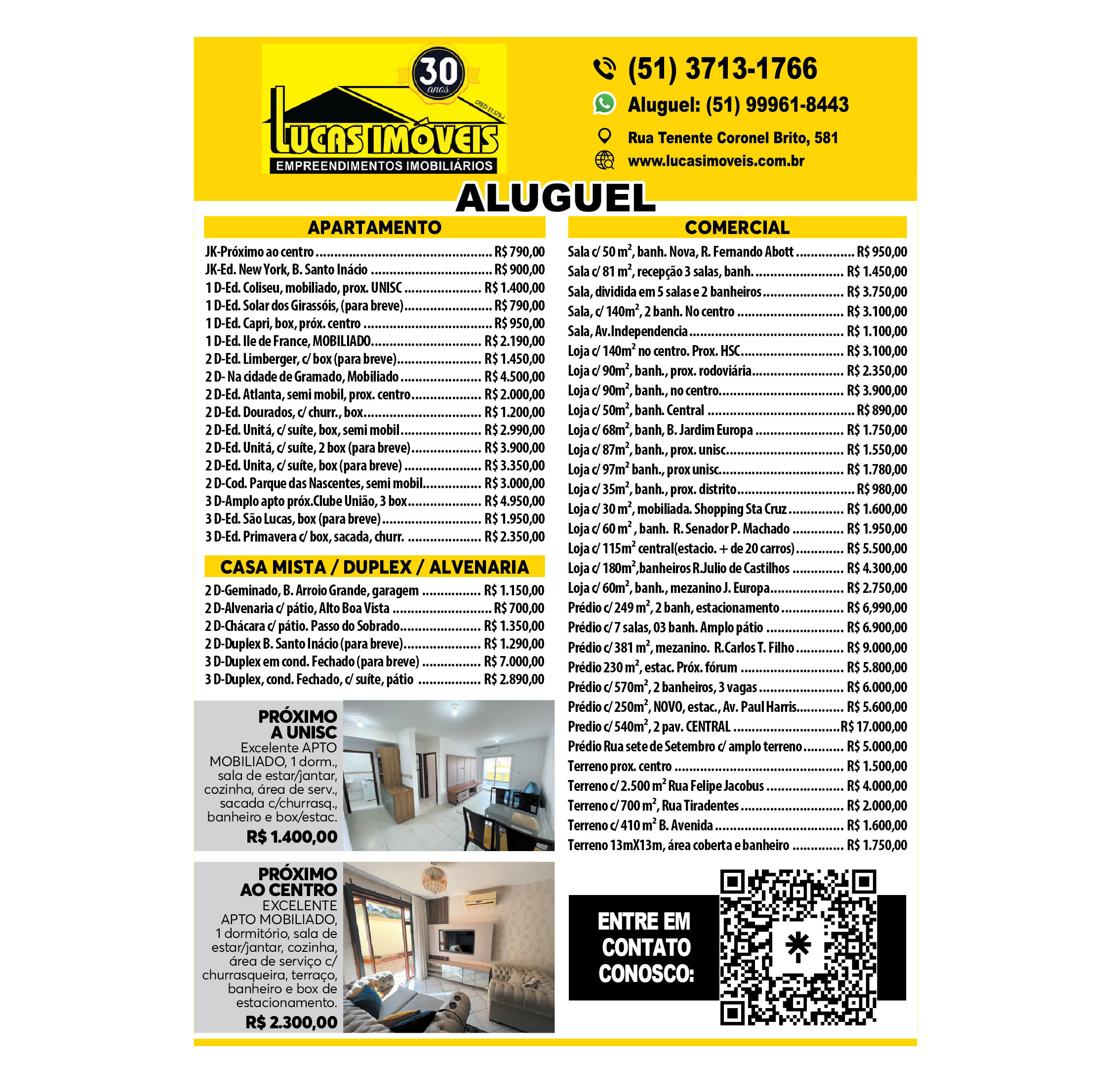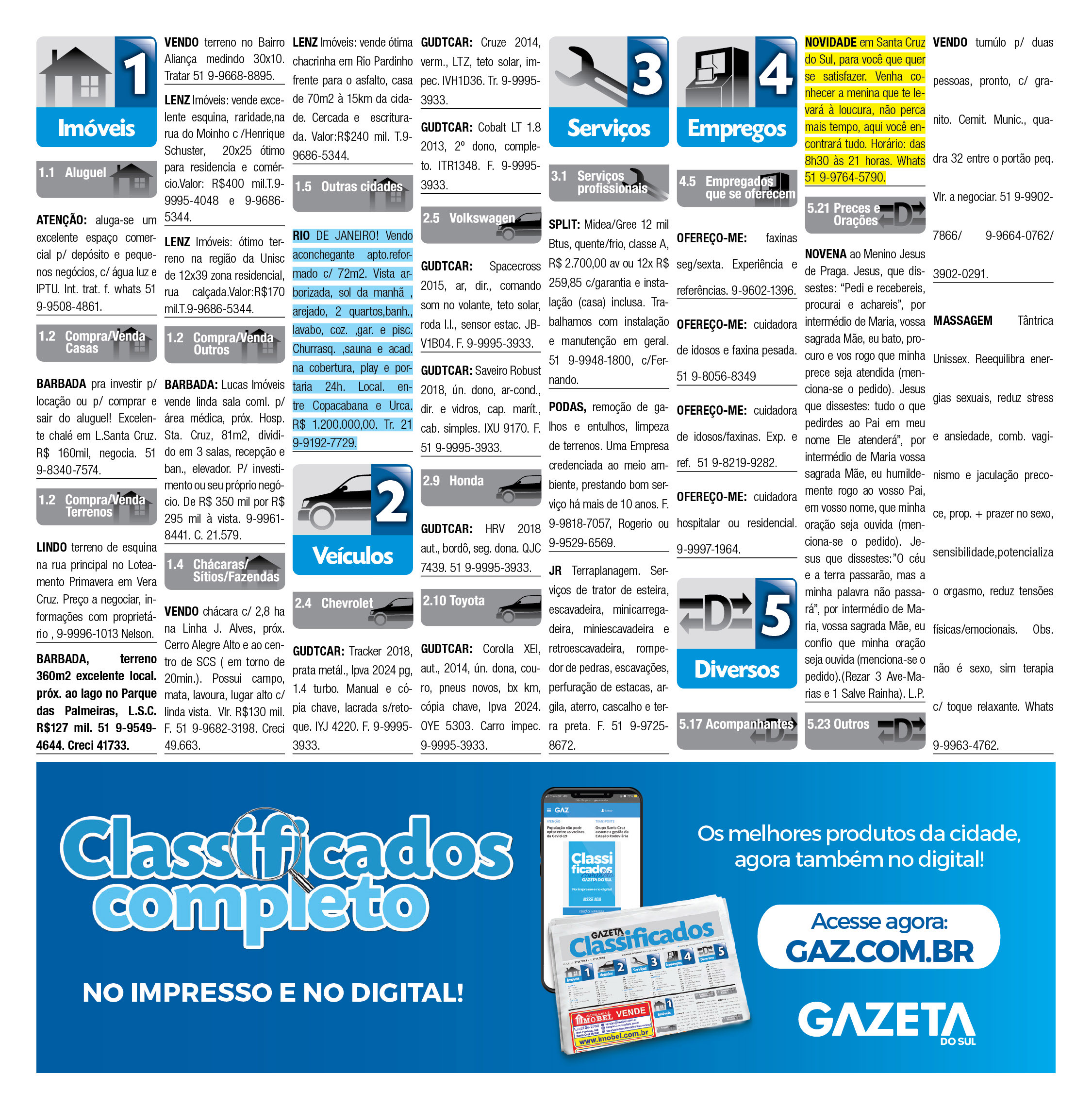 O suplemento de Classificados, que circula nas edições de terças, quintas e sábados, é um dos mais tradicionais da Gazeta do Sul, como vitrine e canal de negócios, de oferta, compra e venda em toda a região central do Rio Grande do Sul. E, para enriquecer pesquisas de produtos e serviços e possibilitar resultado ainda melhor a usuários e parceiros, nos anúncios de clientes cadastrados, o leitor tem acesso direto com link ao site do anunciante, onde poderá verificar mais detalhes sobre os itens. Confira as ofertas: