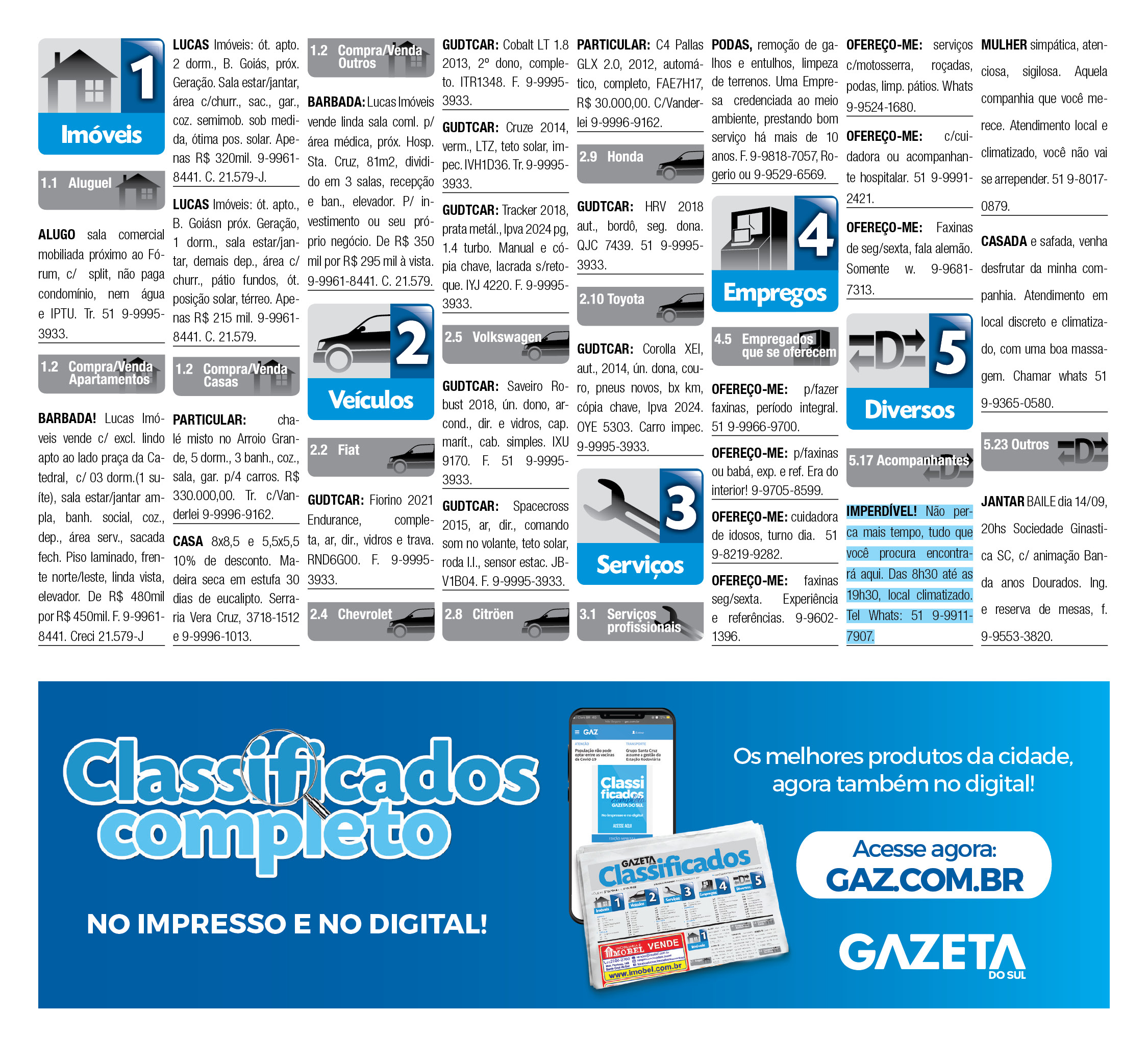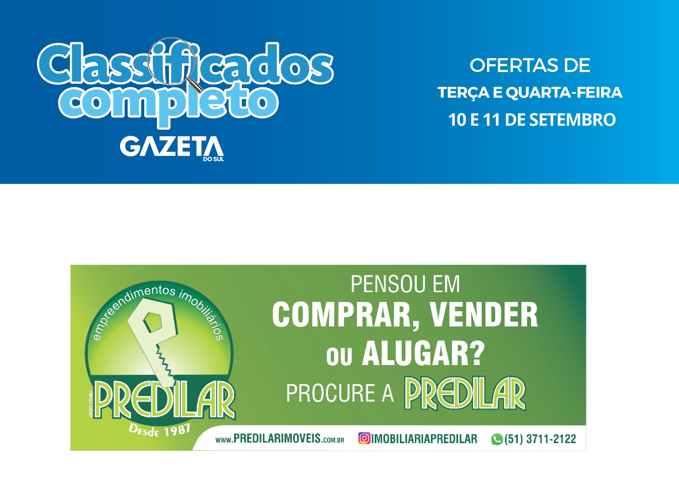 O suplemento de Classificados, que circula nas edições de terças, quintas e sábados, é um dos mais tradicionais da Gazeta do Sul, como vitrine e canal de negócios, de oferta, compra e venda em toda a região central do Rio Grande do Sul. E, para enriquecer pesquisas de produtos e serviços e possibilitar resultado ainda melhor a usuários e parceiros, nos anúncios de clientes cadastrados, o leitor tem acesso direto com link ao site do anunciante, onde poderá verificar mais detalhes sobre os itens. Confira as ofertas:
