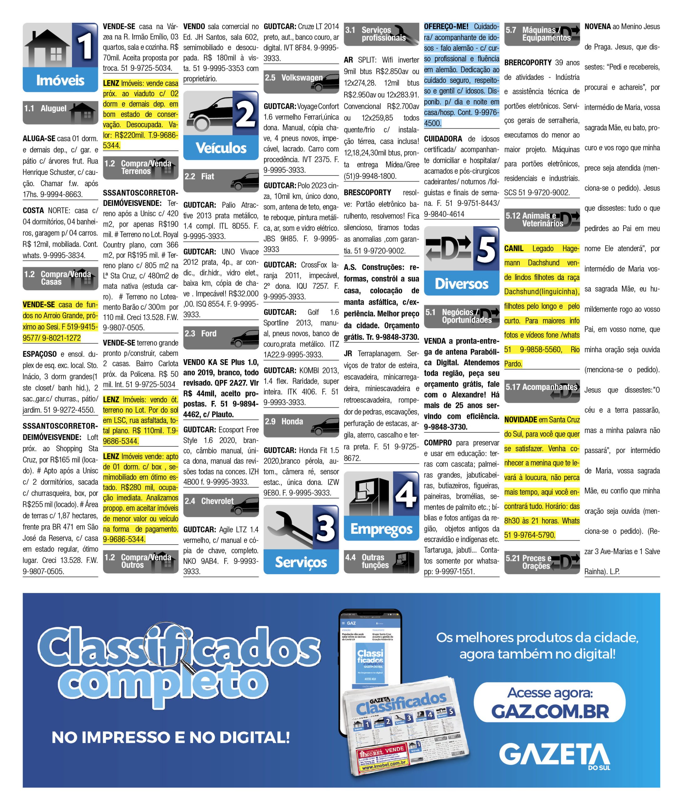 O suplemento de Classificados, que circula nas edições de terças, quintas e sábados, é um dos mais tradicionais da Gazeta do Sul, como vitrine e canal de negócios, de oferta, compra e venda em toda a região central do Rio Grande do Sul. E, para enriquecer pesquisas de produtos e serviços e possibilitar resultado ainda melhor a usuários e parceiros, nos anúncios de clientes cadastrados, o leitor tem acesso direto com link ao site do anunciante, onde poderá verificar mais detalhes sobre os itens. Confira as ofertas: