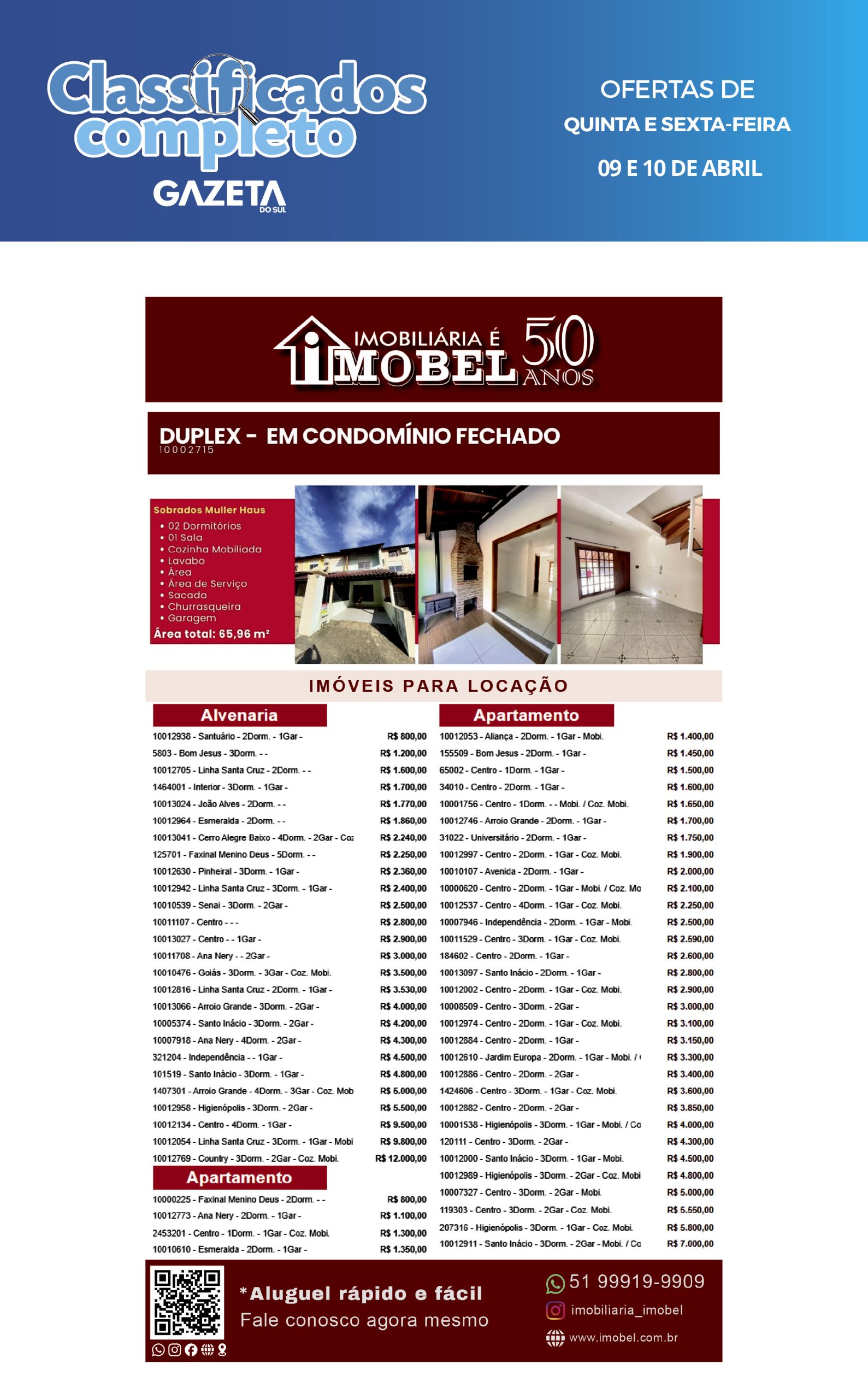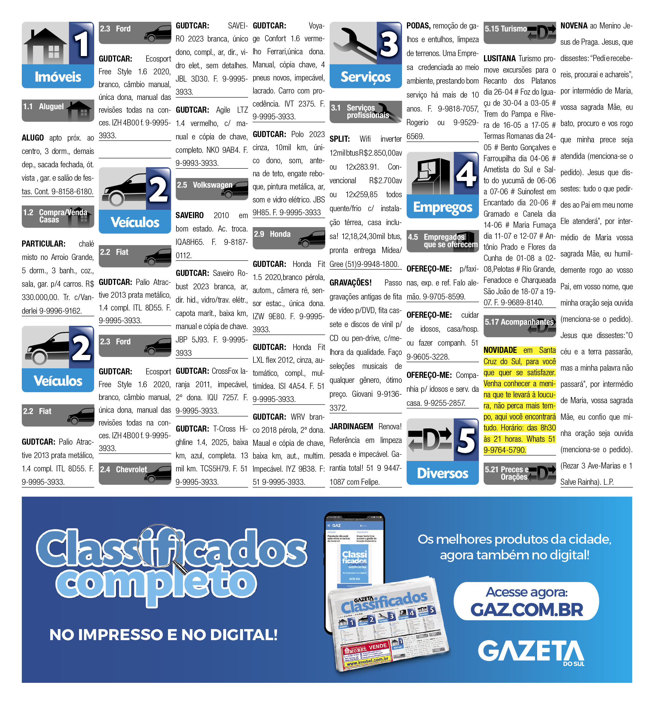 O suplemento de Classificados, que circula nas edições de terças, quintas e sábados, é um dos mais tradicionais da Gazeta do Sul, como vitrine e canal de negócios, de oferta, compra e venda em toda a região central do Rio Grande do Sul. E, para enriquecer pesquisas de produtos e serviços e possibilitar resultado ainda melhor a usuários e parceiros, nos anúncios de clientes cadastrados, o leitor tem acesso direto com link ao site do anunciante, onde poderá verificar mais detalhes sobre os itens. Confira as ofertas: