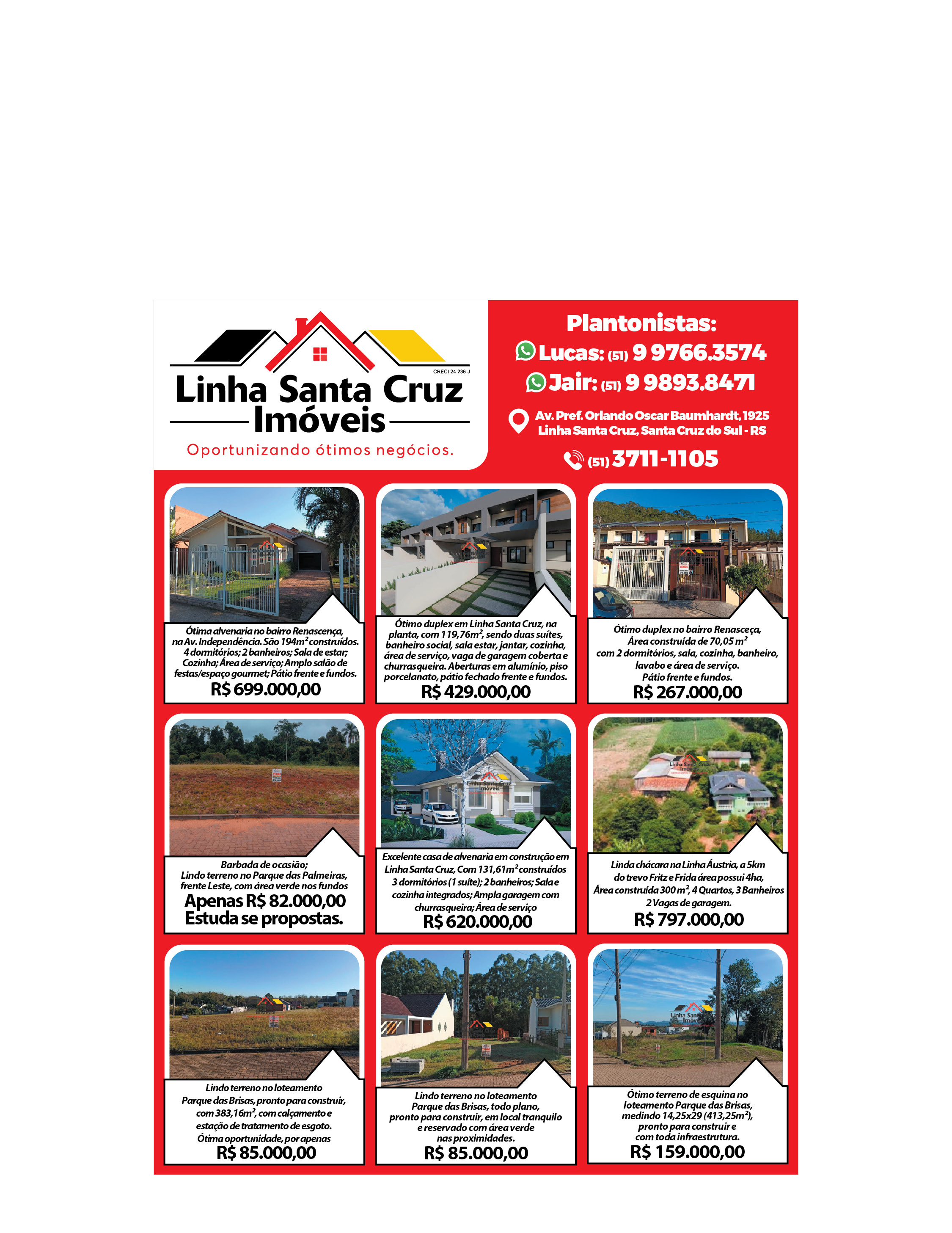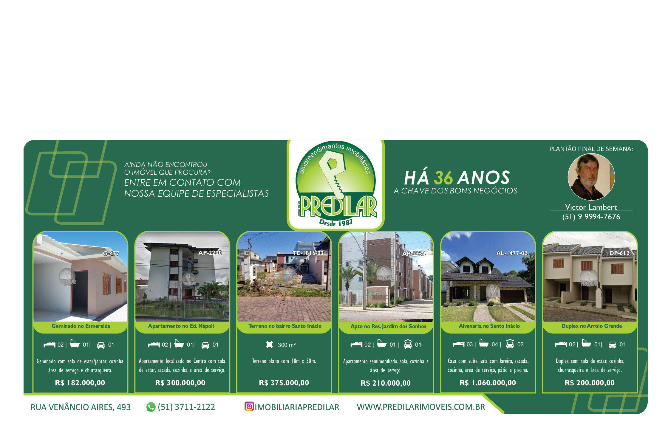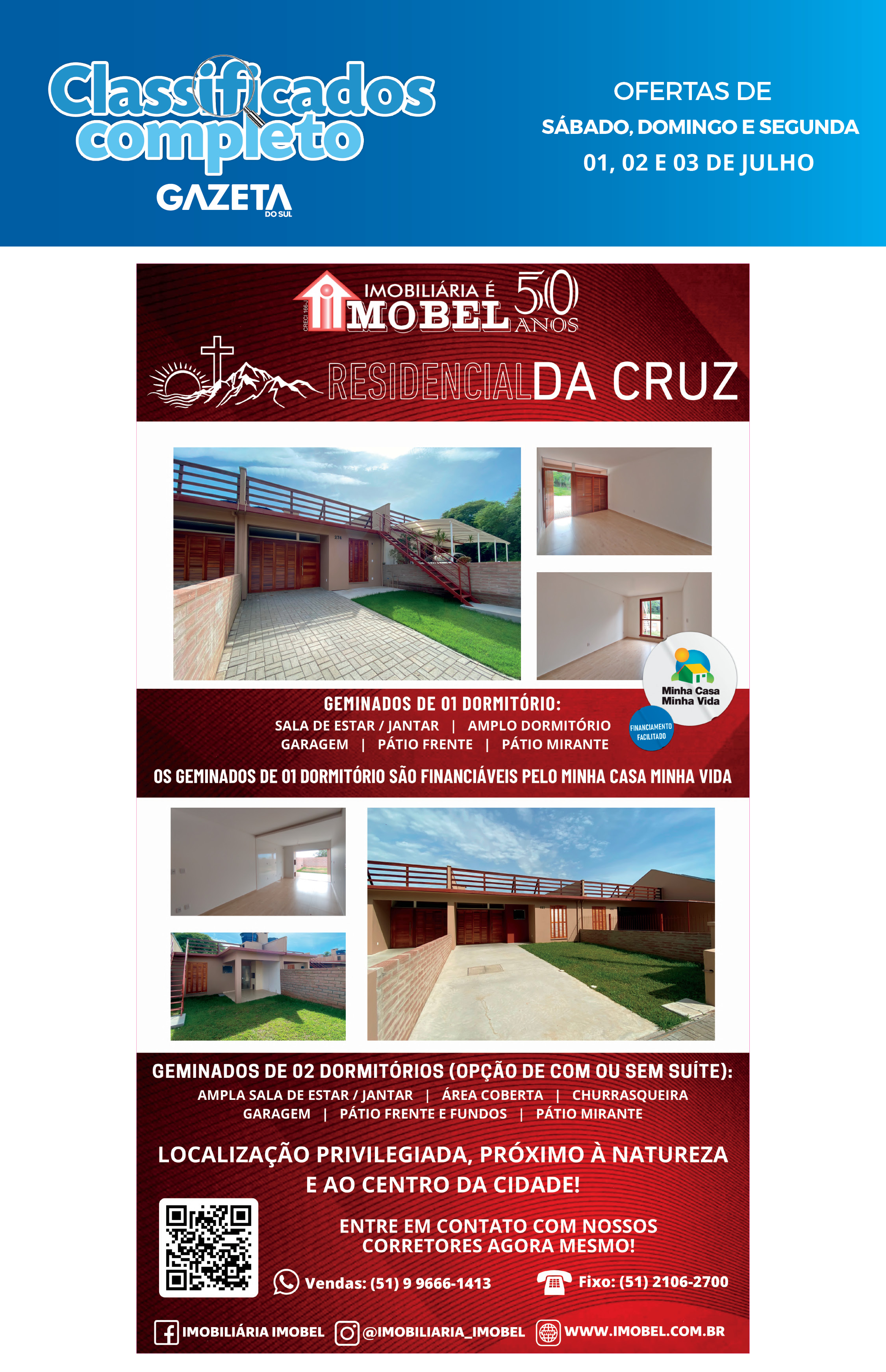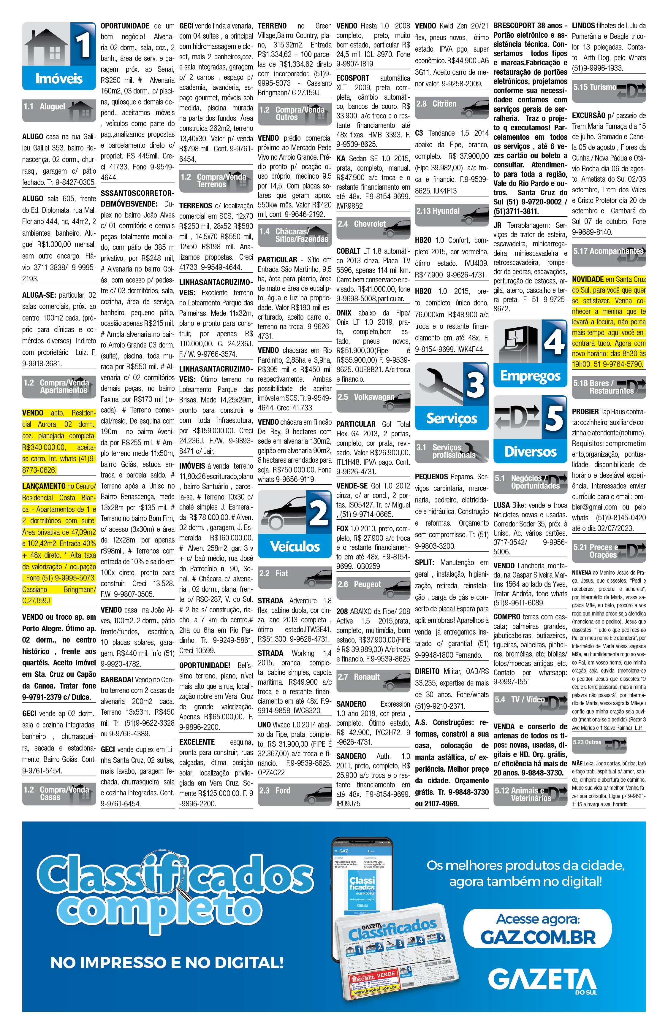 O suplemento de Classificados, que circula nas edições de terças, quintas e sábados, é um dos mais tradicionais da Gazeta do Sul, como vitrine e canal de negócios, de oferta, compra e venda em toda a região central do Rio Grande do Sul. E, para enriquecer pesquisas de produtos e serviços e possibilitar resultado ainda melhor a usuários e parceiros, nos anúncios de clientes cadastrados, o leitor tem acesso direto com link ao site do anunciante, onde poderá verificar mais detalhes sobre os itens. Confira as ofertas: