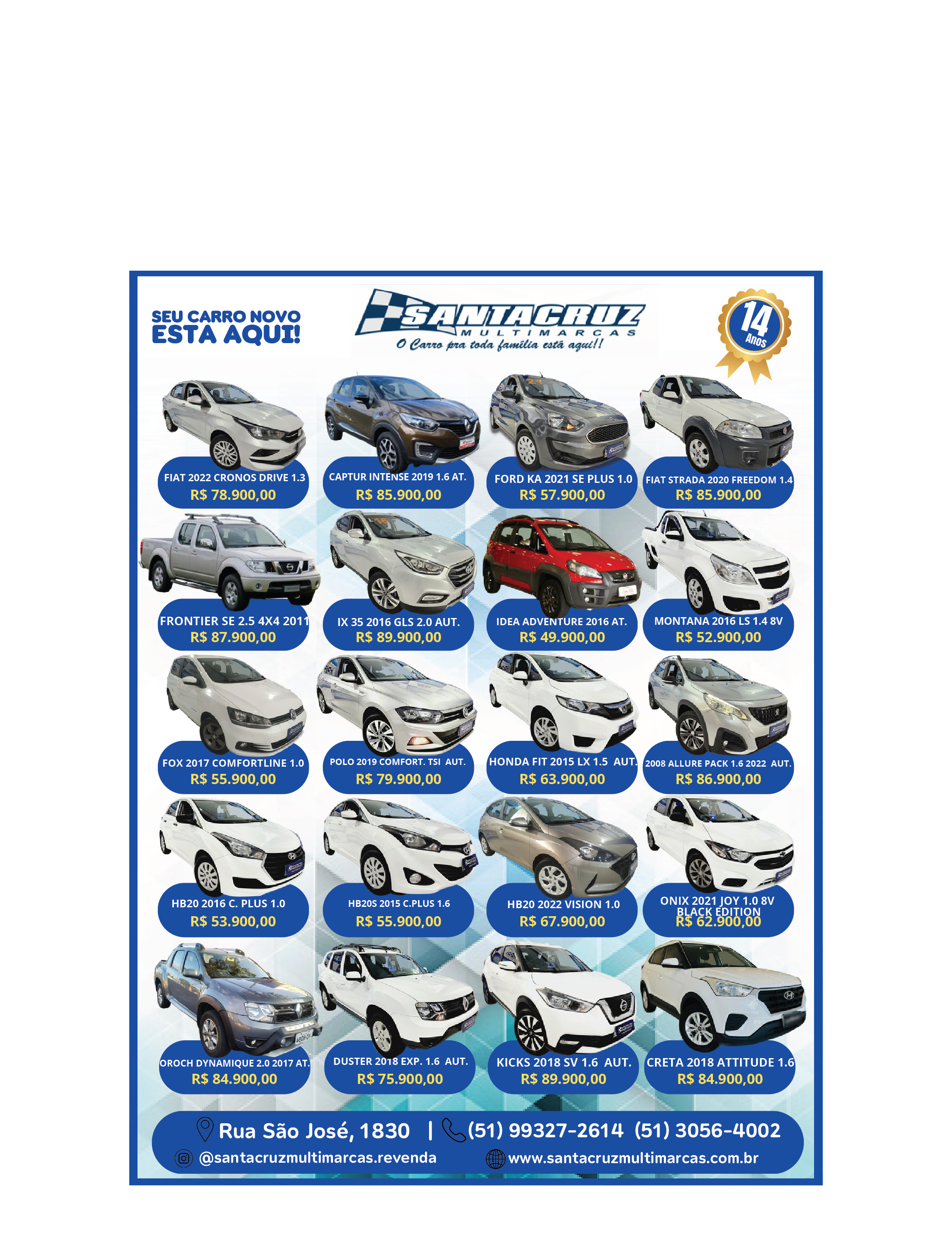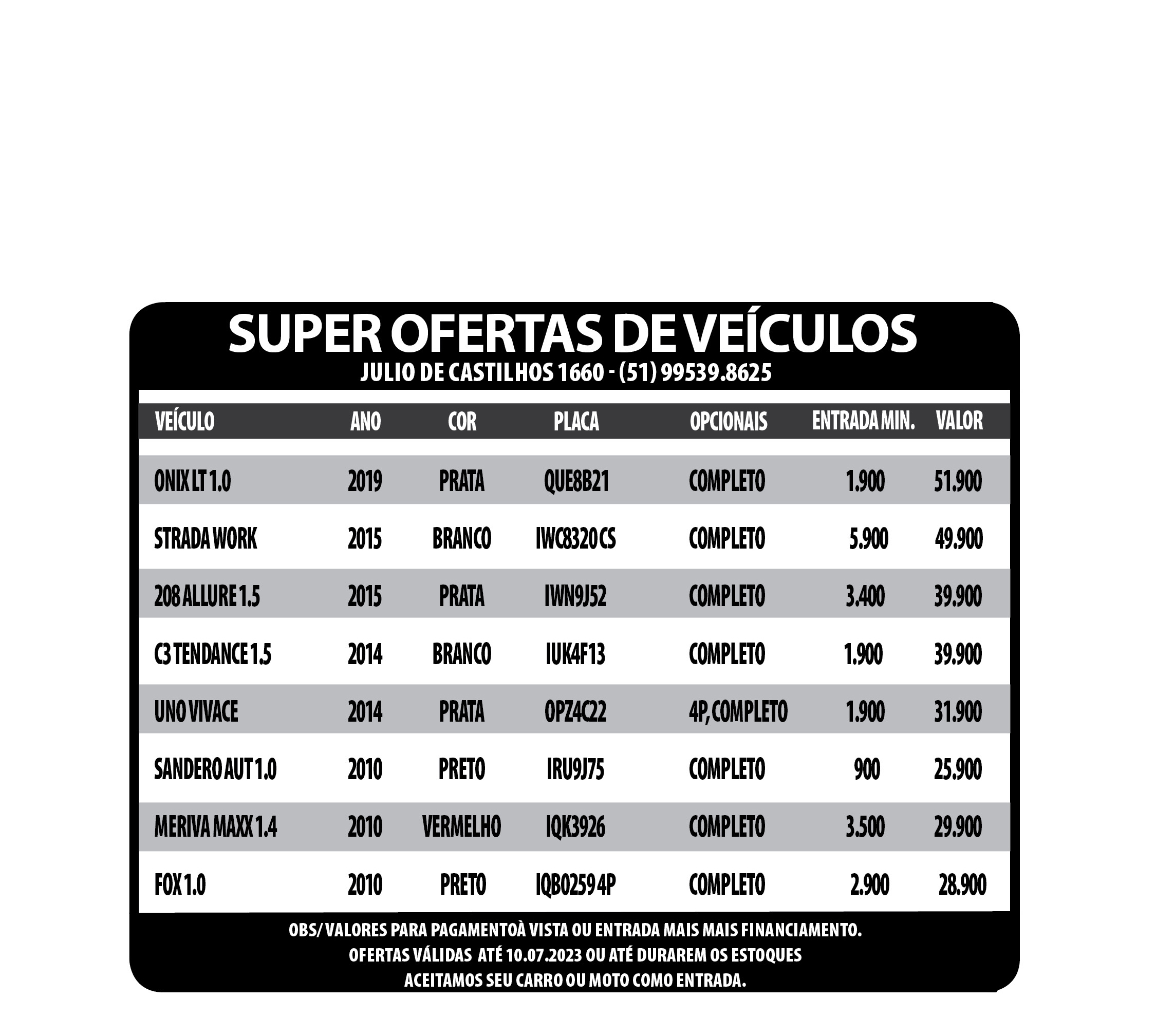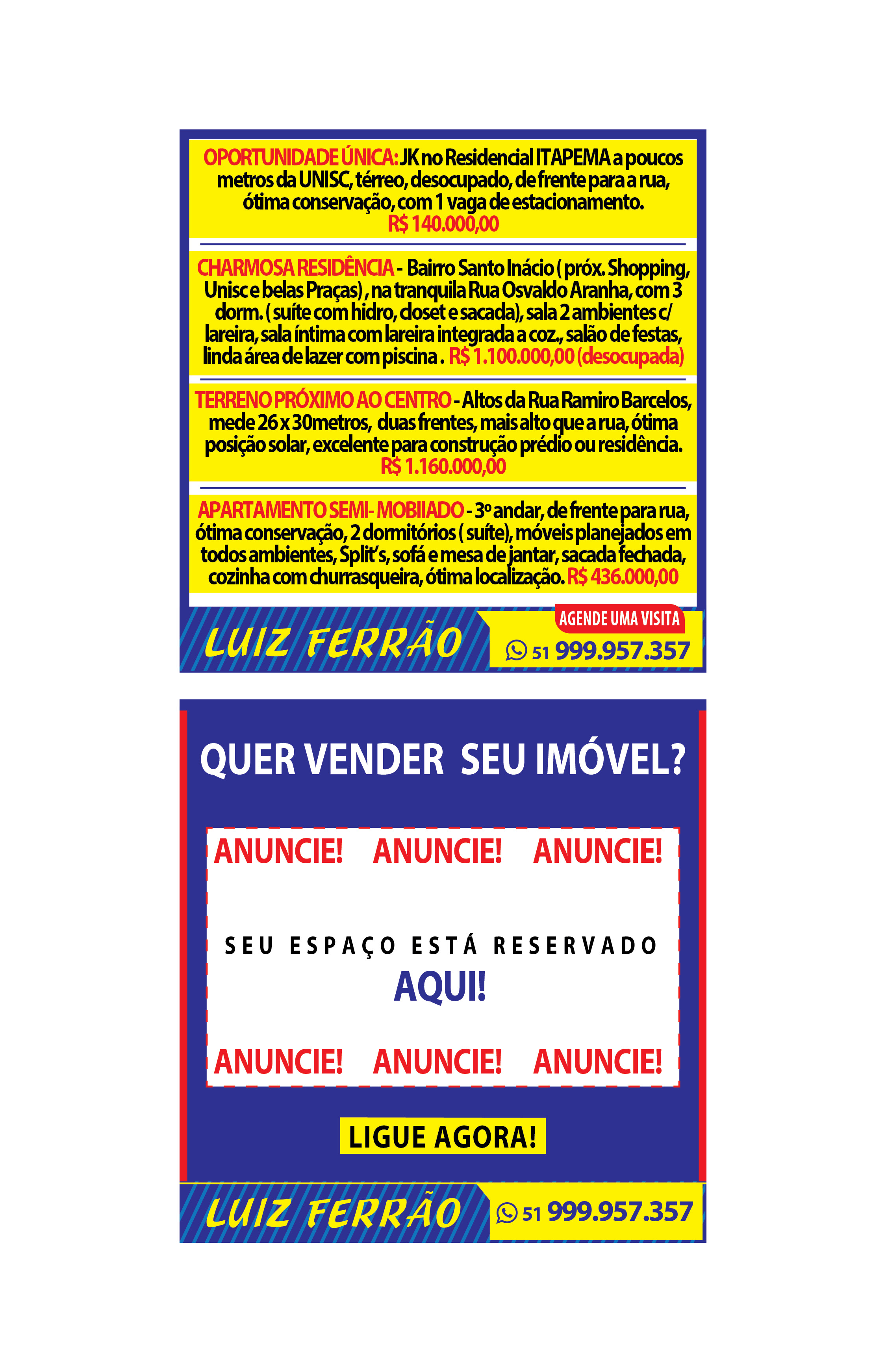 O suplemento de Classificados, que circula nas edições de terças, quintas e sábados, é um dos mais tradicionais da Gazeta do Sul, como vitrine e canal de negócios, de oferta, compra e venda em toda a região central do Rio Grande do Sul. E, para enriquecer pesquisas de produtos e serviços e possibilitar resultado ainda melhor a usuários e parceiros, nos anúncios de clientes cadastrados, o leitor tem acesso direto com link ao site do anunciante, onde poderá verificar mais detalhes sobre os itens. Confira as ofertas: