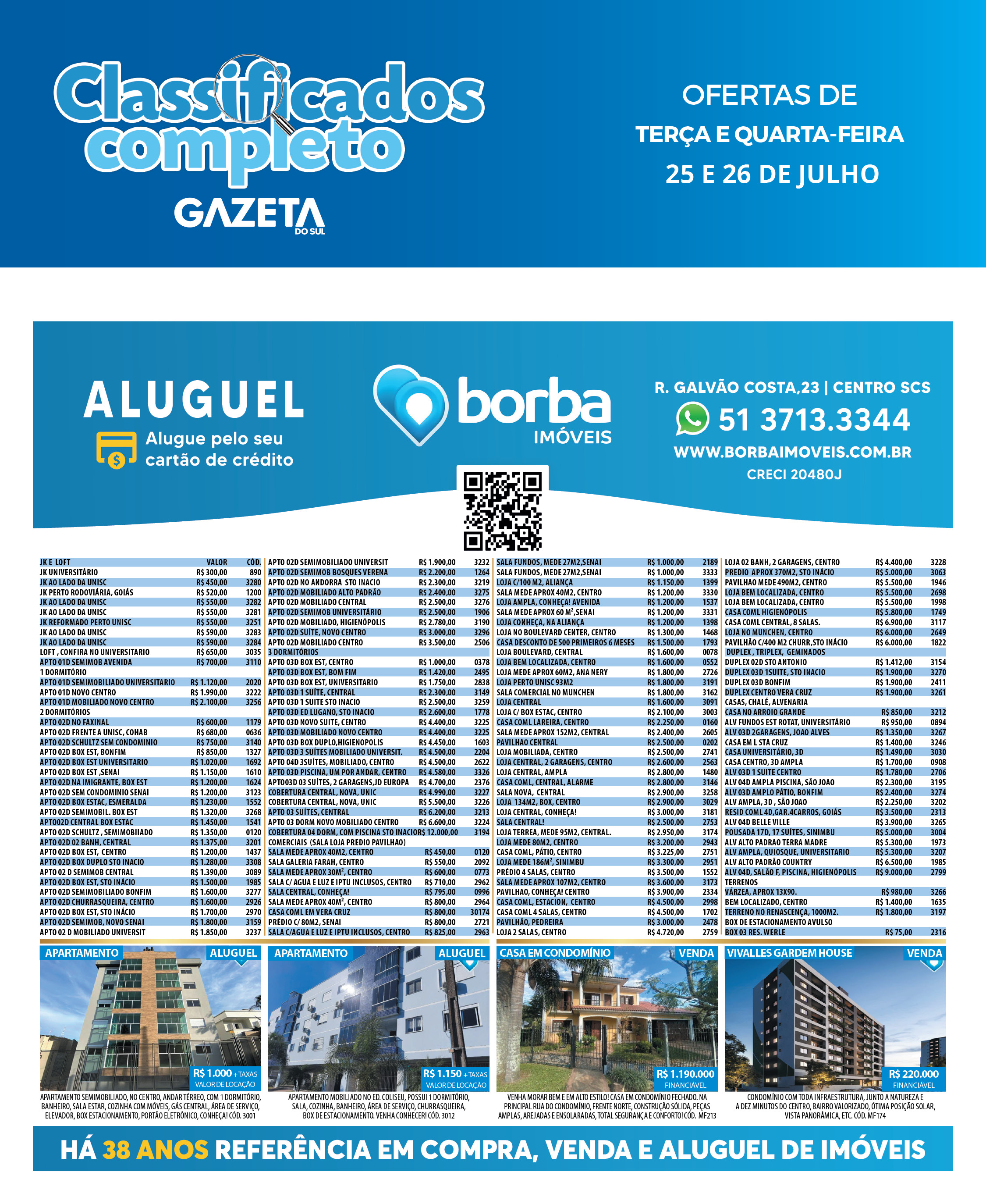 O suplemento de Classificados, que circula nas edições de terças, quintas e sábados, é um dos mais tradicionais da Gazeta do Sul, como vitrine e canal de negócios, de oferta, compra e venda em toda a região central do Rio Grande do Sul. E, para enriquecer pesquisas de produtos e serviços e possibilitar resultado ainda melhor a usuários e parceiros, nos anúncios de clientes cadastrados, o leitor tem acesso direto com link ao site do anunciante, onde poderá verificar mais detalhes sobre os itens. Confira as ofertas: