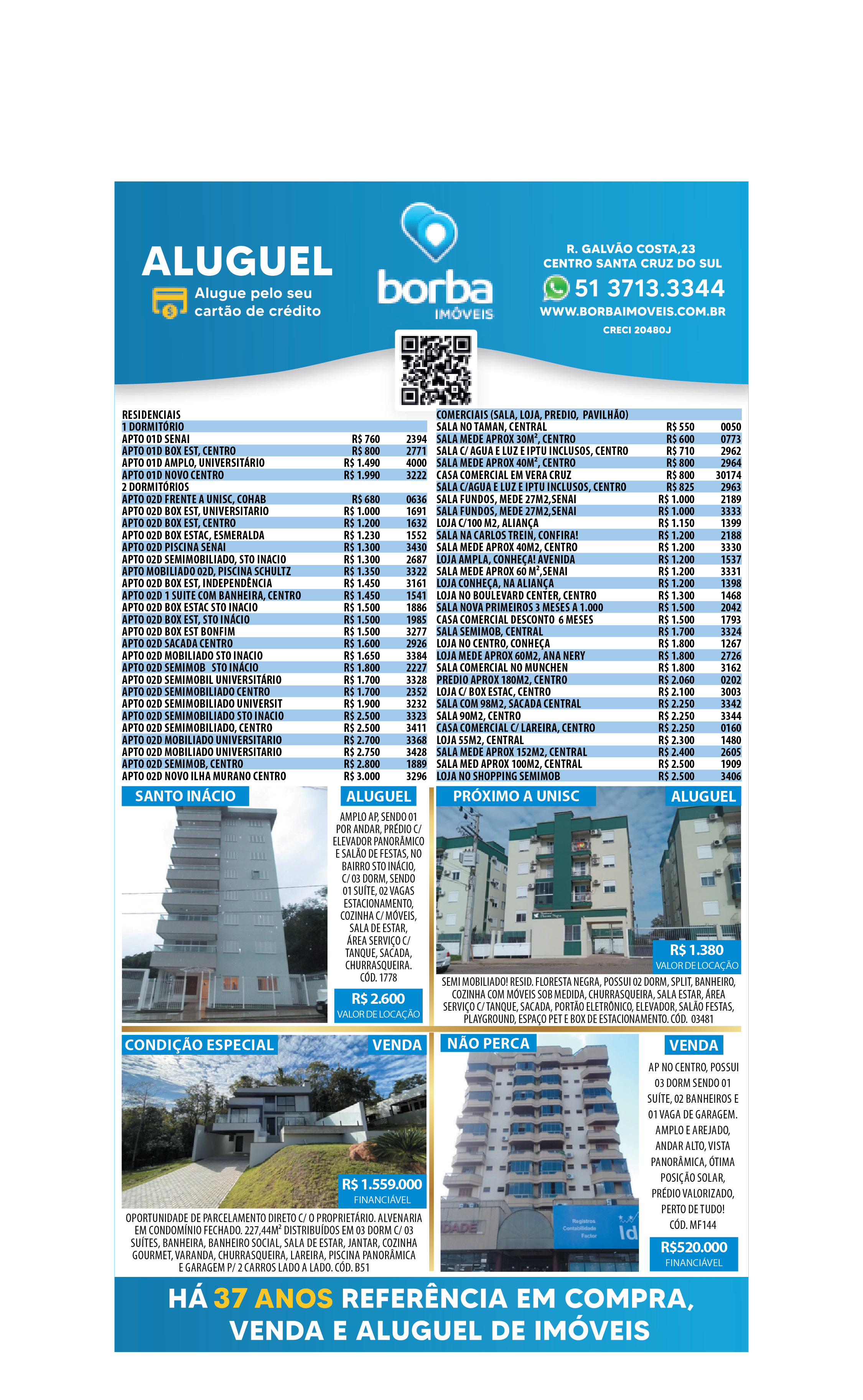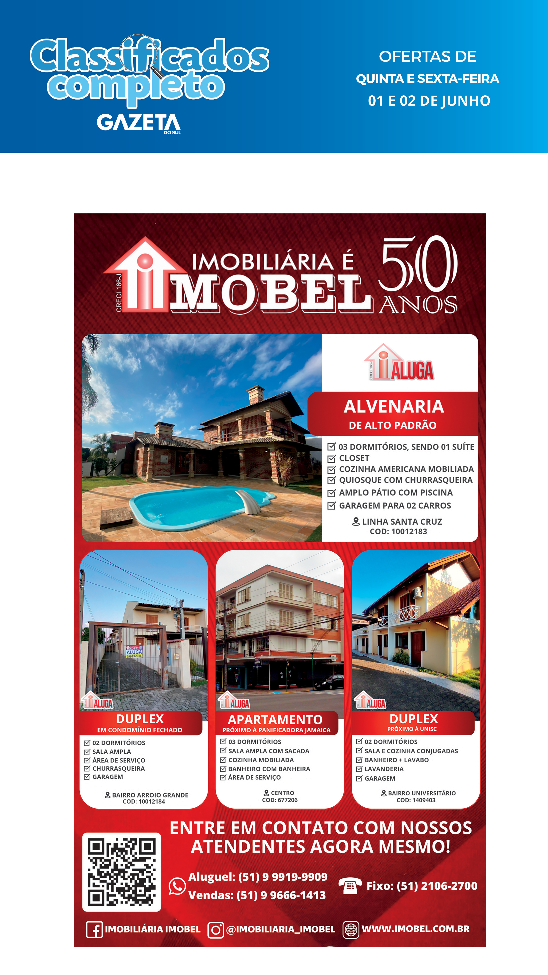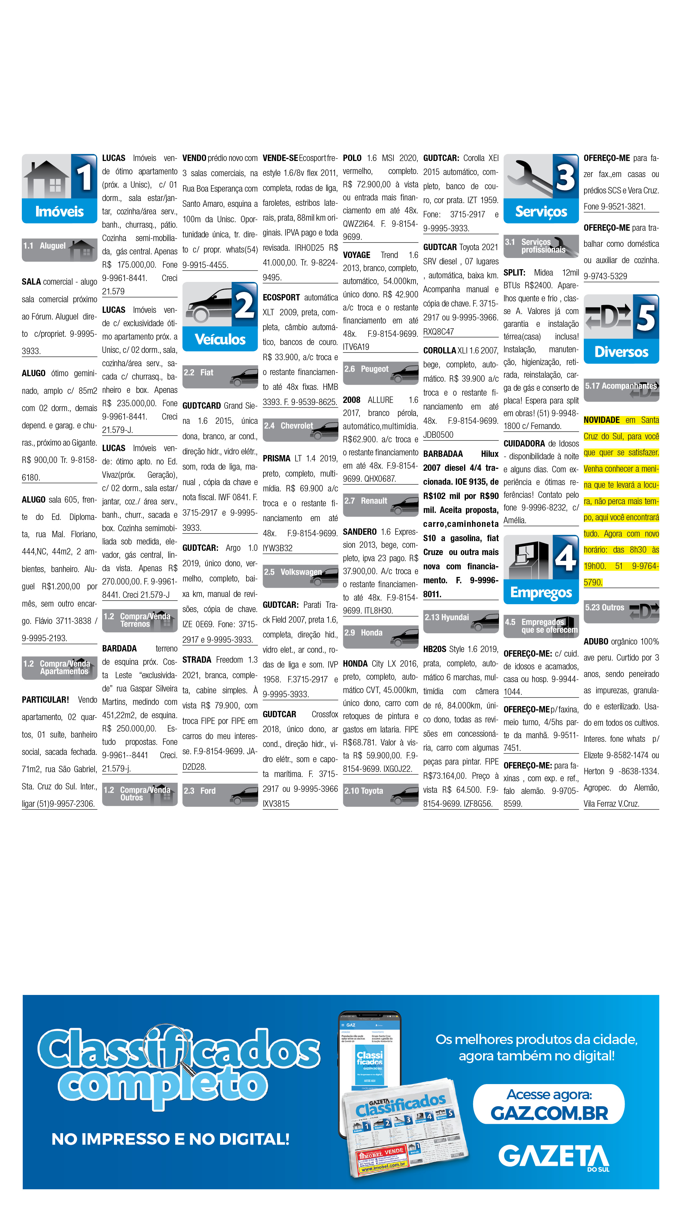 O suplemento de Classificados, que circula nas edições de terças, quintas e sábados, é um dos mais tradicionais da Gazeta do Sul, como vitrine e canal de negócios, de oferta, compra e venda em toda a região central do Rio Grande do Sul. E, para enriquecer pesquisas de produtos e serviços e possibilitar resultado ainda melhor a usuários e parceiros, nos anúncios de clientes cadastrados, o leitor tem acesso direto com link ao site do anunciante, onde poderá verificar mais detalhes sobre os itens. Confira as ofertas: