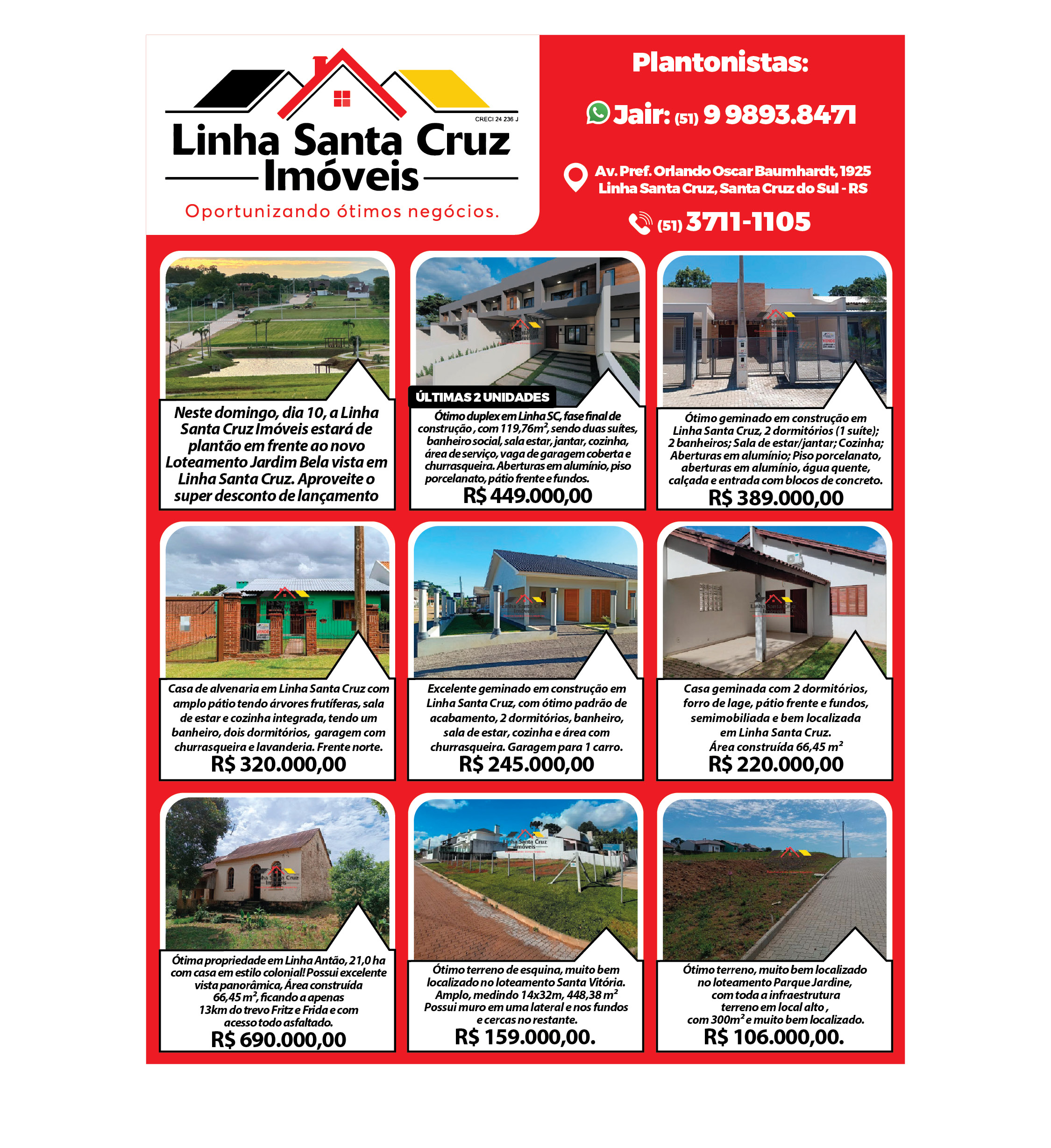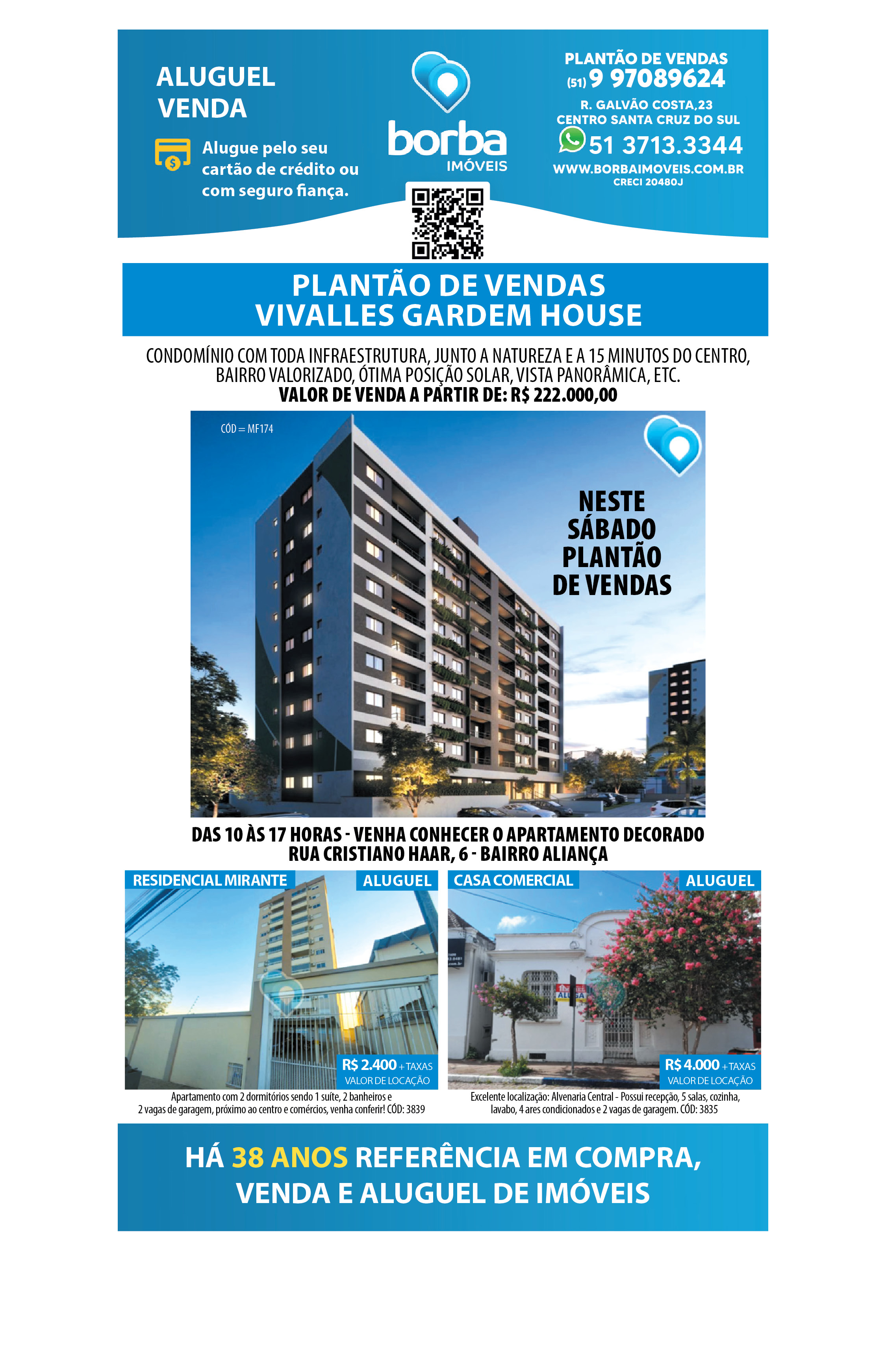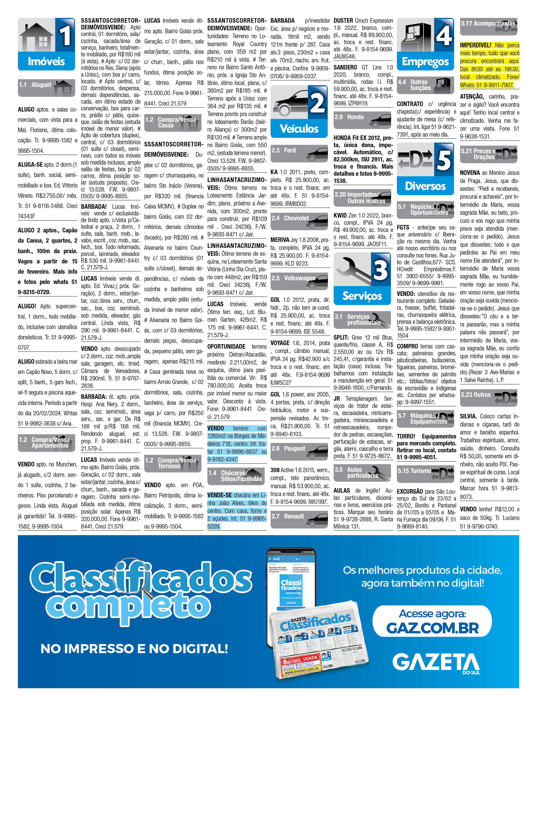 O suplemento de Classificados, que circula nas edições de terças, quintas e sábados, é um dos mais tradicionais da Gazeta do Sul, como vitrine e canal de negócios, de oferta, compra e venda em toda a região central do Rio Grande do Sul. E, para enriquecer pesquisas de produtos e serviços e possibilitar resultado ainda melhor a usuários e parceiros, nos anúncios de clientes cadastrados, o leitor tem acesso direto com link ao site do anunciante, onde poderá verificar mais detalhes sobre os itens. Confira as ofertas: