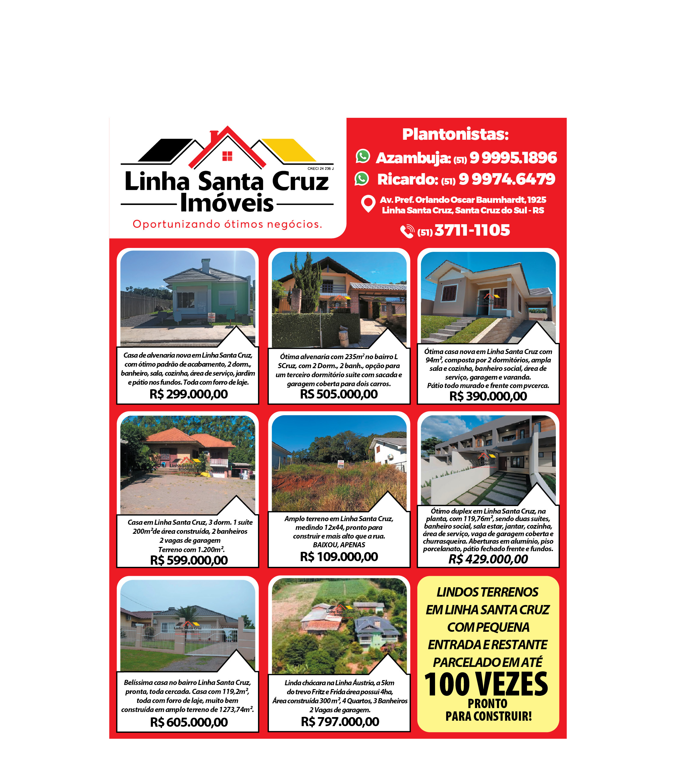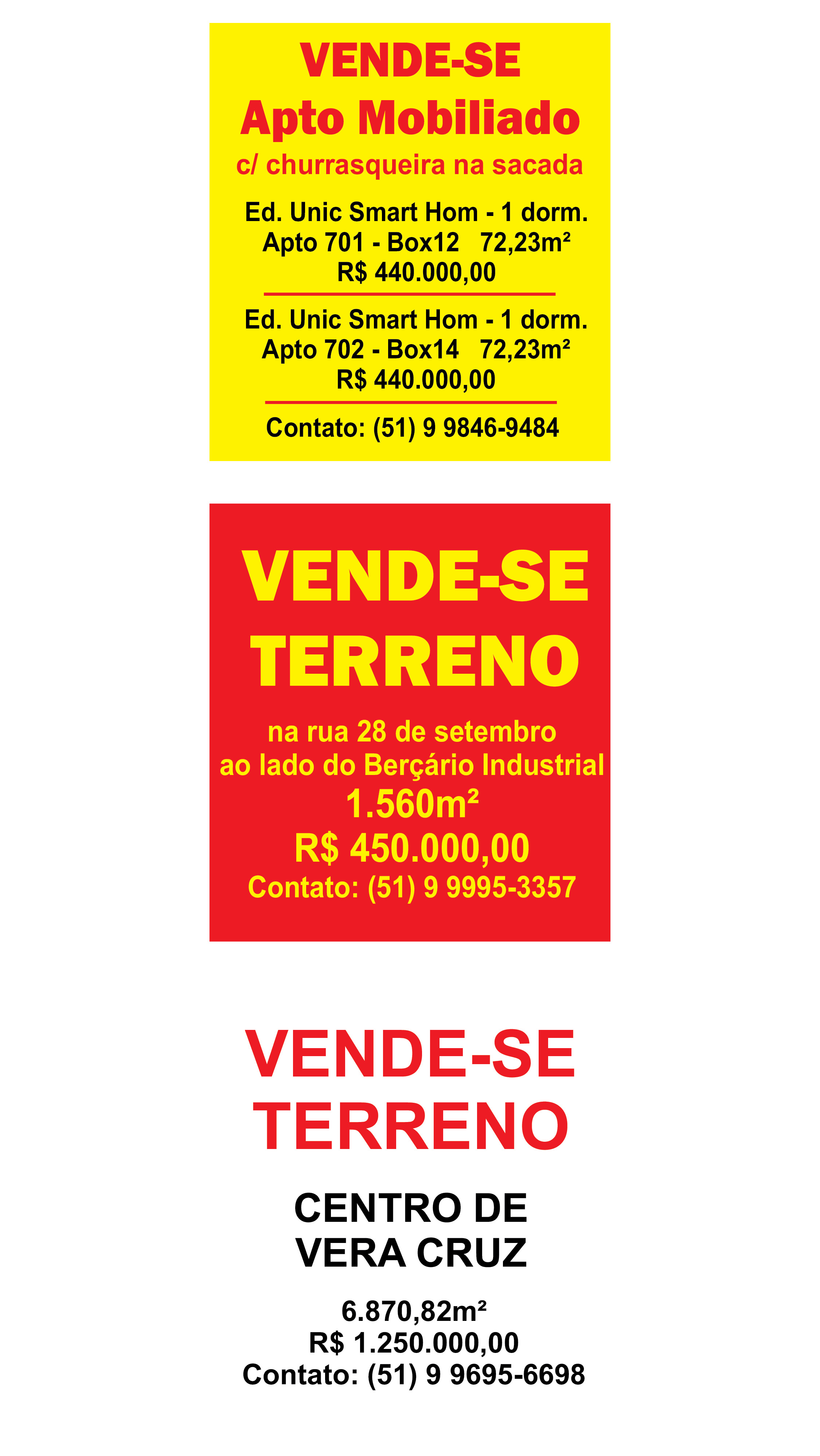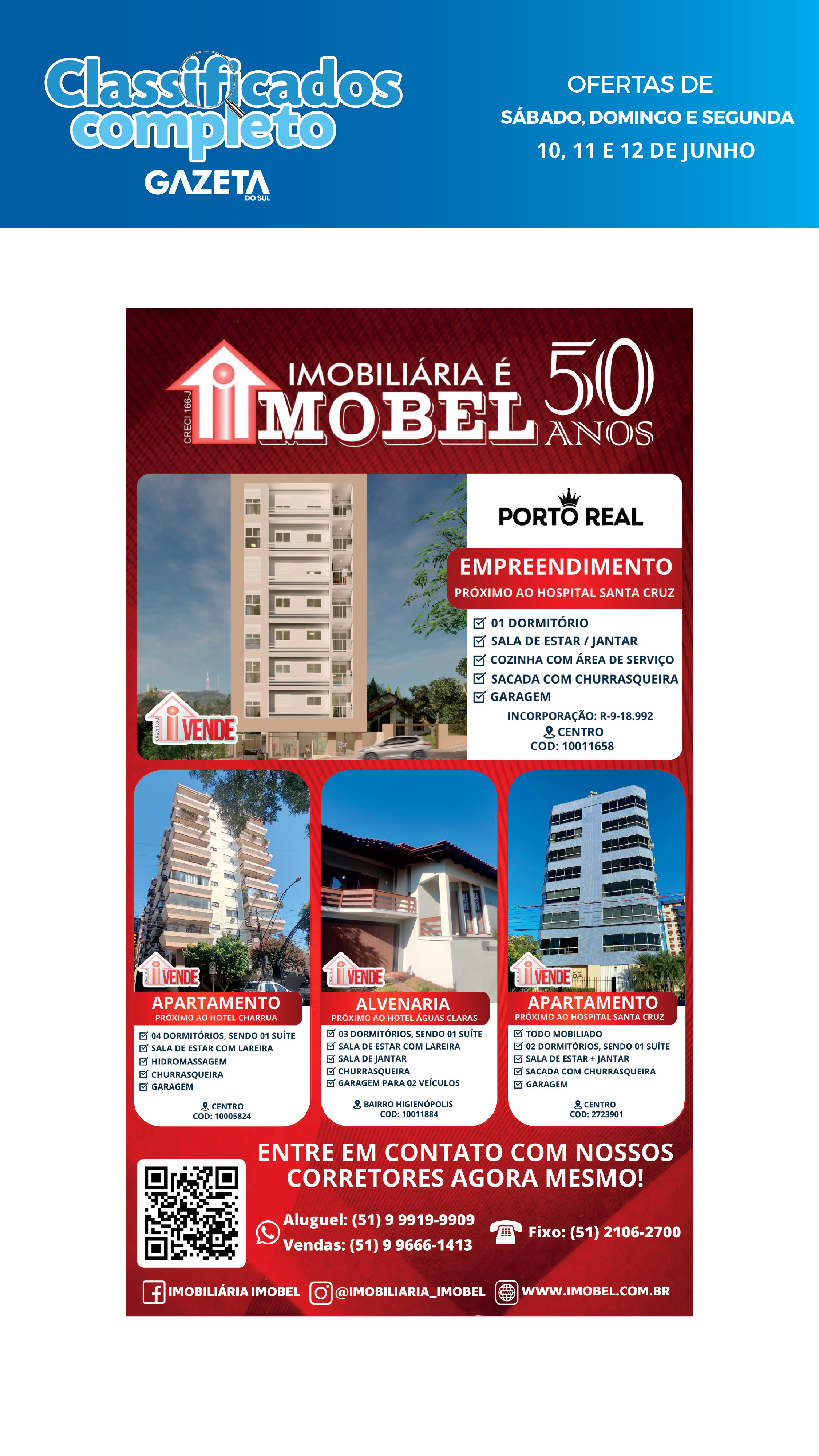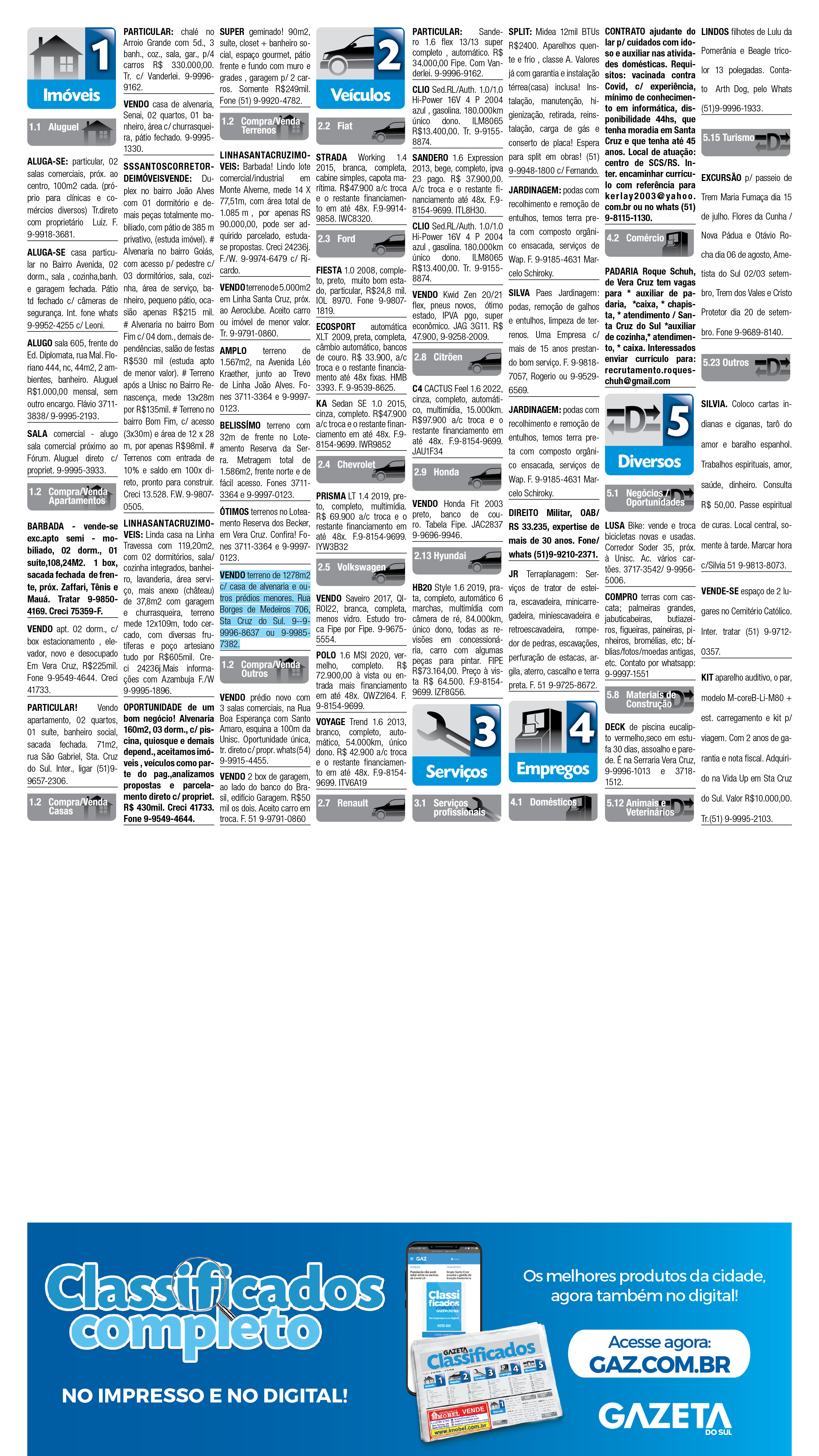 O suplemento de Classificados, que circula nas edições de terças, quintas e sábados, é um dos mais tradicionais da Gazeta do Sul, como vitrine e canal de negócios, de oferta, compra e venda em toda a região central do Rio Grande do Sul. E, para enriquecer pesquisas de produtos e serviços e possibilitar resultado ainda melhor a usuários e parceiros, nos anúncios de clientes cadastrados, o leitor tem acesso direto com link ao site do anunciante, onde poderá verificar mais detalhes sobre os itens. Confira as ofertas: