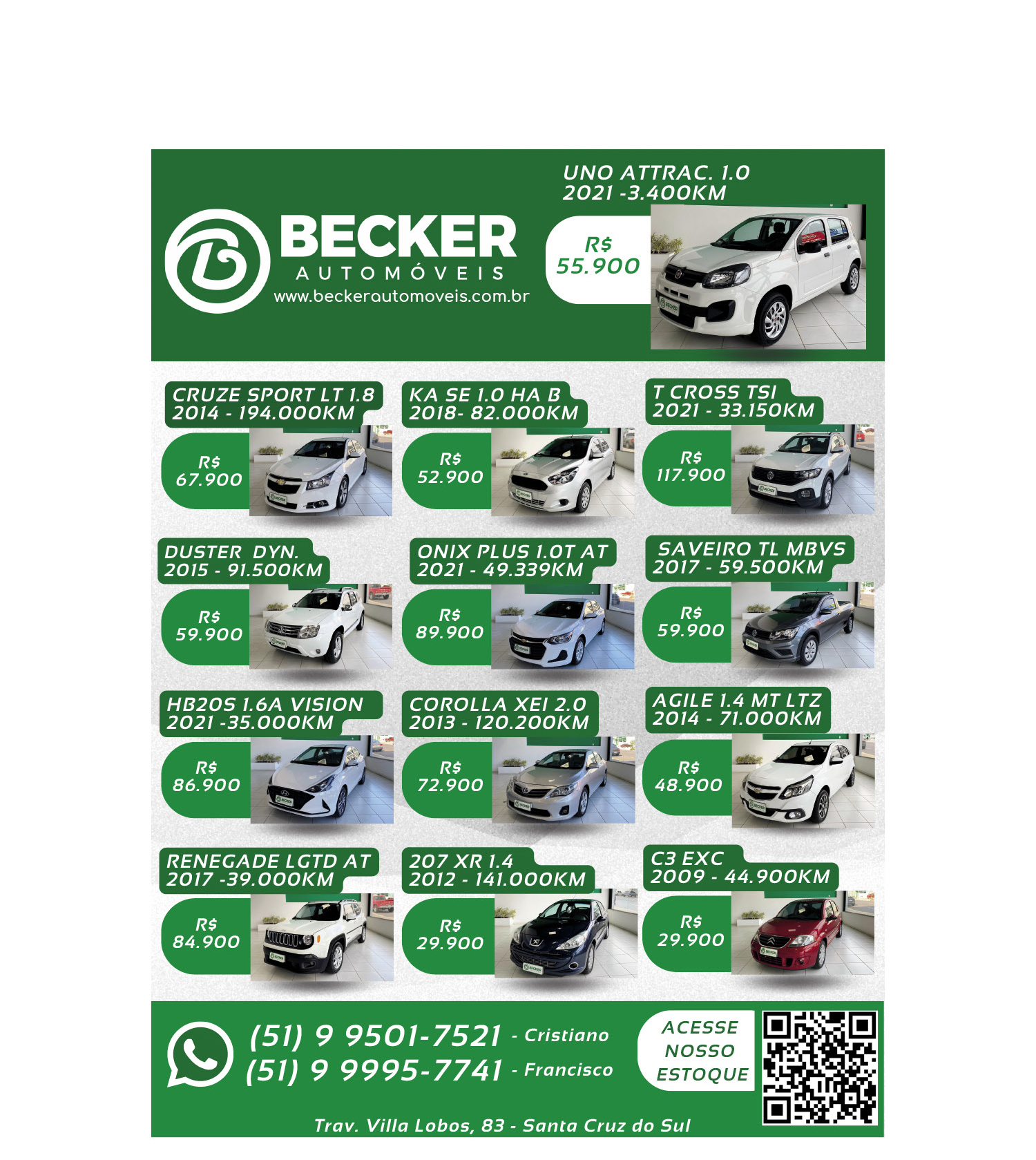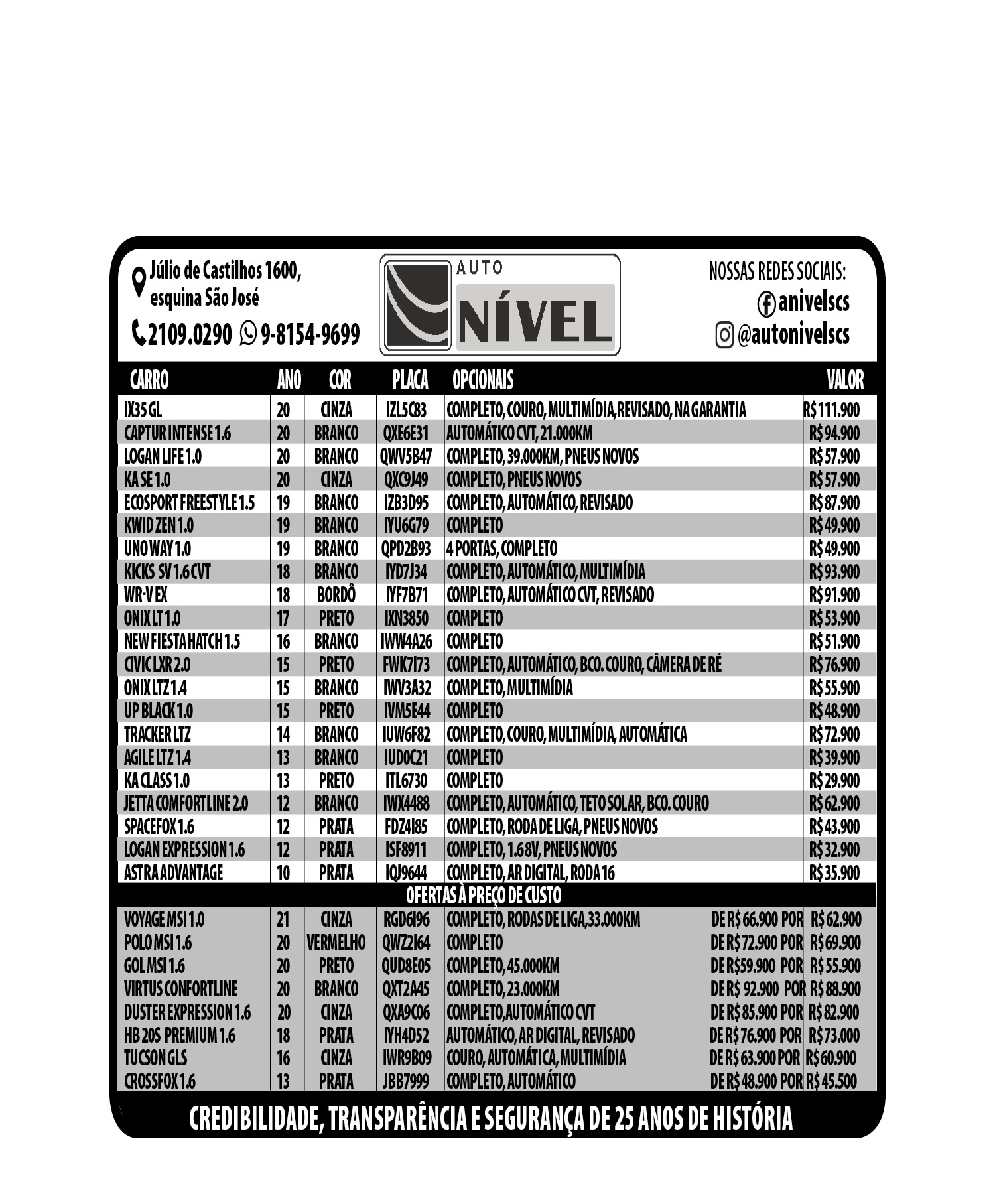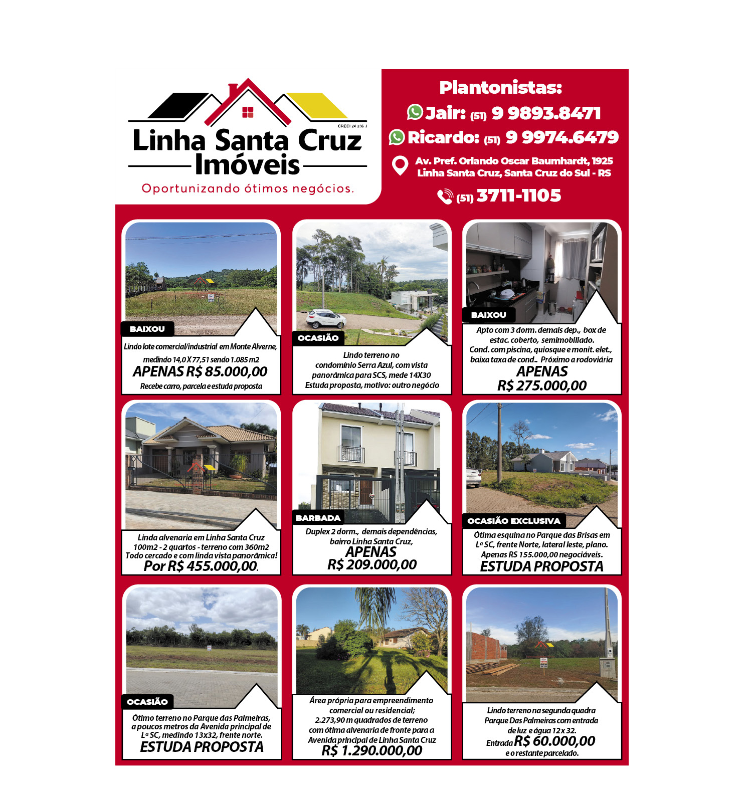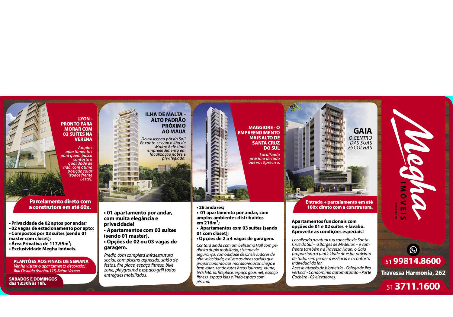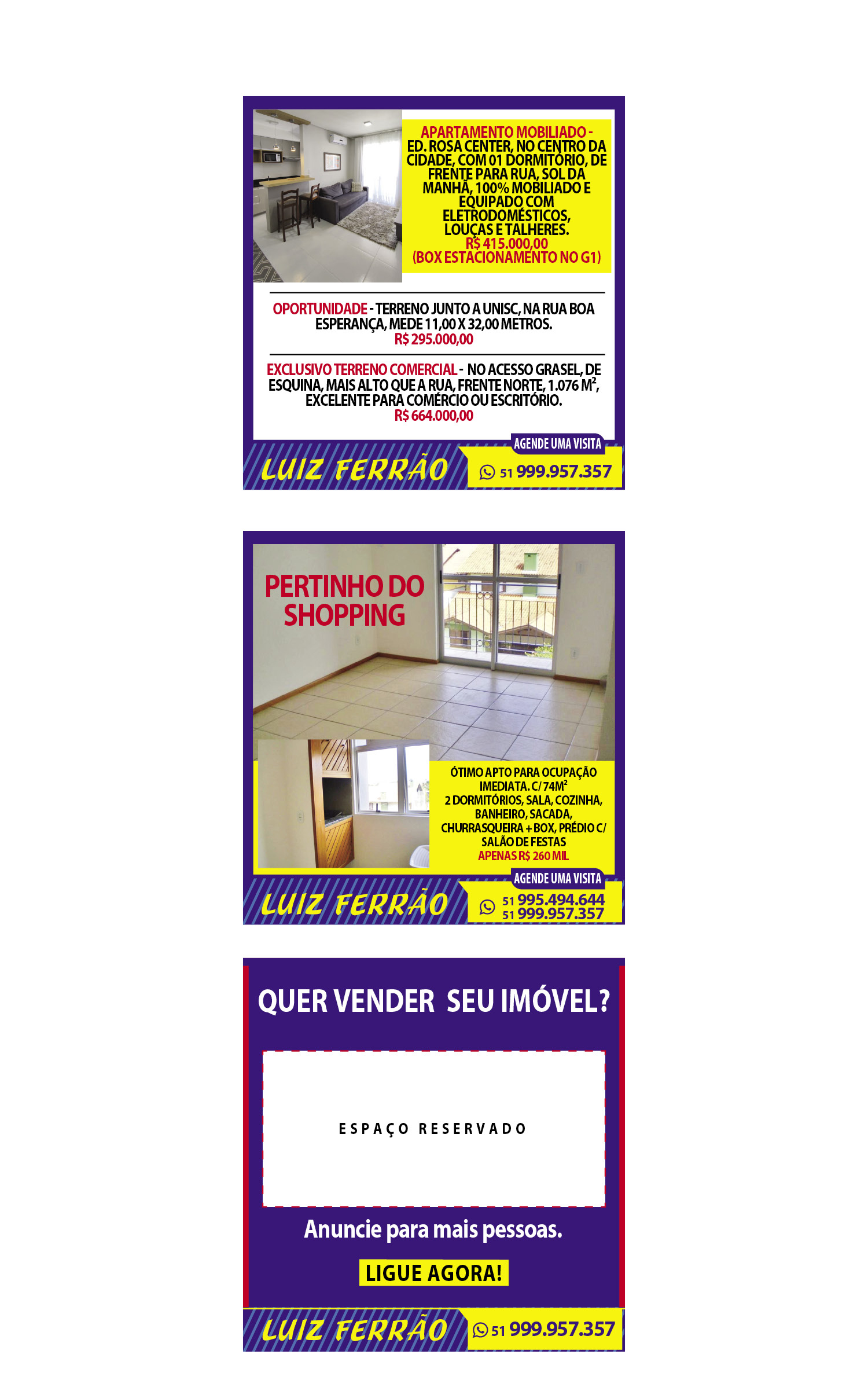 O suplemento de Classificados, que circula nas edições de terças, quintas e sábados, é um dos mais tradicionais da Gazeta do Sul, como vitrine e canal de negócios, de oferta, compra e venda em toda a região central do Rio Grande do Sul. E, para enriquecer pesquisas de produtos e serviços e possibilitar resultado ainda melhor a usuários e parceiros, nos anúncios de clientes cadastrados, o leitor tem acesso direto com link ao site do anunciante, onde poderá verificar mais detalhes sobre os itens. Confira as ofertas:
