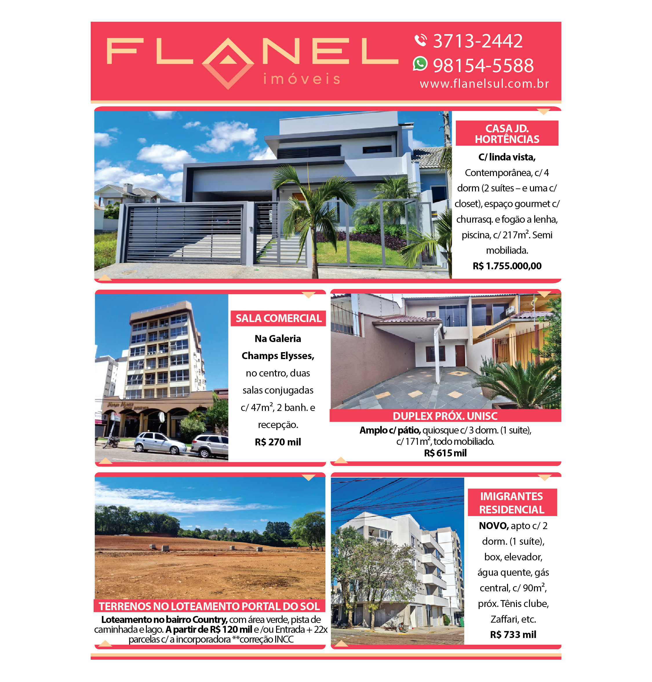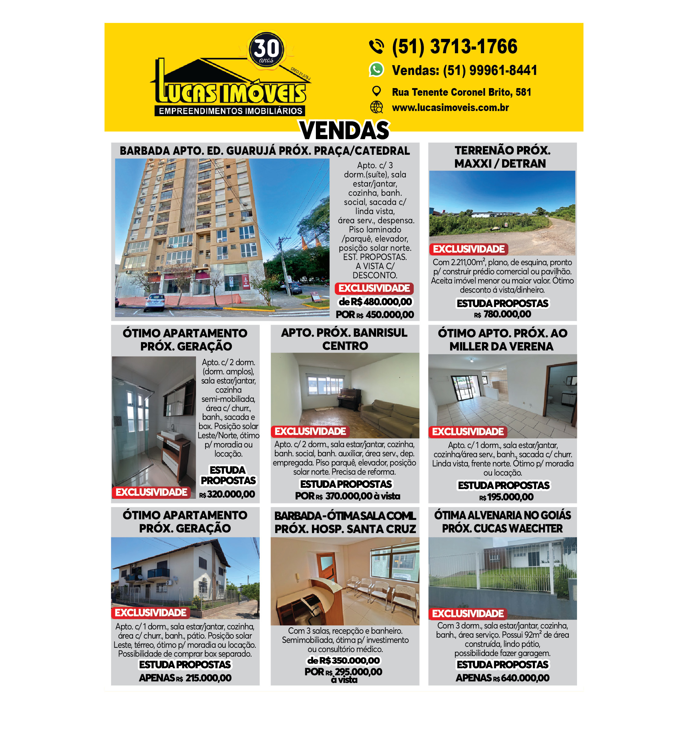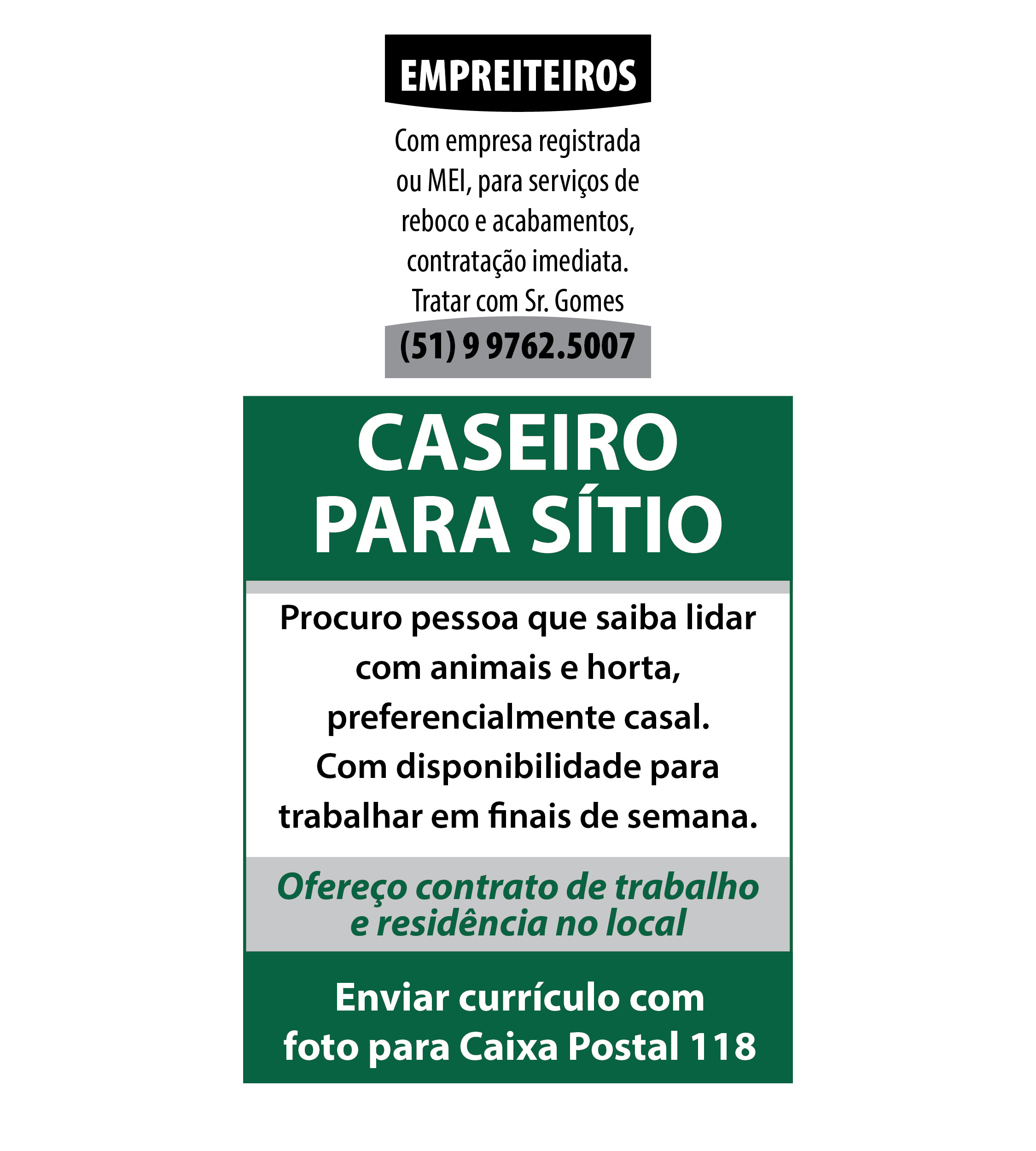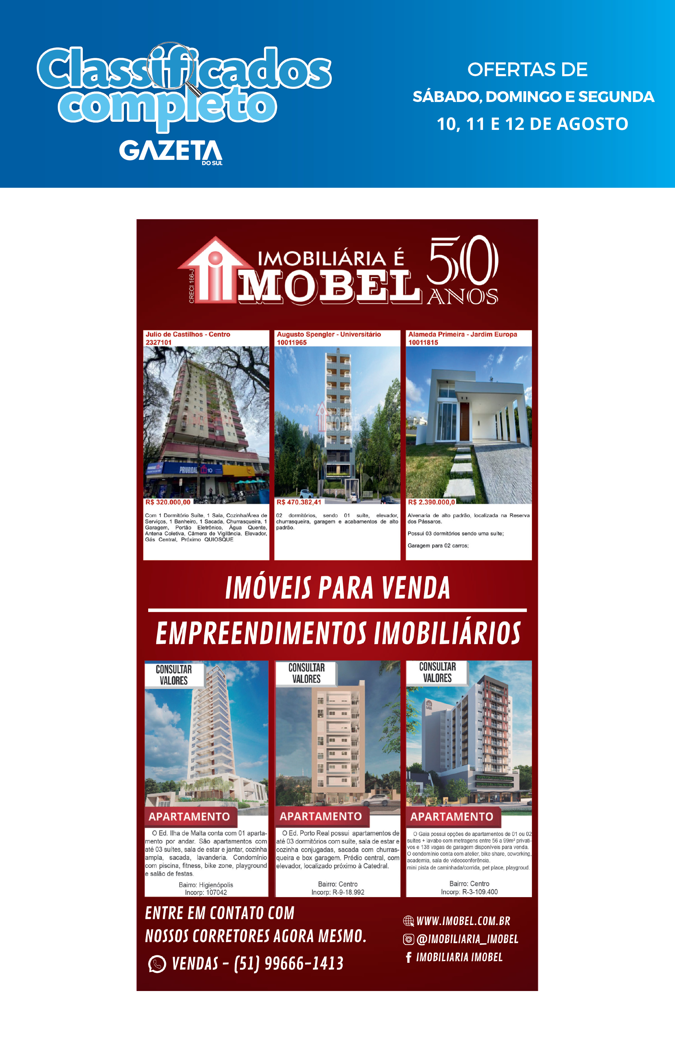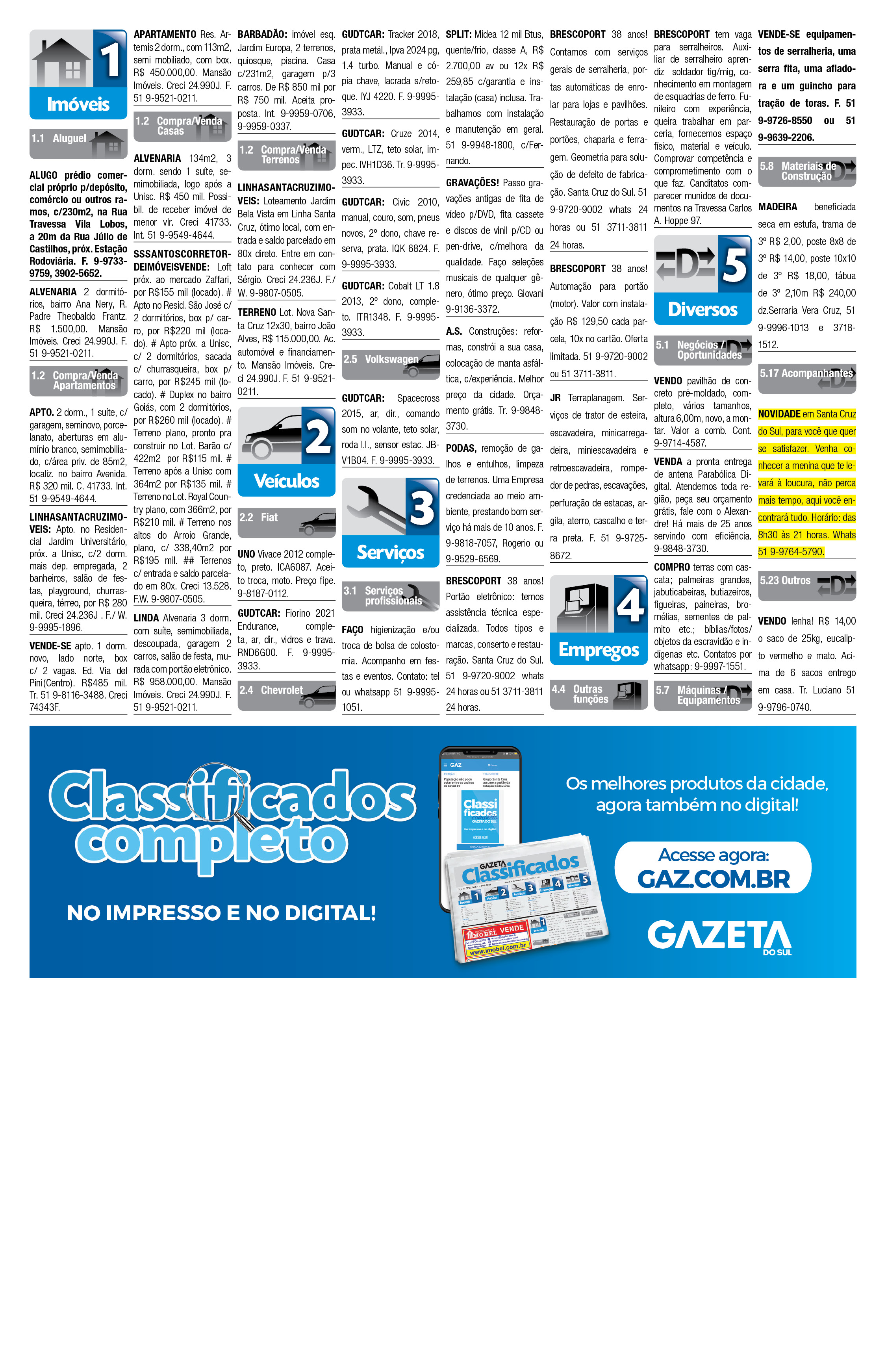 O suplemento de Classificados, que circula nas edições de terças, quintas e sábados, é um dos mais tradicionais da Gazeta do Sul, como vitrine e canal de negócios, de oferta, compra e venda em toda a região central do Rio Grande do Sul. E, para enriquecer pesquisas de produtos e serviços e possibilitar resultado ainda melhor a usuários e parceiros, nos anúncios de clientes cadastrados, o leitor tem acesso direto com link ao site do anunciante, onde poderá verificar mais detalhes sobre os itens. Confira as ofertas: