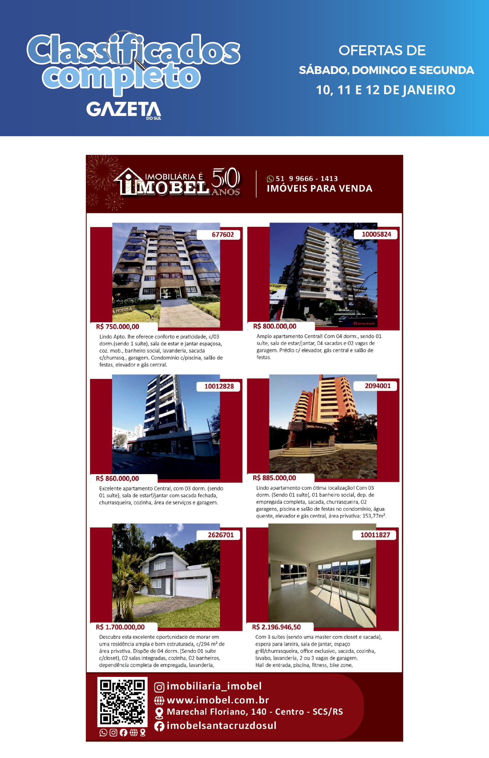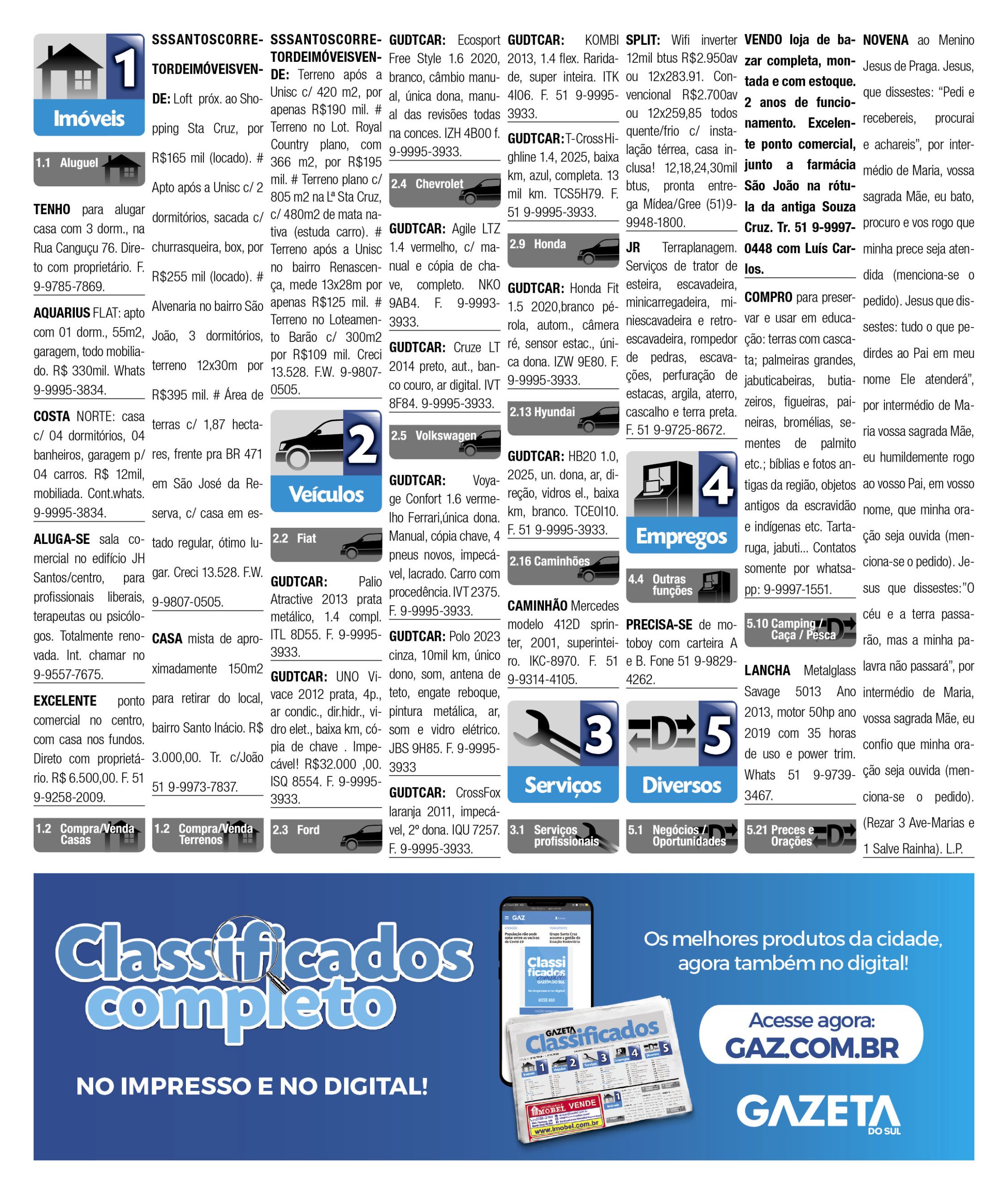 O suplemento de Classificados, que circula nas edições de terças, quintas e sábados, é um dos mais tradicionais da Gazeta do Sul, como vitrine e canal de negócios, de oferta, compra e venda em toda a região central do Rio Grande do Sul. E, para enriquecer pesquisas de produtos e serviços e possibilitar resultado ainda melhor a usuários e parceiros, nos anúncios de clientes cadastrados, o leitor tem acesso direto com link ao site do anunciante, onde poderá verificar mais detalhes sobre os itens. Confira as ofertas: