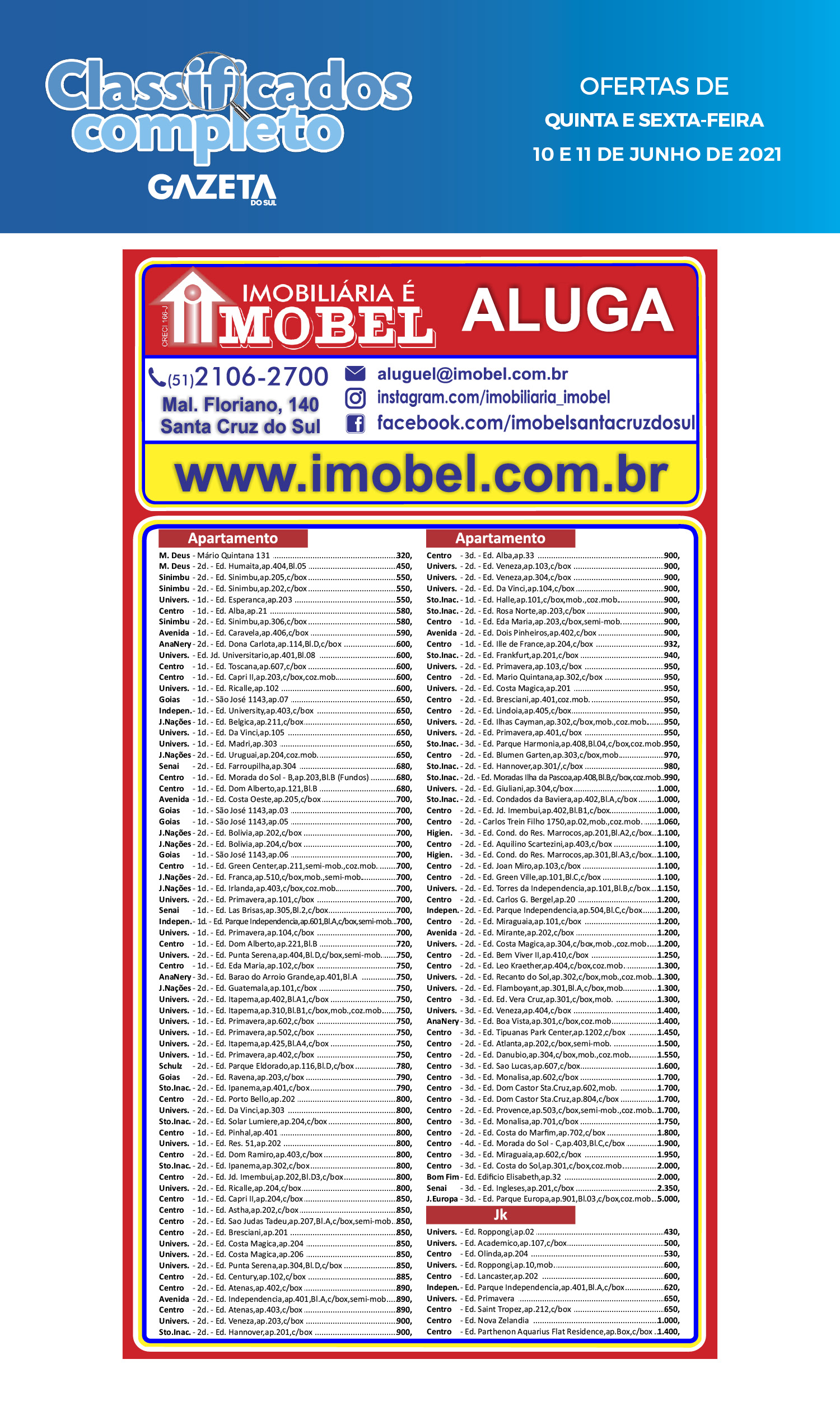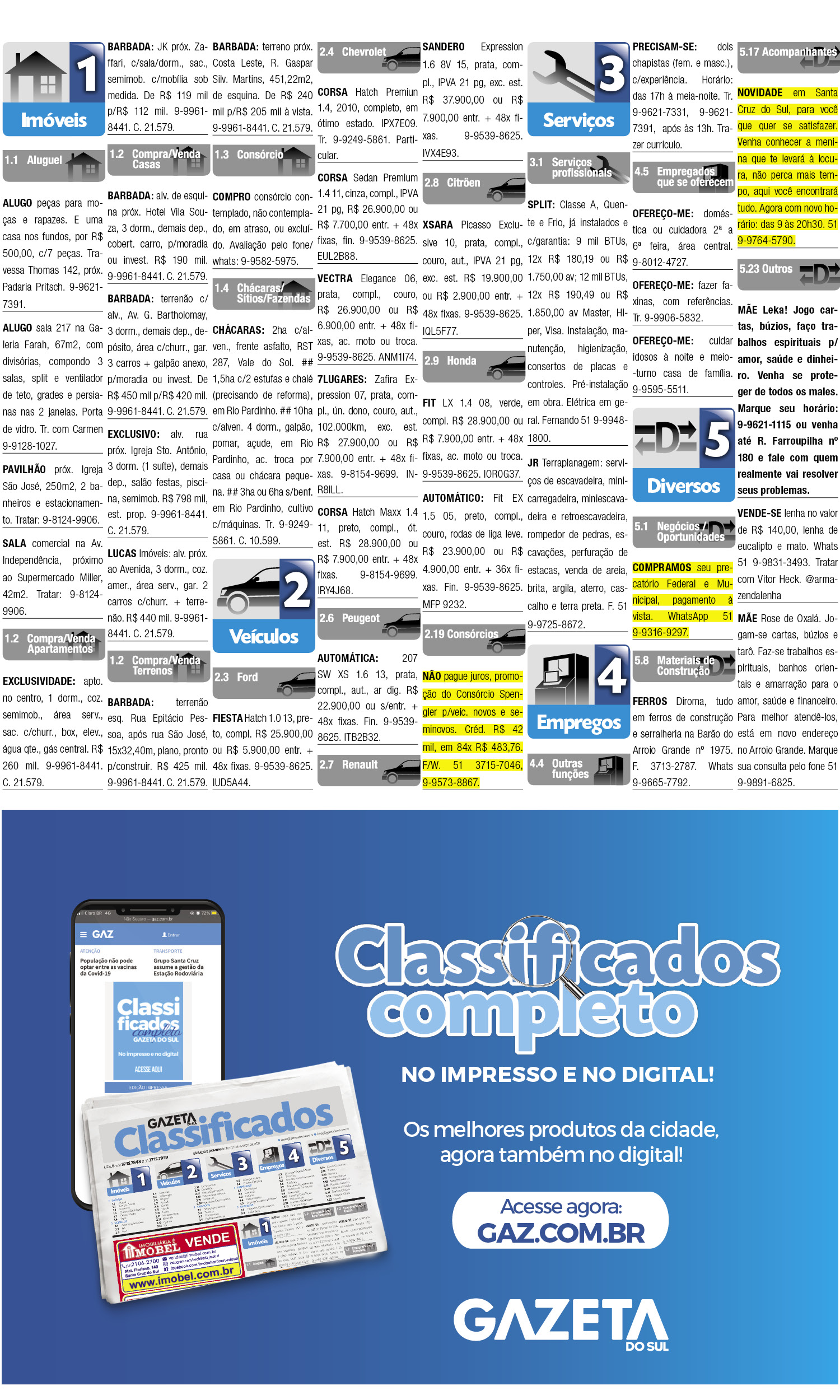 O suplemento de Classificados, que circula nas edições de terças, quintas e sábados, é um dos mais tradicionais da Gazeta do Sul, como vitrine e canal de negócios, de oferta, compra e venda em toda a região central do Rio Grande do Sul. E, para enriquecer pesquisas de produtos e serviços e possibilitar resultado ainda melhor a usuários e parceiros, nos anúncios de clientes cadastrados, o leitor tem acesso direto com link ao site do anunciante, onde poderá verificar mais detalhes sobre os itens. Confira: