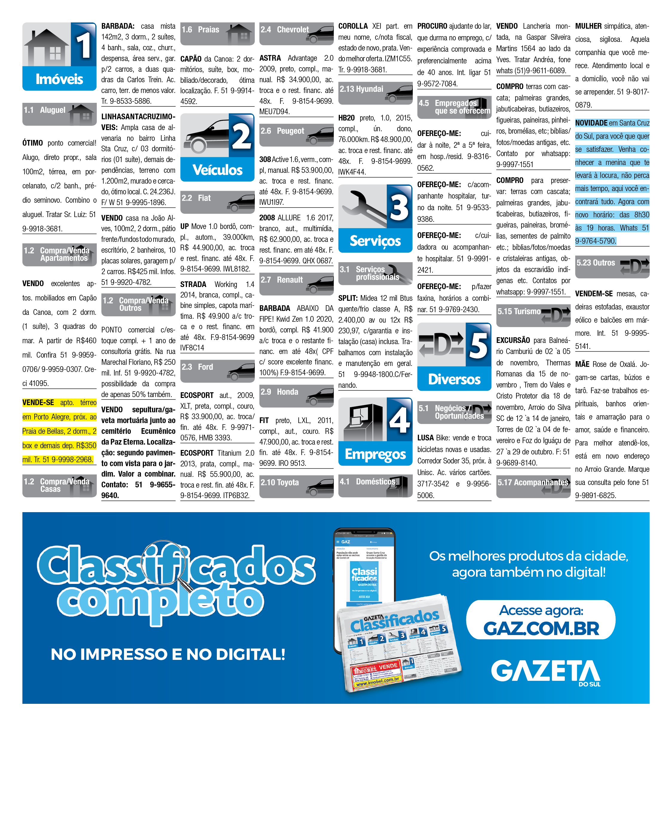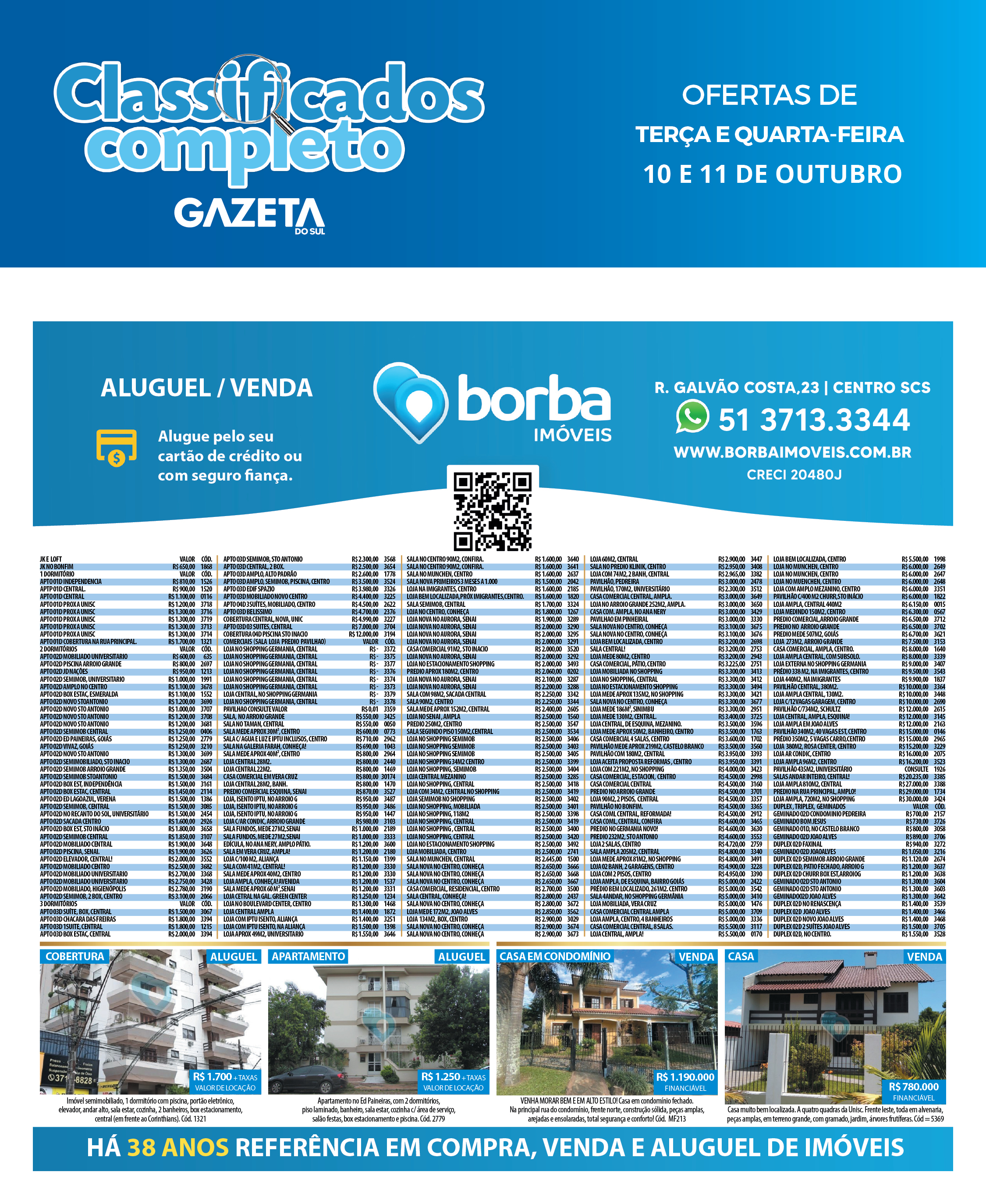 O suplemento de Classificados, que circula nas edições de terças, quintas e sábados, é um dos mais tradicionais da Gazeta do Sul, como vitrine e canal de negócios, de oferta, compra e venda em toda a região central do Rio Grande do Sul. E, para enriquecer pesquisas de produtos e serviços e possibilitar resultado ainda melhor a usuários e parceiros, nos anúncios de clientes cadastrados, o leitor tem acesso direto com link ao site do anunciante, onde poderá verificar mais detalhes sobre os itens. Confira as ofertas: