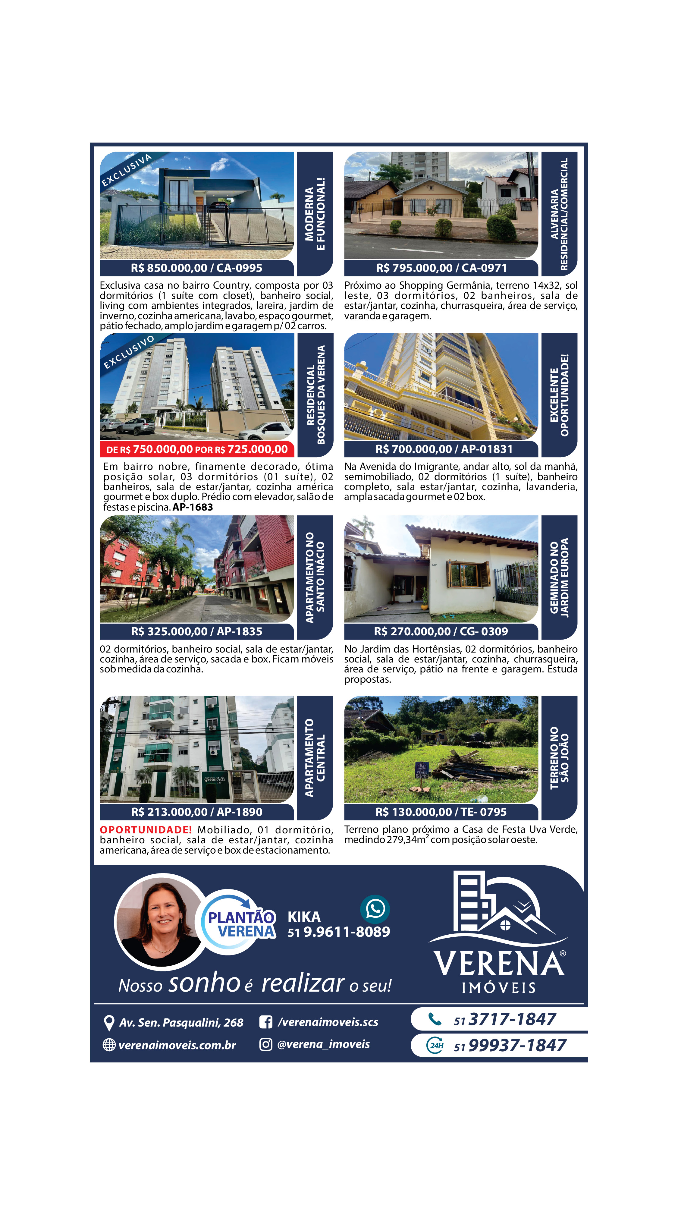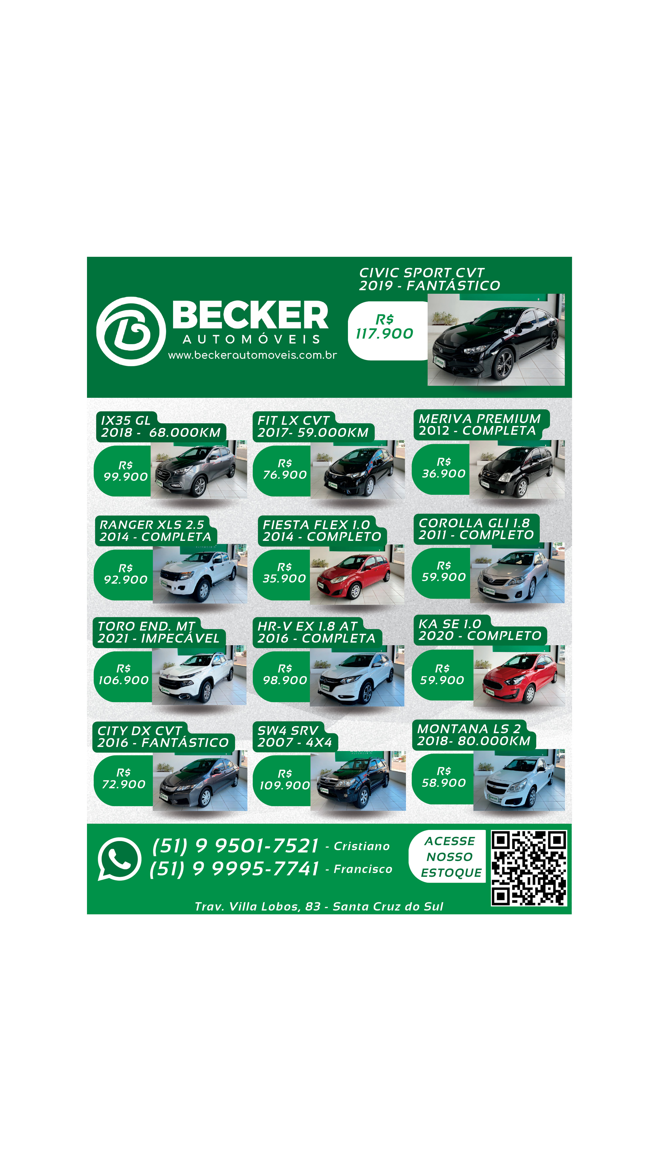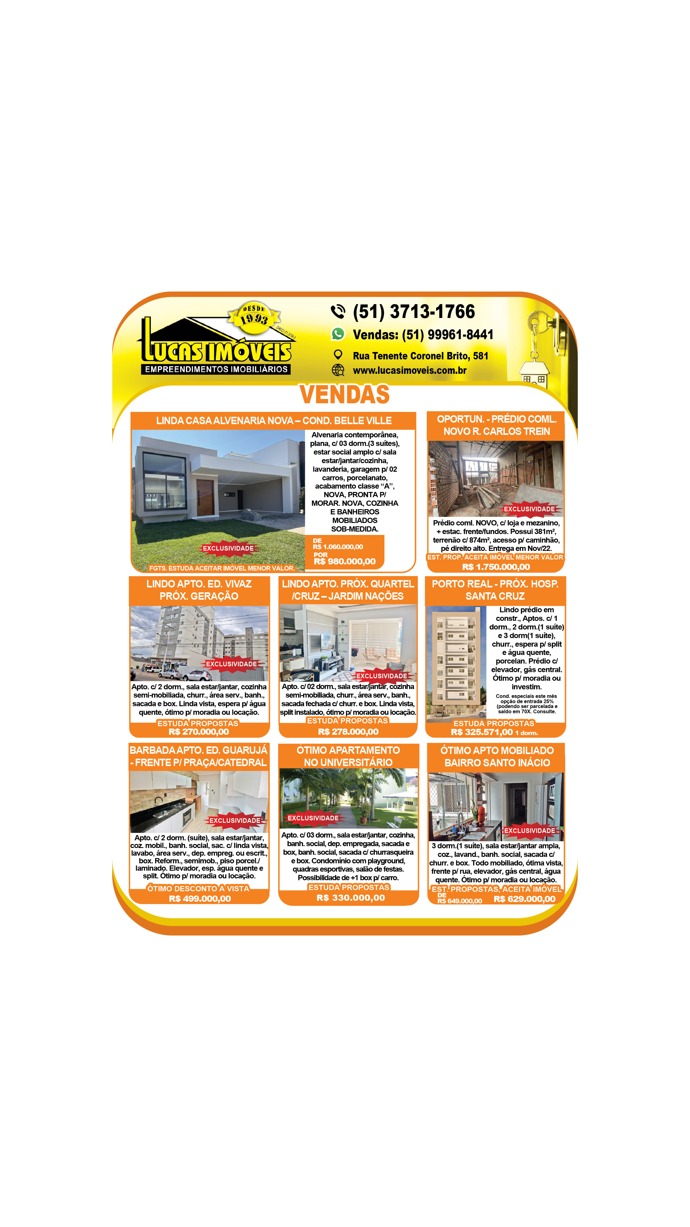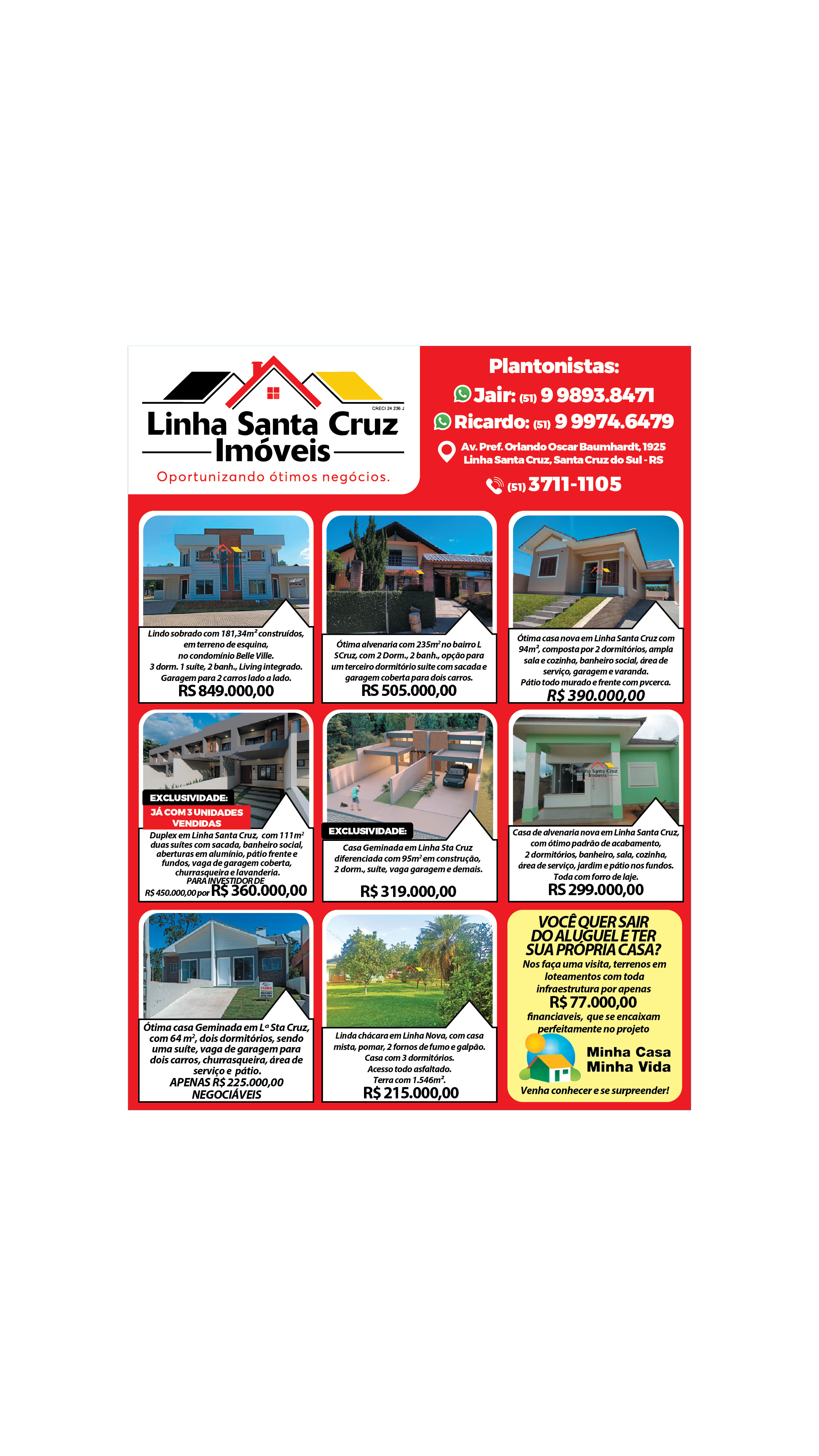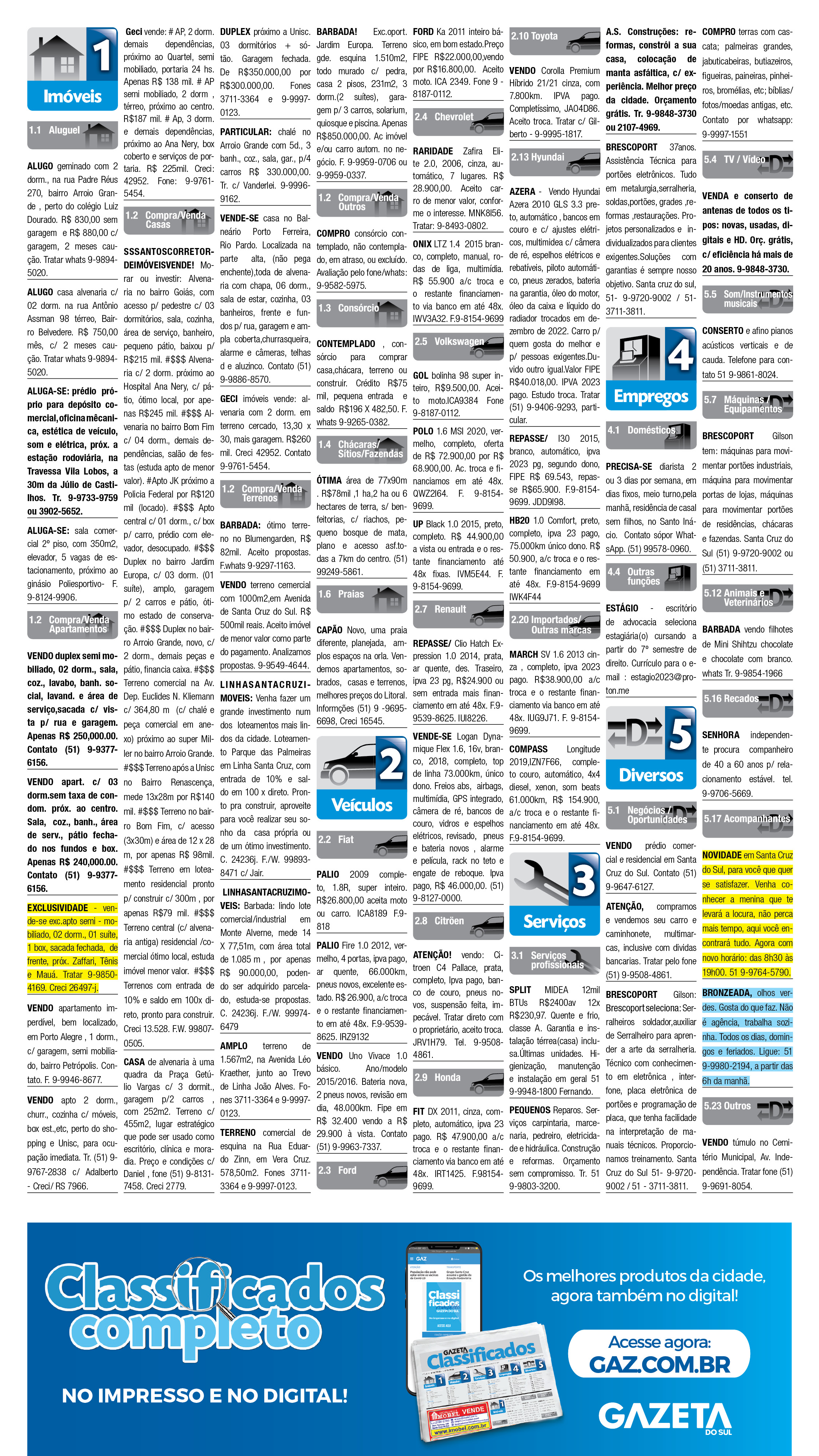 O suplemento de Classificados, que circula nas edições de terças, quintas e sábados, é um dos mais tradicionais da Gazeta do Sul, como vitrine e canal de negócios, de oferta, compra e venda em toda a região central do Rio Grande do Sul. E, para enriquecer pesquisas de produtos e serviços e possibilitar resultado ainda melhor a usuários e parceiros, nos anúncios de clientes cadastrados, o leitor tem acesso direto com link ao site do anunciante, onde poderá verificar mais detalhes sobre os itens. Confira as ofertas:
