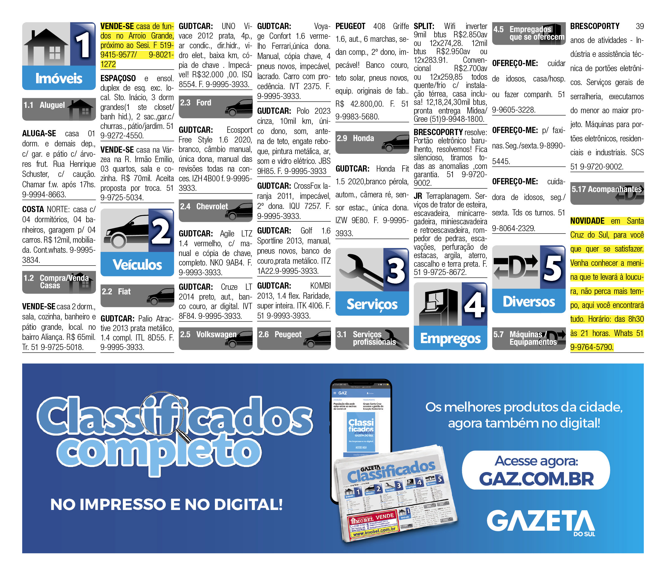 O suplemento de Classificados, que circula nas edições de terças, quintas e sábados, é um dos mais tradicionais da Gazeta do Sul, como vitrine e canal de negócios, de oferta, compra e venda em toda a região central do Rio Grande do Sul. E, para enriquecer pesquisas de produtos e serviços e possibilitar resultado ainda melhor a usuários e parceiros, nos anúncios de clientes cadastrados, o leitor tem acesso direto com link ao site do anunciante, onde poderá verificar mais detalhes sobre os itens. Confira as ofertas: