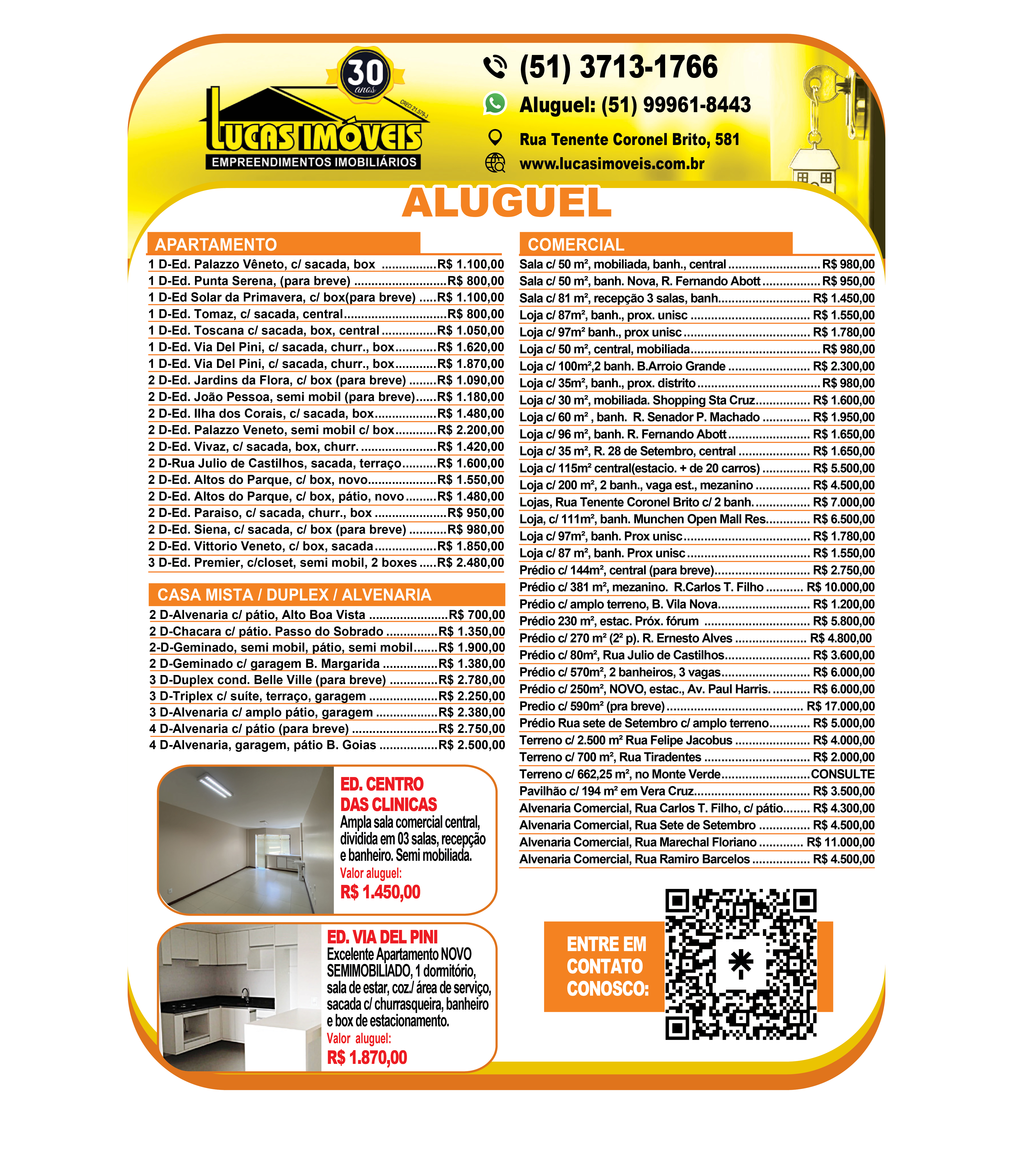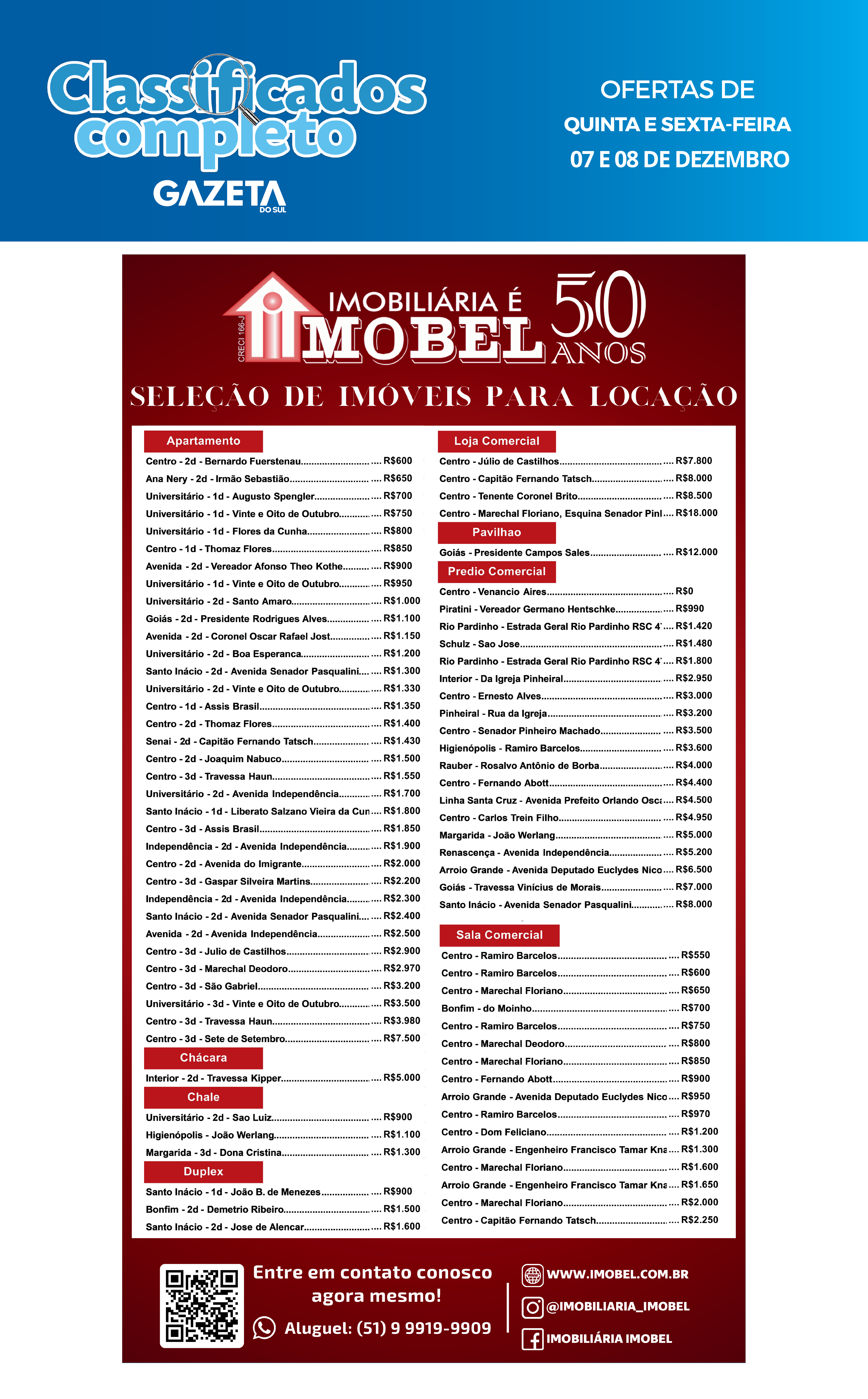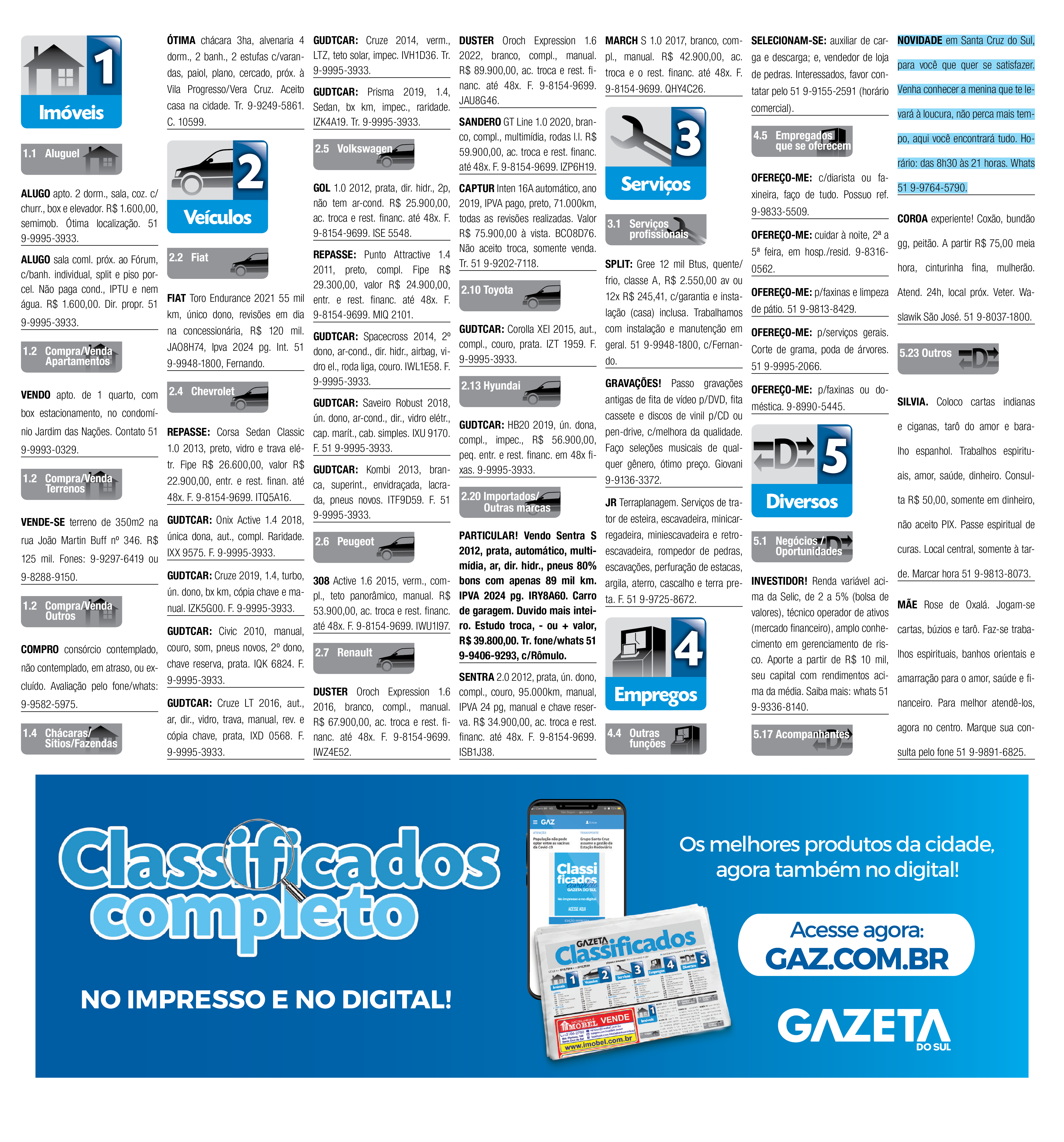 O suplemento de Classificados, que circula nas edições de terças, quintas e sábados, é um dos mais tradicionais da Gazeta do Sul, como vitrine e canal de negócios, de oferta, compra e venda em toda a região central do Rio Grande do Sul. E, para enriquecer pesquisas de produtos e serviços e possibilitar resultado ainda melhor a usuários e parceiros, nos anúncios de clientes cadastrados, o leitor tem acesso direto com link ao site do anunciante, onde poderá verificar mais detalhes sobre os itens. Confira as ofertas: